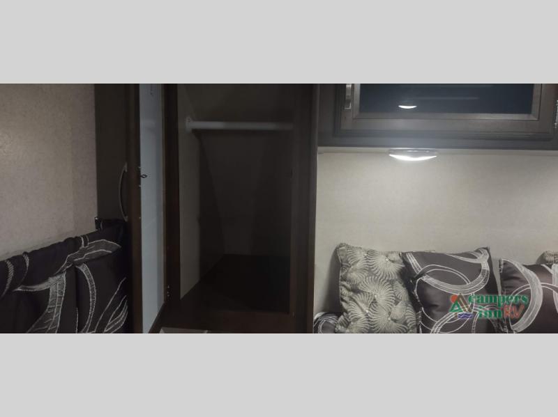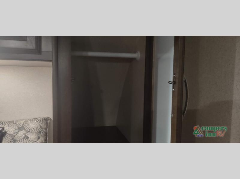 This “couples coach” is thoughtfully laid out to maximize space and function. From the moment you step through the rear entry door, you're greeted by a spacious rear bath and a bright, open interior. The front queen bed offers a cozy, private retreat, complete with wardrobe storage and a laundry chute for convenience.