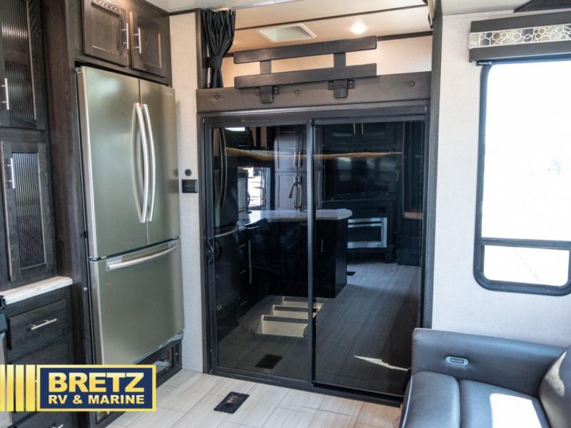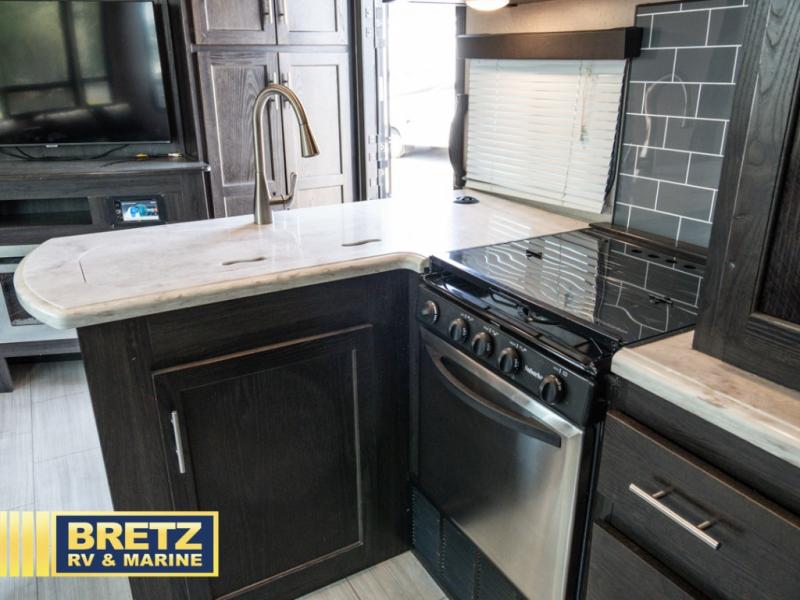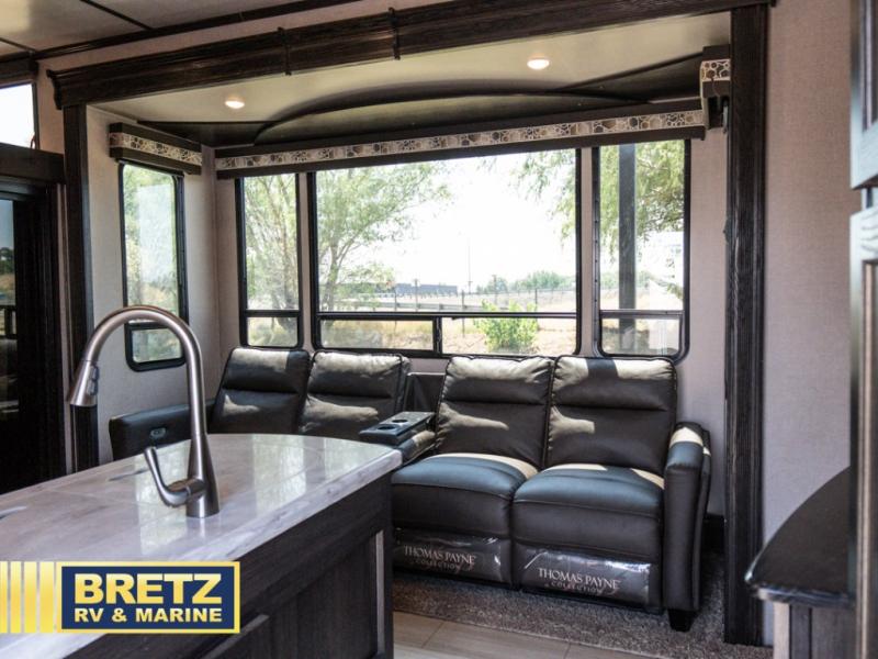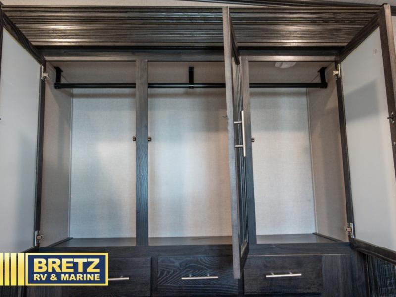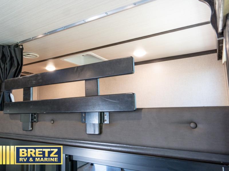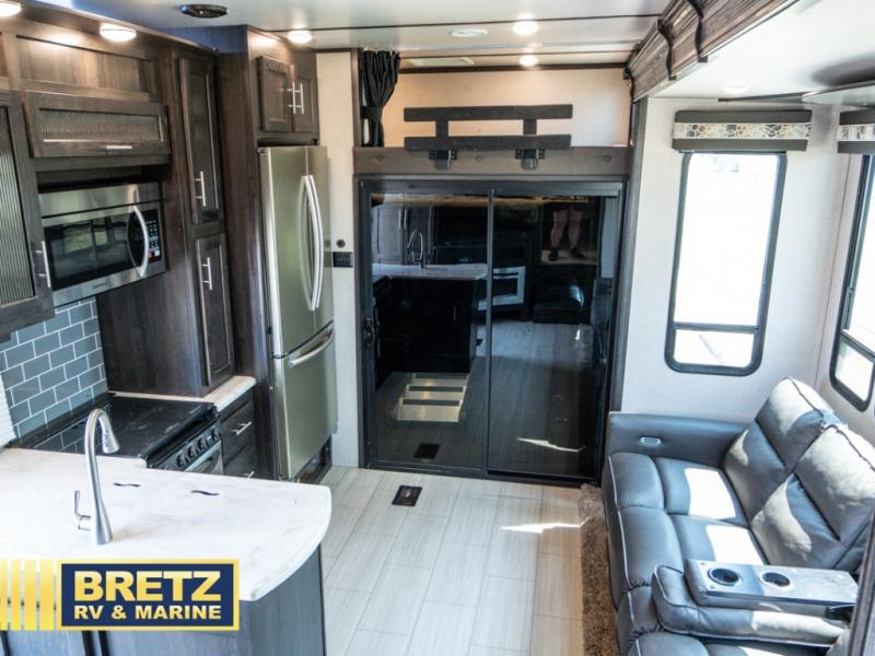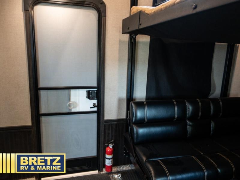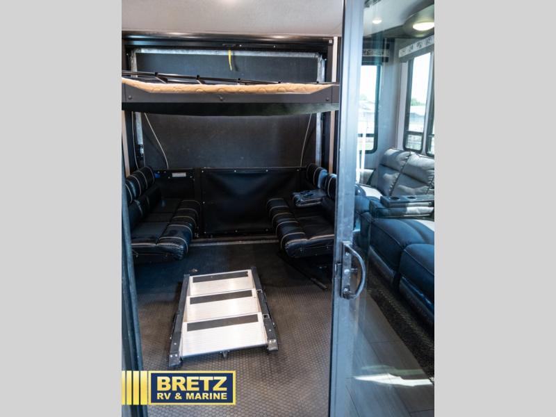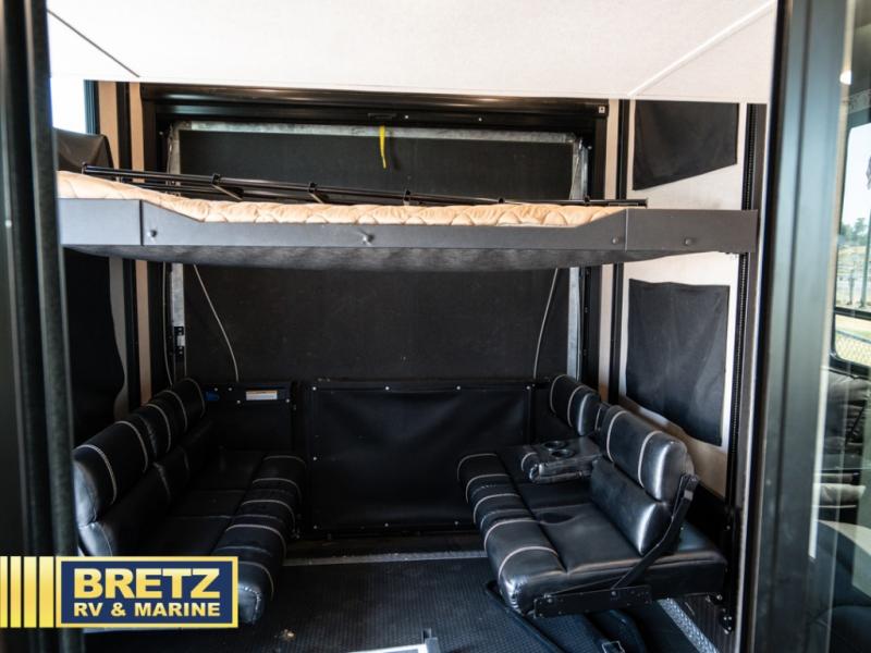 With 11' of cargo space on the XLR Thunderbolt 340AMP toy hauler fifth wheel, you can go just about anywhere and take along just about any off-road toy. This Forest River model features double slide outs, dual entry doors, a loft, king size bed, and plenty of space to enjoy your time away from home. The power recliner sofa can be used for regular seating during the day or transform it into an extra sleeping space at night. You can enjoy a cool breeze from outside without getting eaten up by pesky mosquitoes thanks to the patio door.