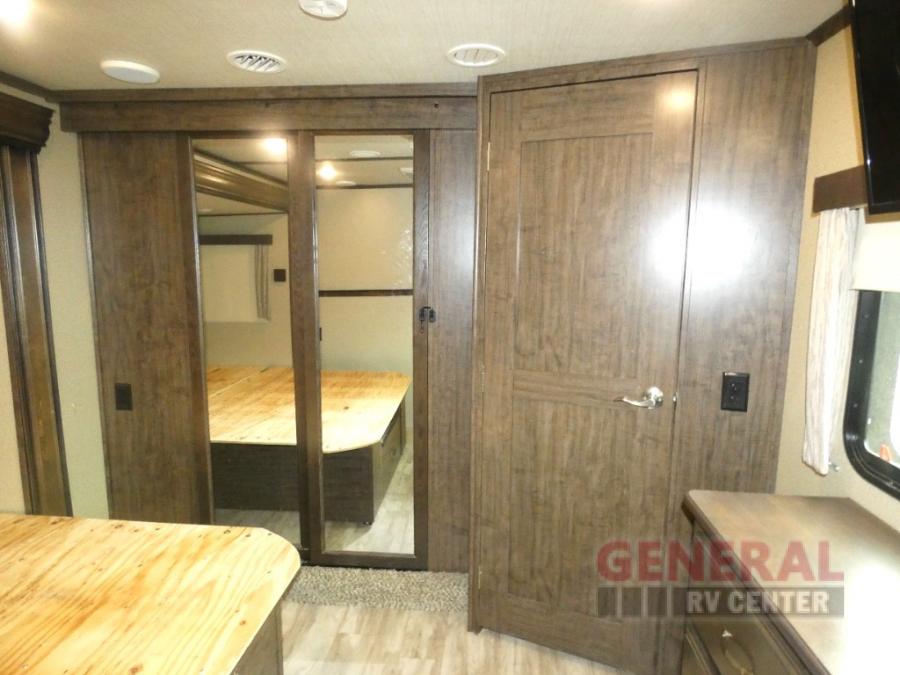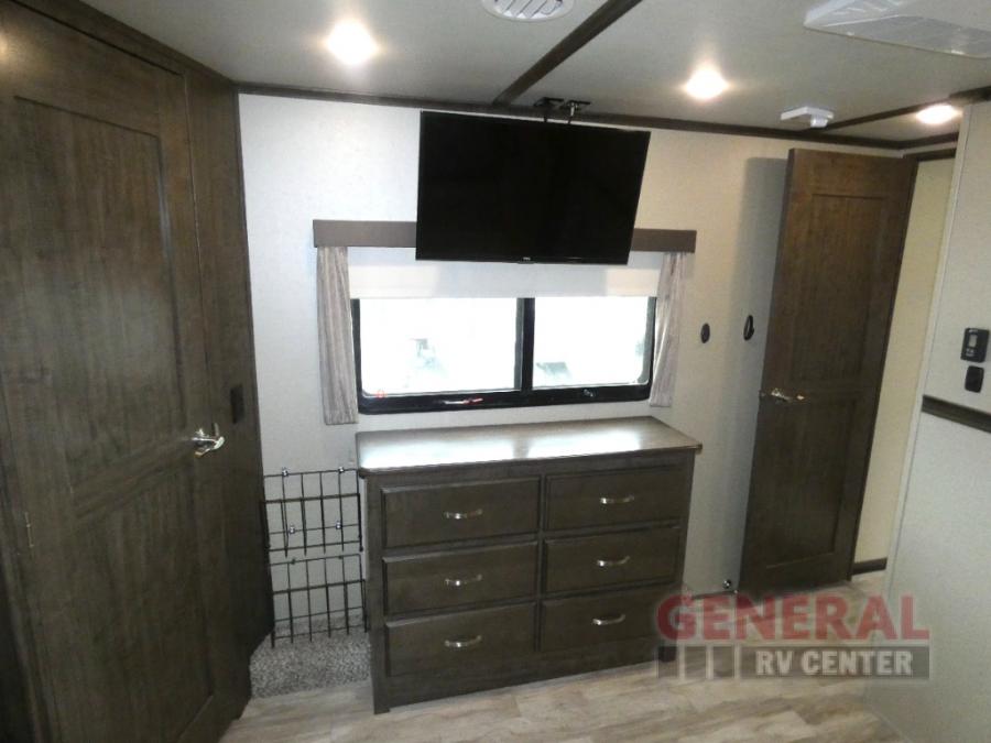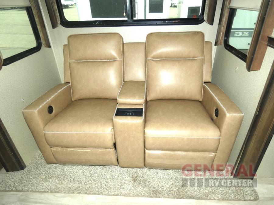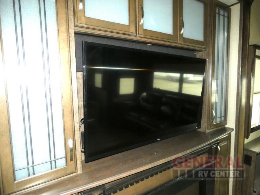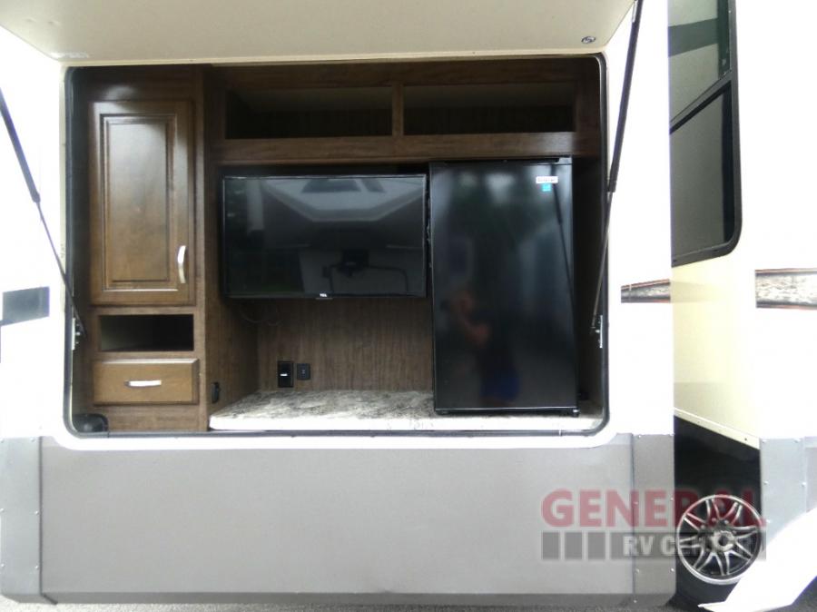 Outside enjoy an exterior LED TV and refrigerator to keep cold drinks handy. You will also love the unobstructed pass-through storage compartment for all of your outdoor camping items, plus universal docking station, and so much more!