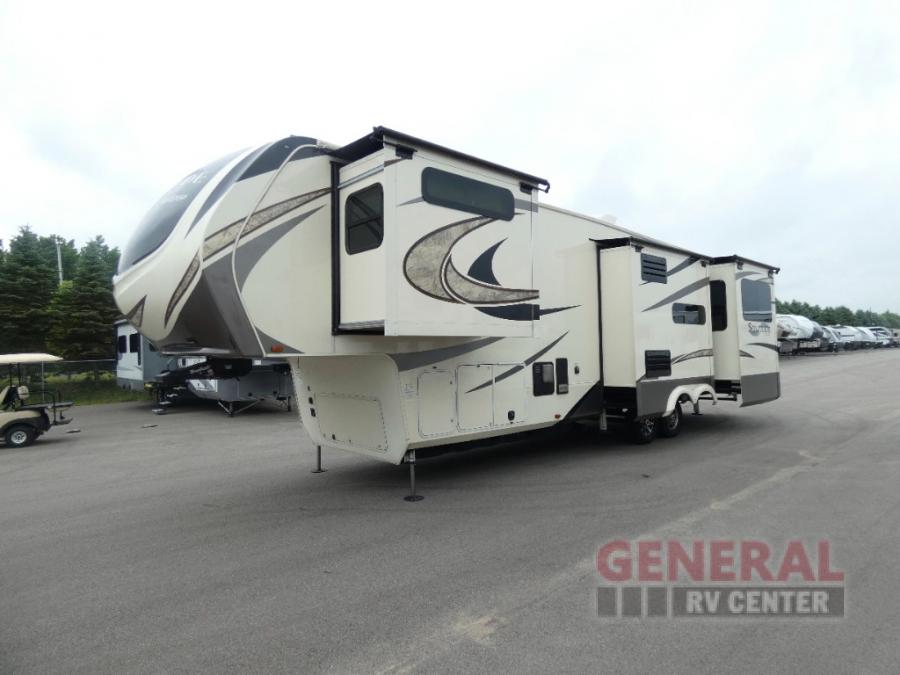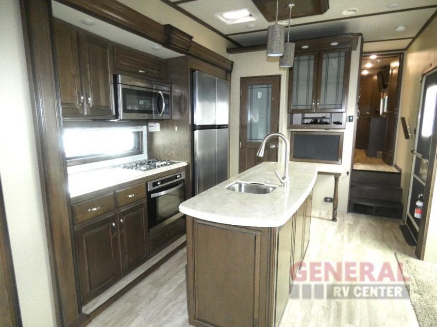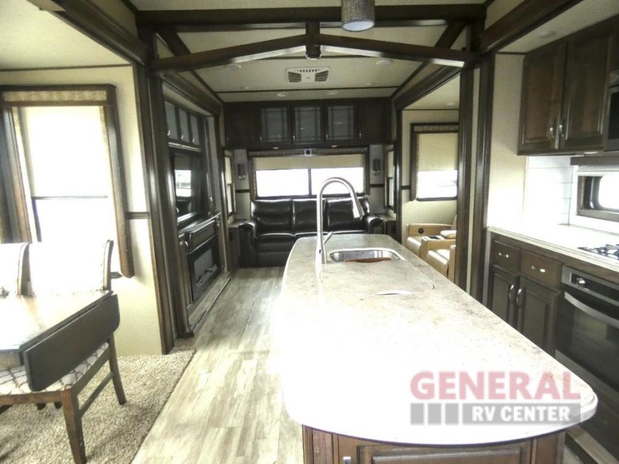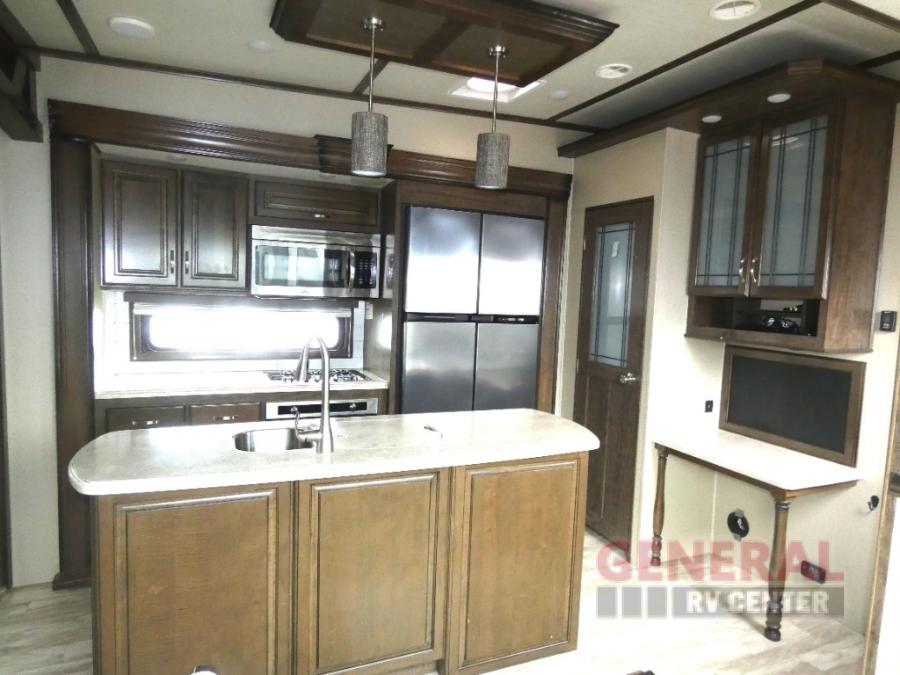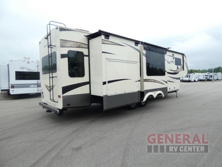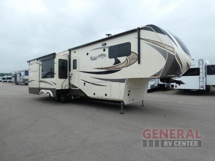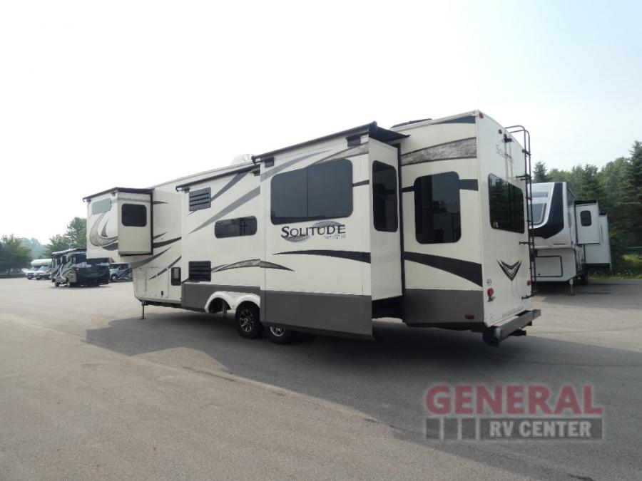 You will find it easy to extend your stay awhile in this Grand Design Solitude fifth wheel model 360RL. This unit features all of the amenities of home including a spacious kitchen with an 18 cu. ft. refrigerator, a kitchen island, an entertainment center with fireplace, and private front master bedroom, plus more!