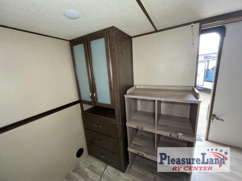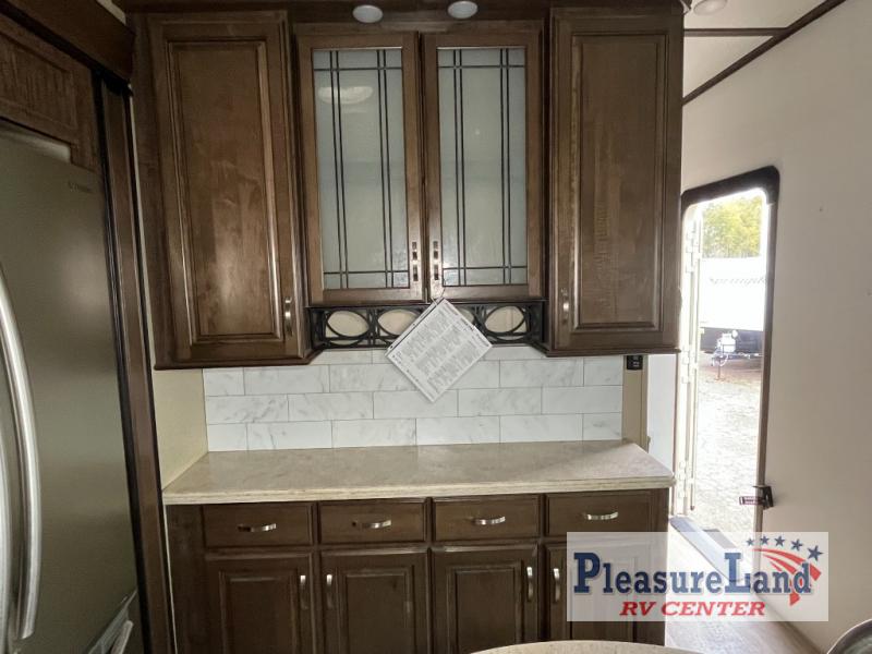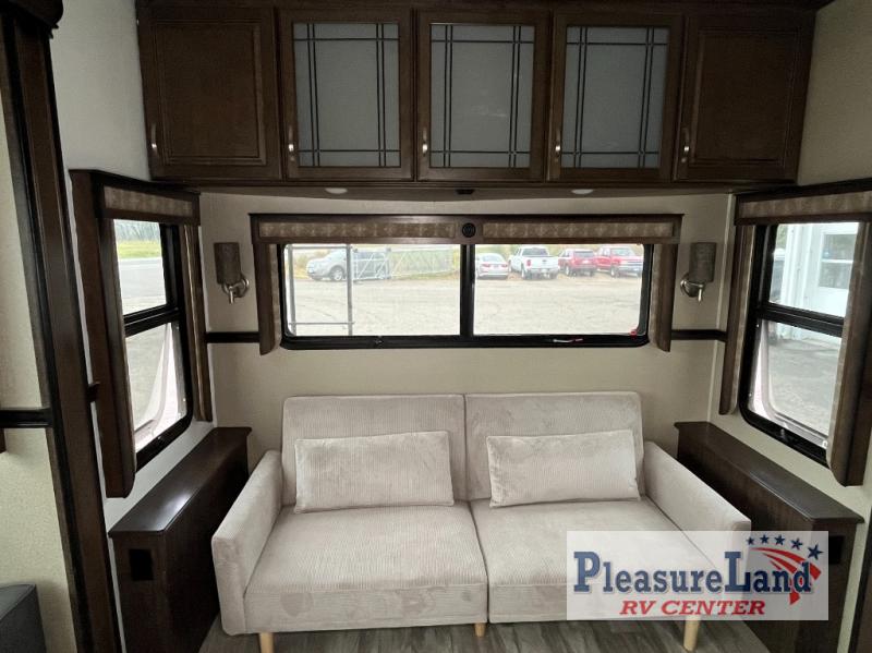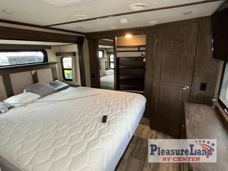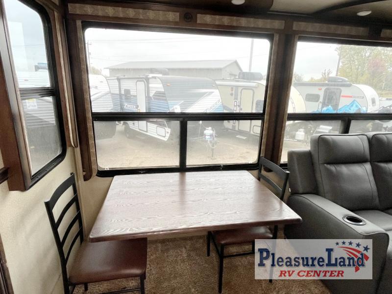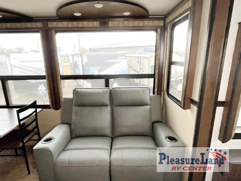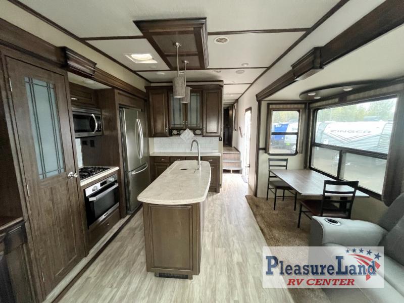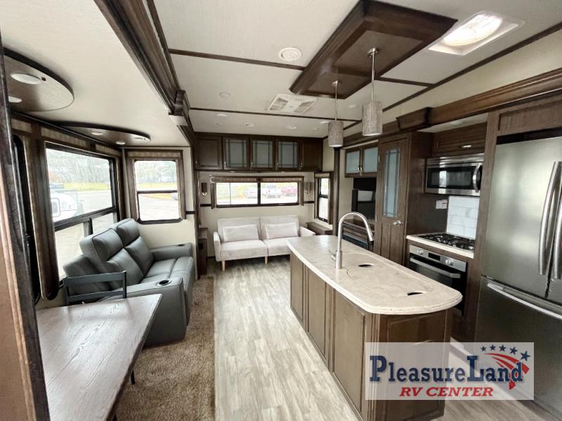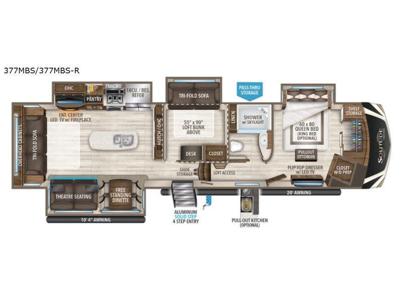 If you have been searching for a fifth wheel with an extra living room that can be utilized as an office or even a bedroom then look no further, this Solitude 377MBS R fifth wheel may complete your checklist. The extra living room provides a desk, storage, and a seating area, plus a loft above for even more sleeping space. The front master bedroom provides the perfect bedding, storage for all your clothing, and a TV, plus more! The cook will surely love making meals with the professional grade stainless steel cooktop, built-in oven and convection microwave. The popular kitchen island, stainless steel 18 cu. ft. residential refrigerator, and large pantry allow you to stock up on food and wash dishes while visiting with your guests. The buffet adds additional counter space to serve food or place your keys and things. You might even decide to add a few options such as a washer and dryer to keep your clothes clean the whole time, a king size bed for more sleeping surface, or even a pull-out kitchen to make meals outdoors. There are many features and plenty of space for everyone!