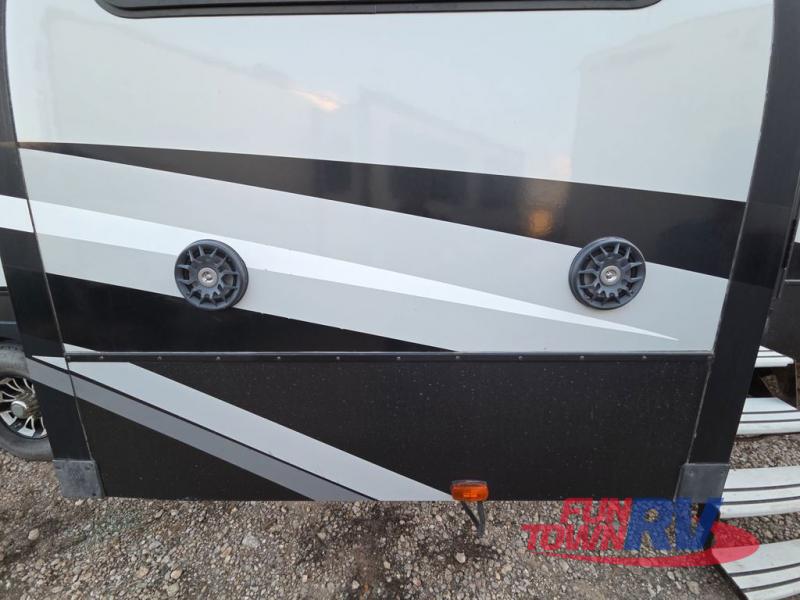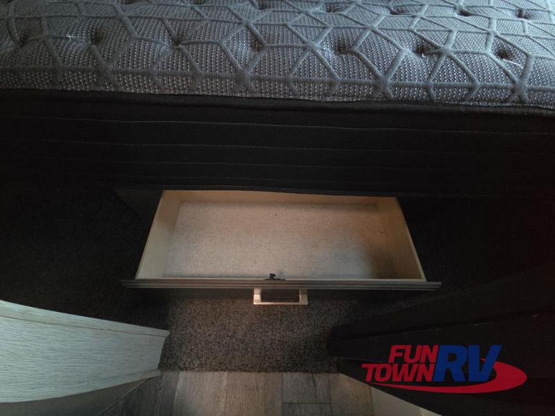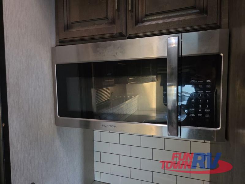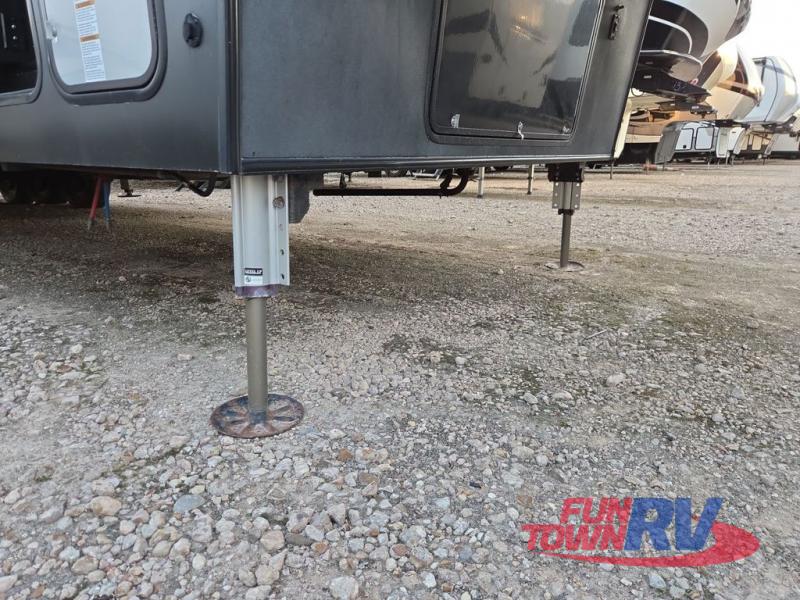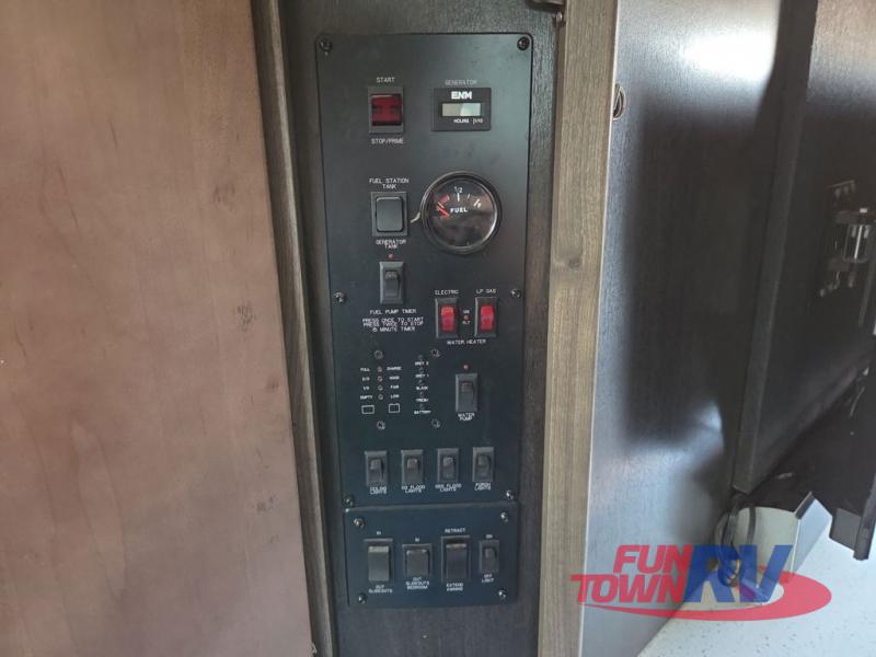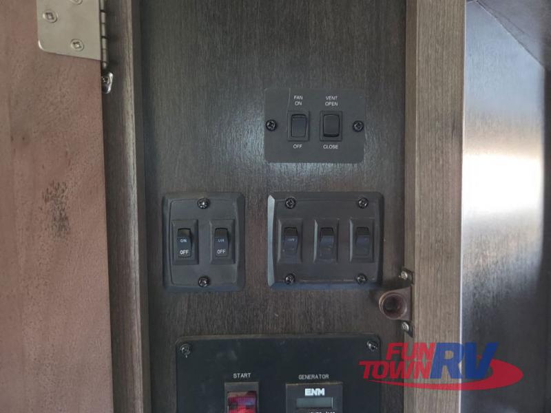 The Cyclone toy hauler fifth wheels by Heartland RV are not your ordinary toy hauler. These models have beautiful cabinets and plenty of comforts throughout such as high quality residential furniture, a 55” LCD HDTV flat screen TV, cable TV and satellite hook-ups, plus a separate DVD/CD/MP3 Bluetooth stereo for the garage and exterior. Along the exterior there are stunning graphics and you will enjoy the view out of the large bedroom picture windows. The two side awnings with LED lights provide plenty of shade during the day, and at night you can grab a snack, your camp chair, and enjoy visiting outdoors just a bit longer. The ultra-light ramp door allows you to easily load your off road toys. In the garage you will also find an electric rear screen, decorative chair rail, plus built-in overhead cabinets with an entertainment center and more! You may even want to add the S5 Package which includes a 2nd fuel cell, 40" garage TV, solid surface counter top in the bedroom, central vacuum, 32" bedroom TV, and upgraded furniture with USB ports and built-in tables.