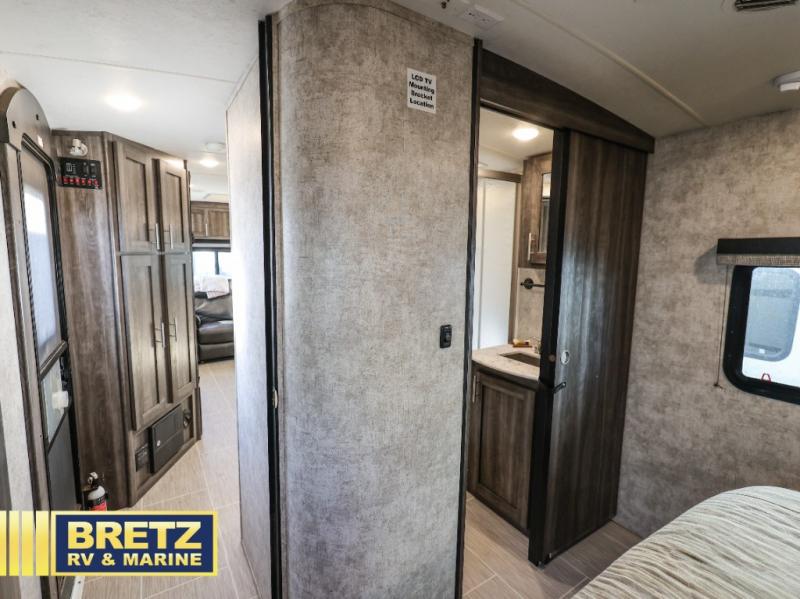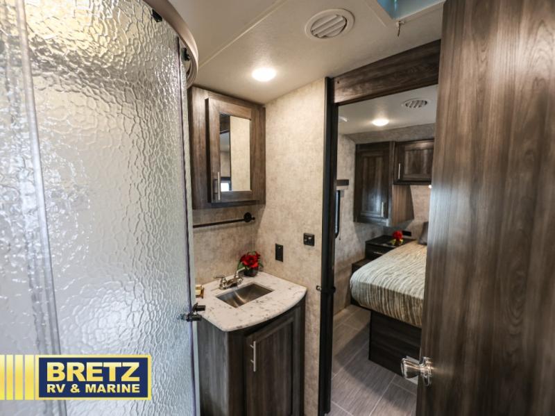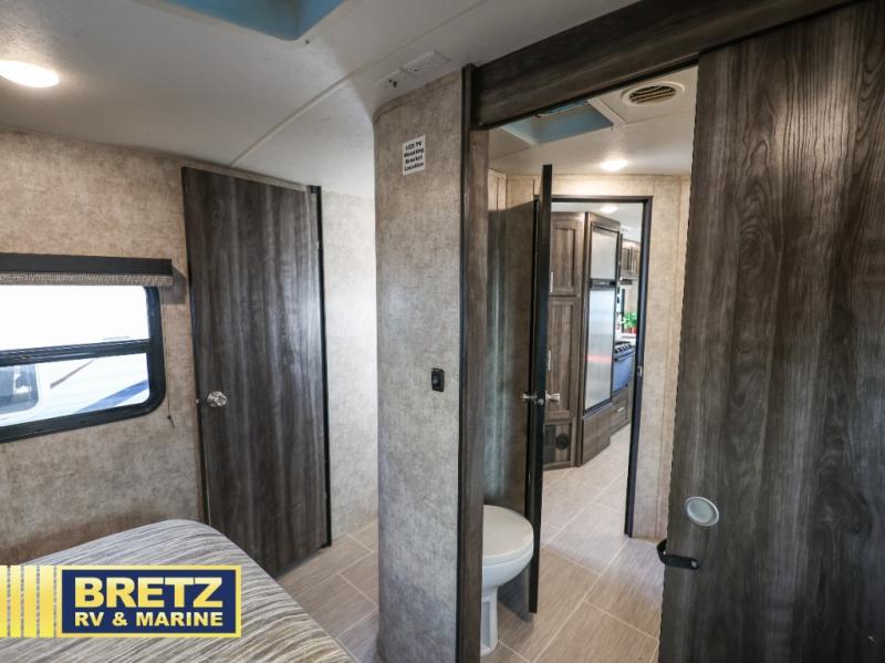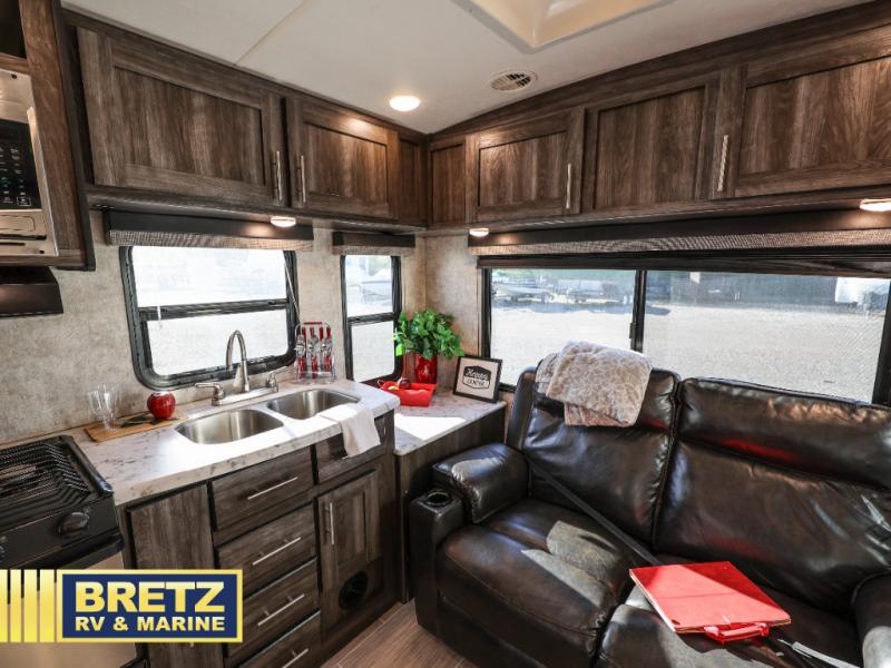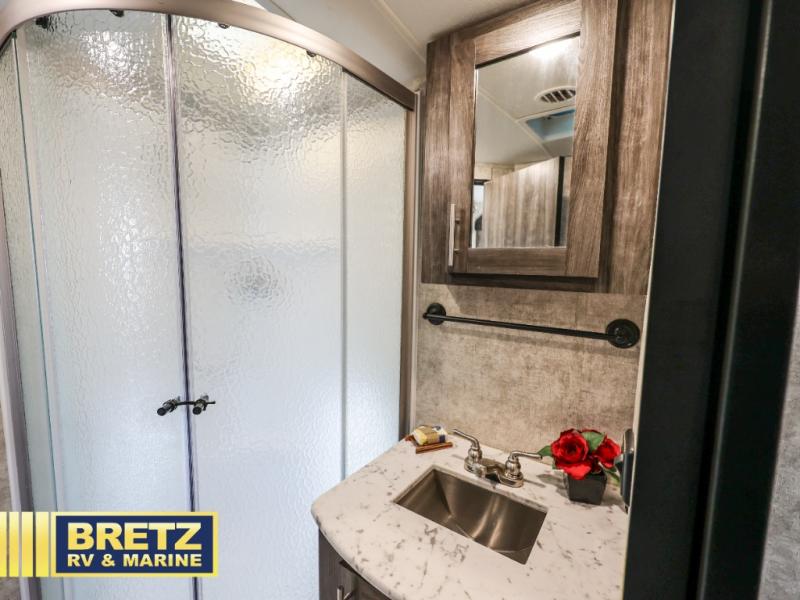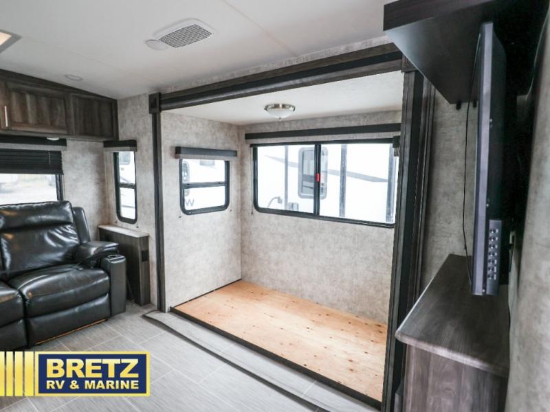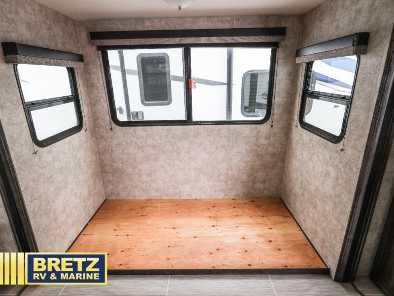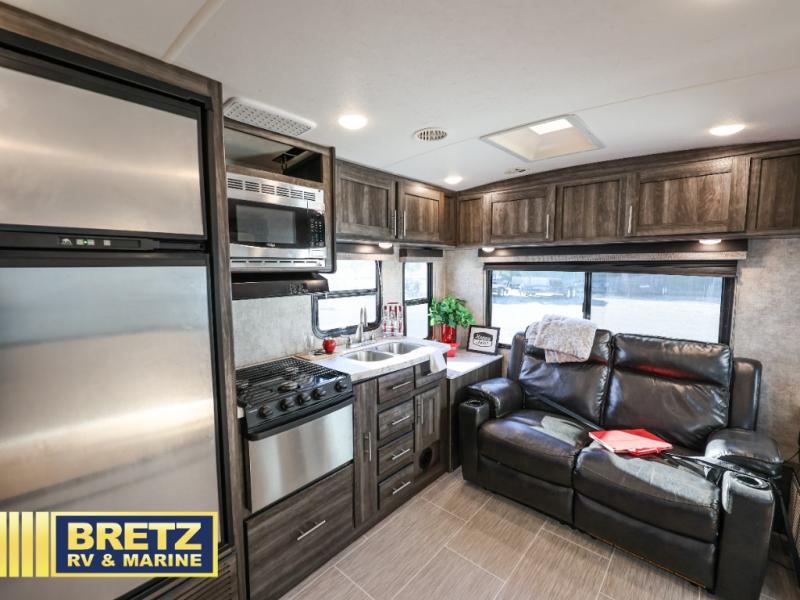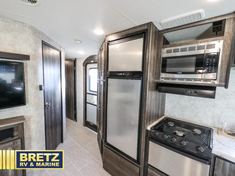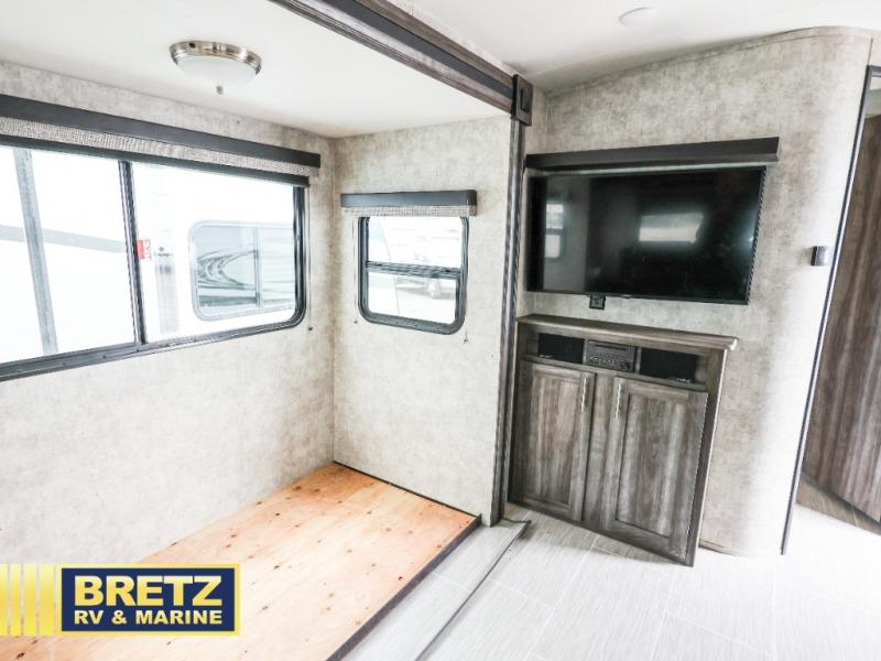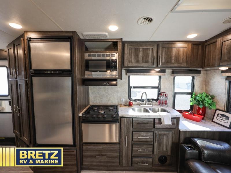 The combined kitchen and living area is in the rear of this trailer. Near the door there is a pantry and a refrigerator. Fix your meals on the three burner range, and easily clean up at the double kitchen sink. Along the rear wall there is theater seats for two. The u-dinette is on a slide which helps to open up the floor space. You can enjoy meals at the dinette during the day, and at night convert this area into additional sleeping space. There is also a TV along the interior wall for your enjoyment.