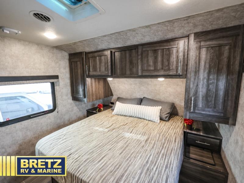 In the front room you will find a queen convertible bed with extension, two wardrobes for your hanging clothes, nightstands, and overhead cabinetry.
