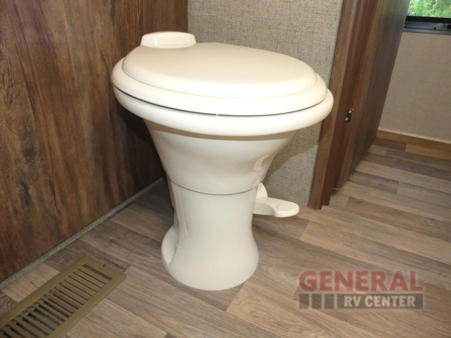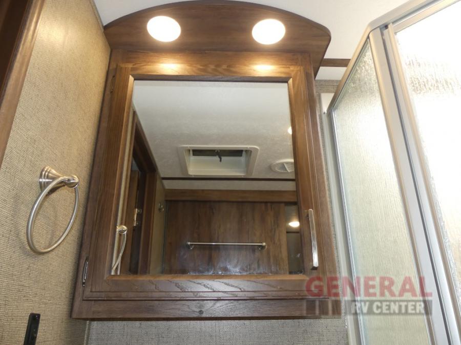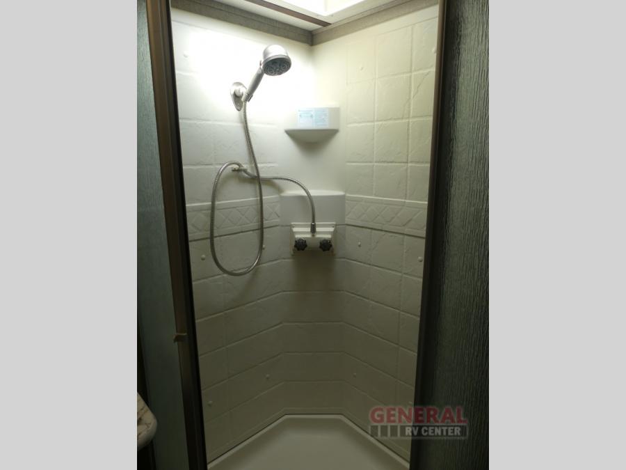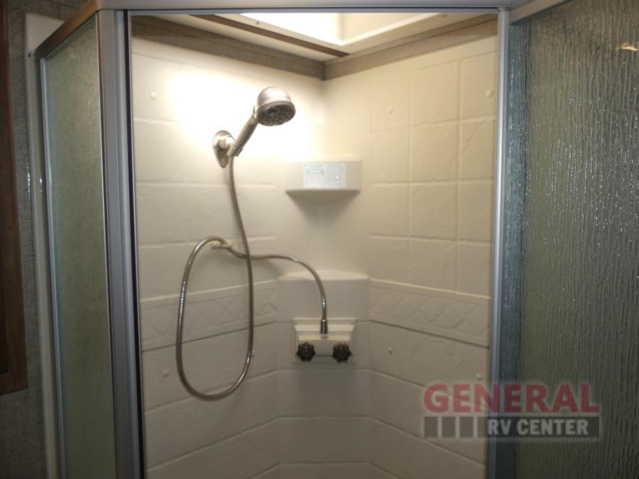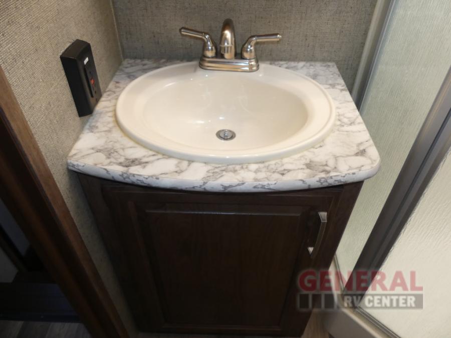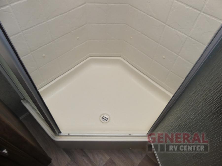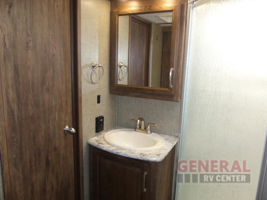 Step up to the bathroom and bedroom area. The side aisle bathroom is on your left. Inside the bathroom you will find a sink, medicine cabinet, neo-angled shower, and a toilet. There is a sliding door that separates the bathroom from the bedroom.