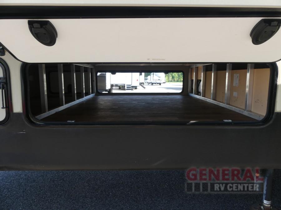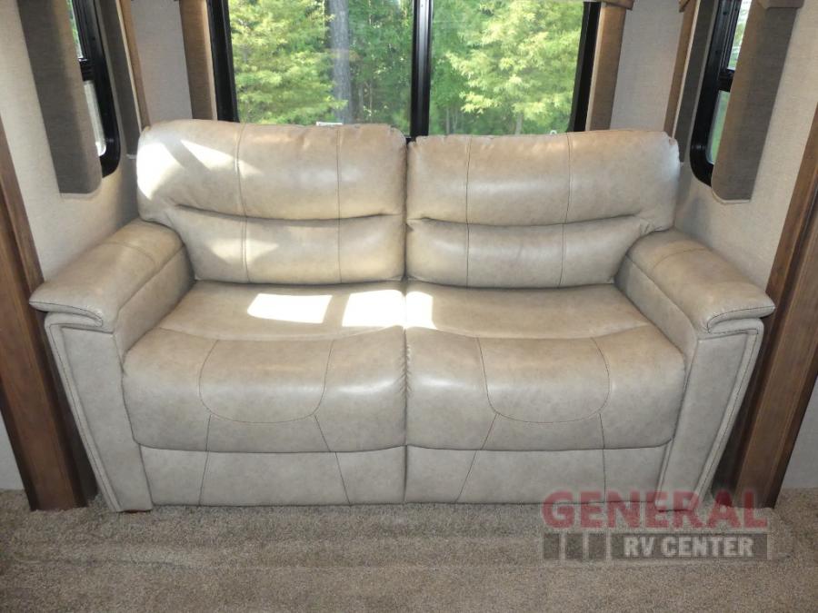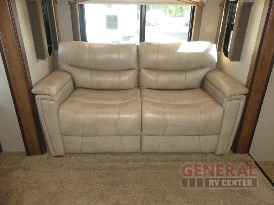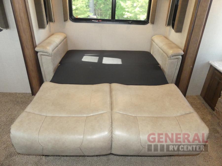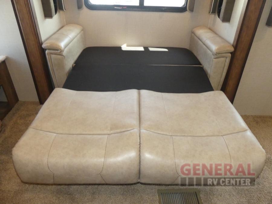 Located in the rear of this model is the living area. Here you will find dual opposing slides with tri-fold sleeper sofas and overhead cabinets.