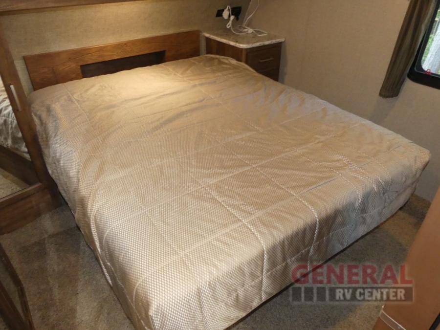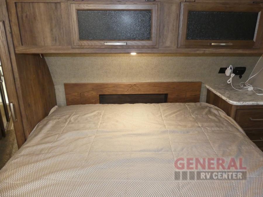 In the bedroom there is a queen bed, nightstand, wardrobe, overhead storage, and a slide with a wardrobe and linen cabinet. You can also access the linen cabinet from the bathroom.