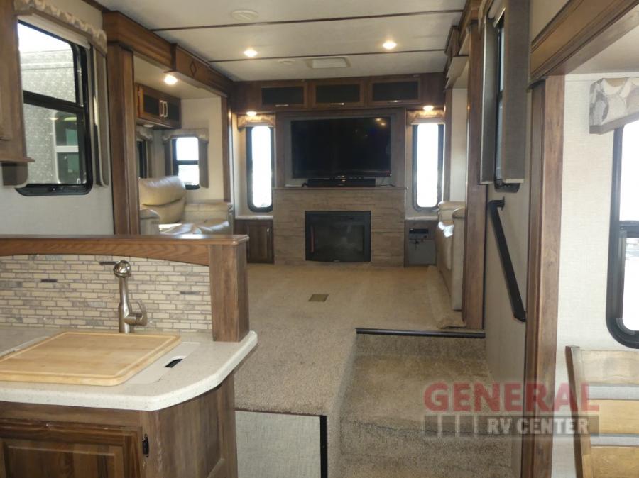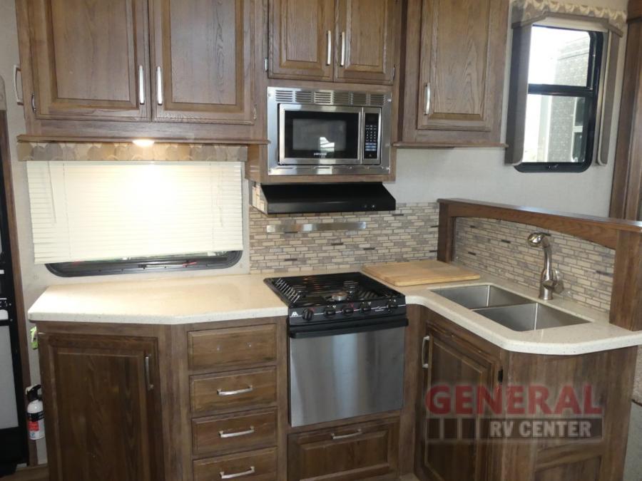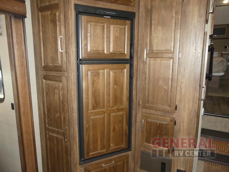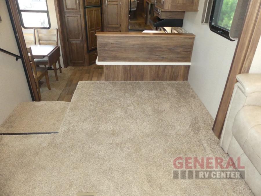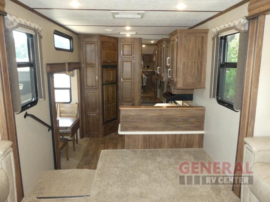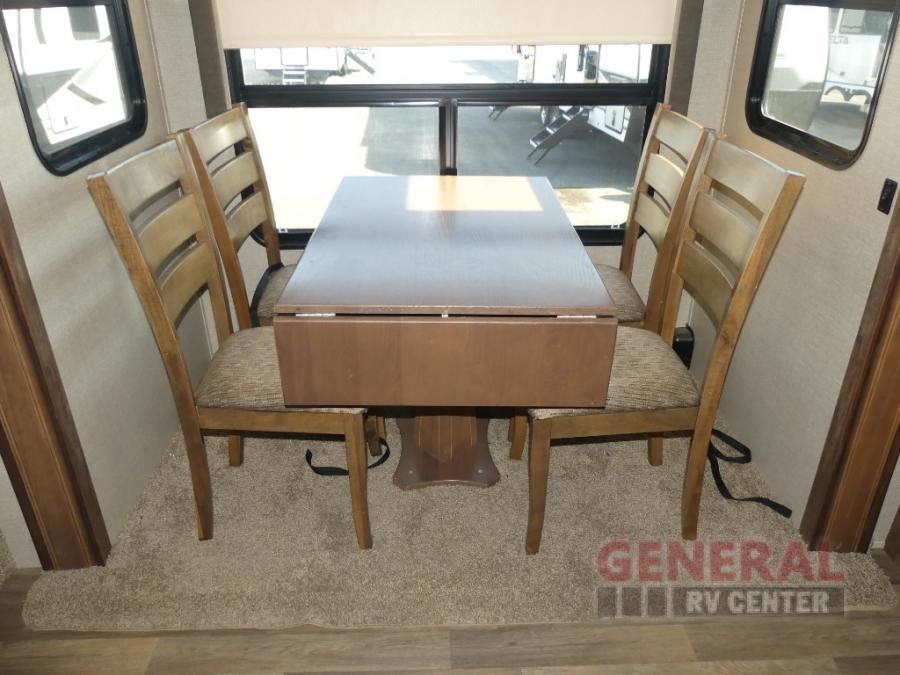 As you enter the fifth wheel, to your left there is counter space for food prep, overhead cabinets, three burner range, and double kitchen sink. On the opposite side the road side slide has a free-standing dinette. Adjacent to the slide there is a pantry, refrigerator, and an additional pantry.
