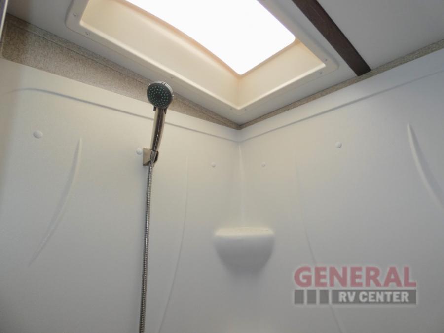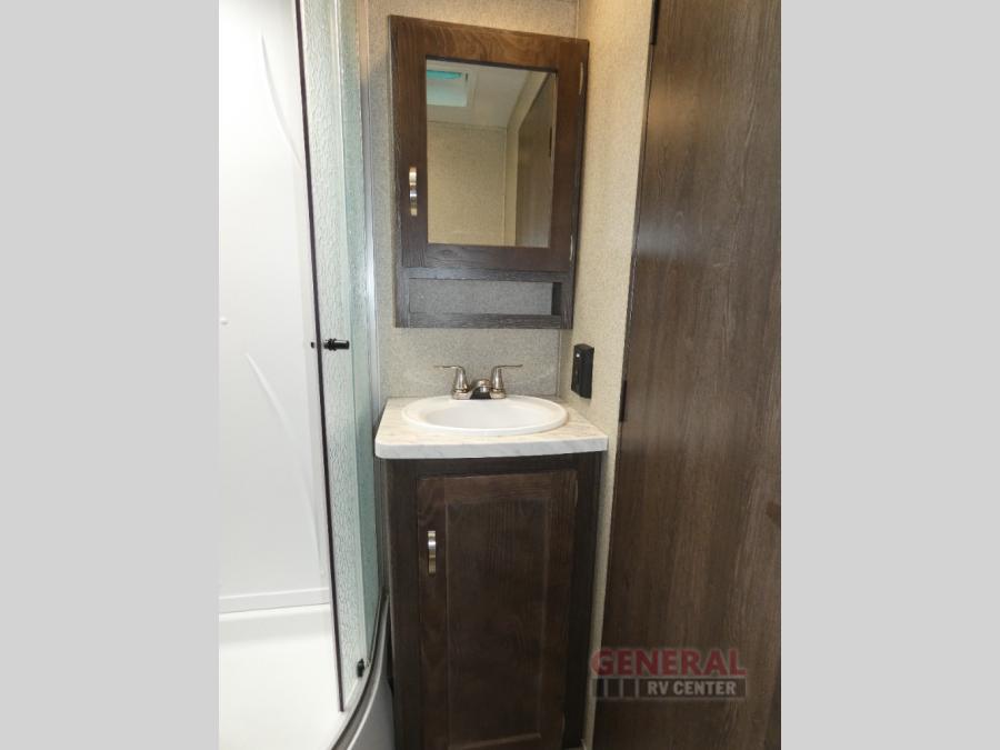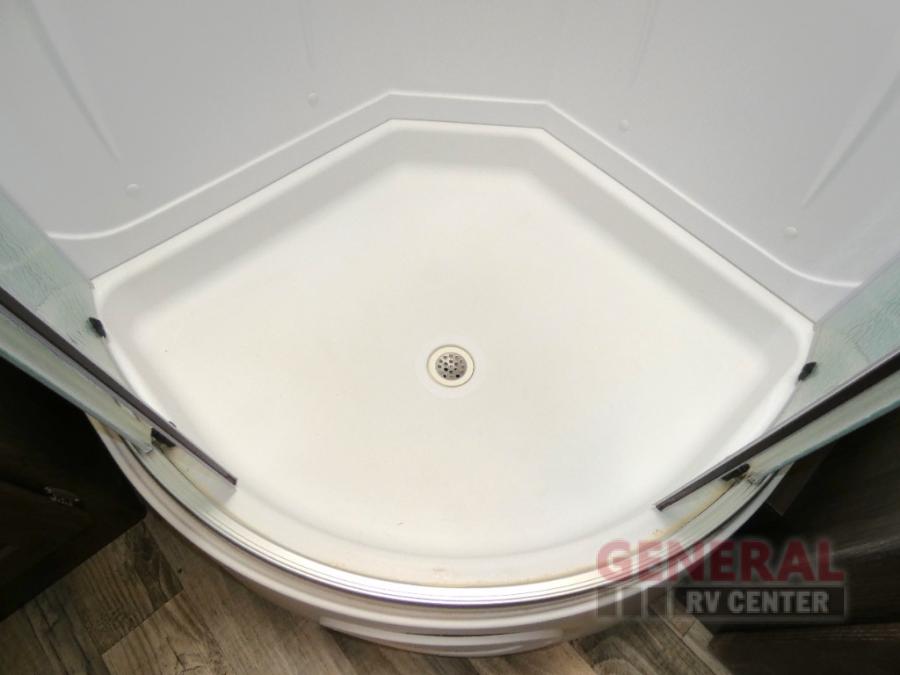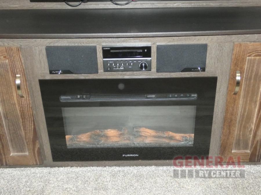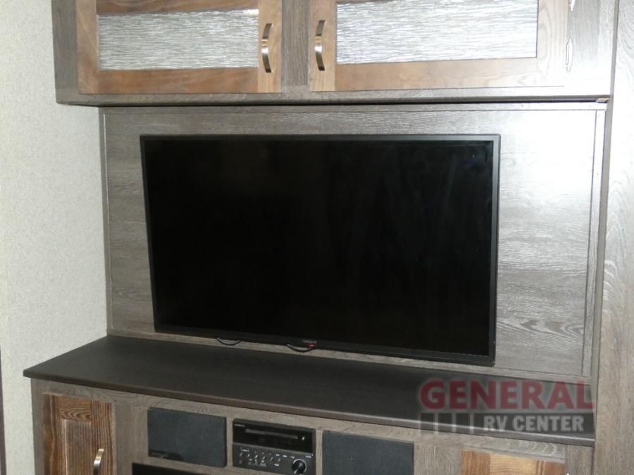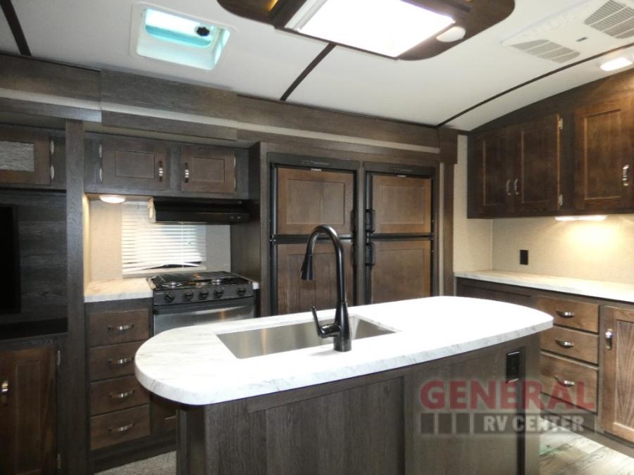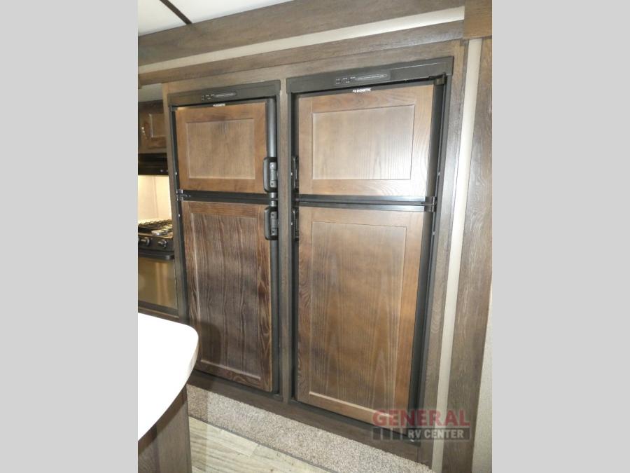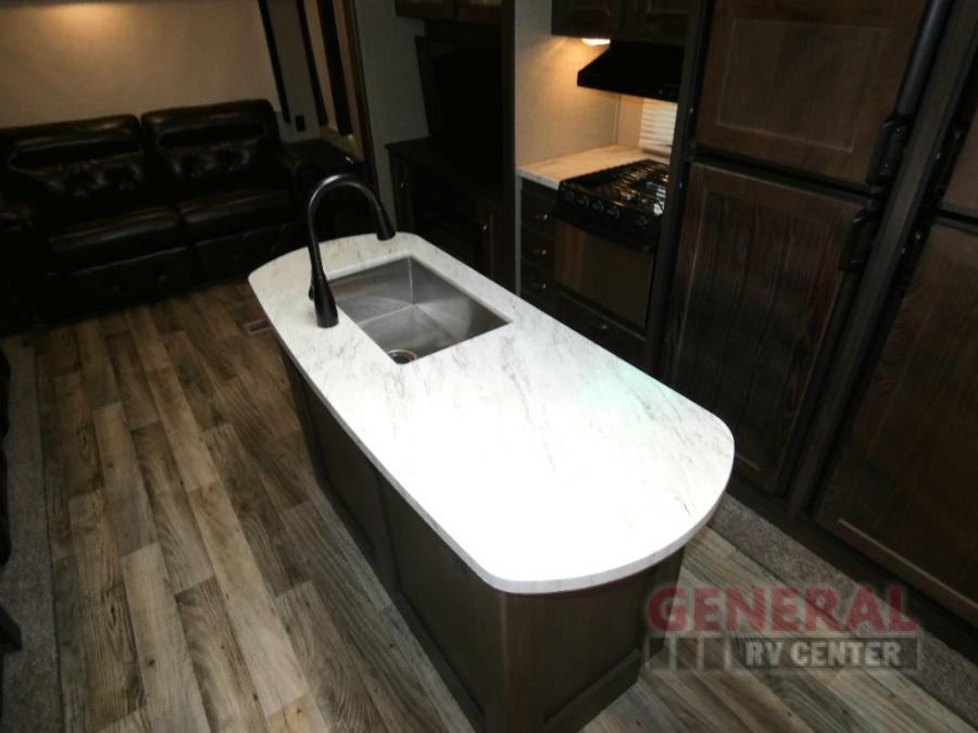 The slide opposite has TWO refrigerators, a three burner range, overhead cabinets, and an entertainment center. Along the rear wall there is a sofa sleeper with end tables and more overhead storage. In the middle of the kitchen you will find an island with a kitchen sink and extra counter and storage space. Straight in from the entry door you can store your dry goods in the large pantry along the interior wall.