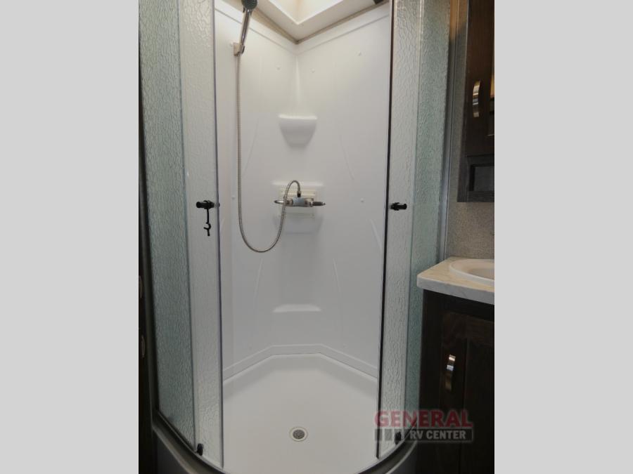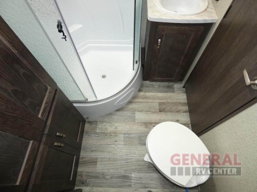The side aisle bathroom has a linen cabinet, radius shower, sink, and toilet.