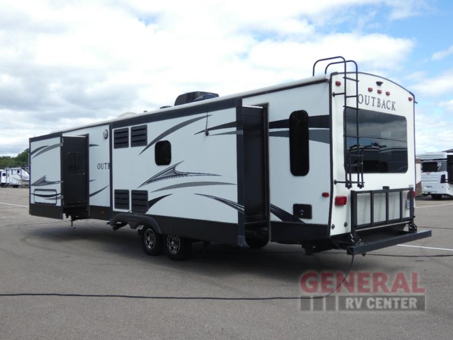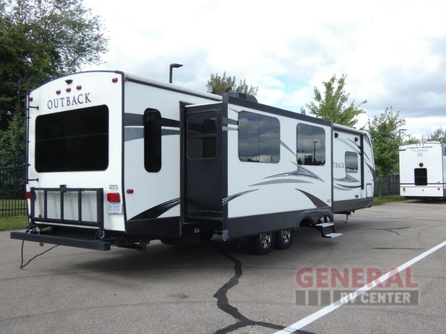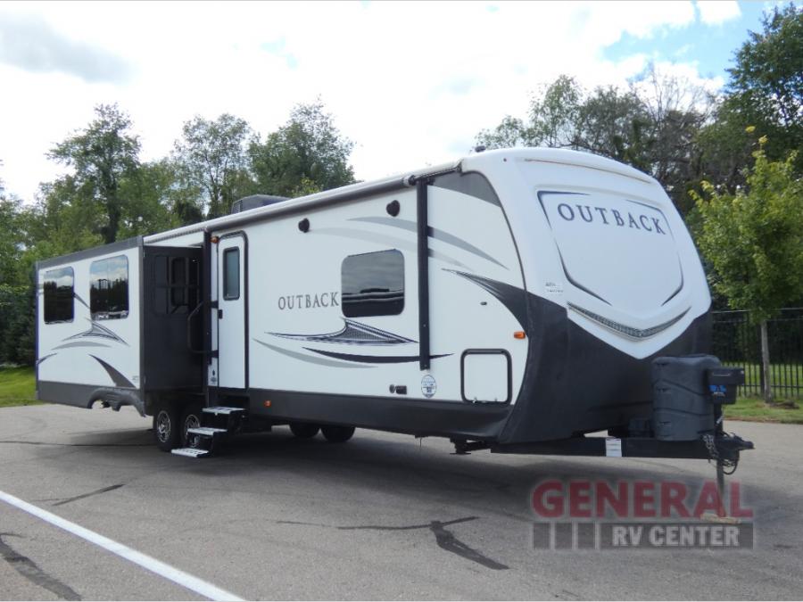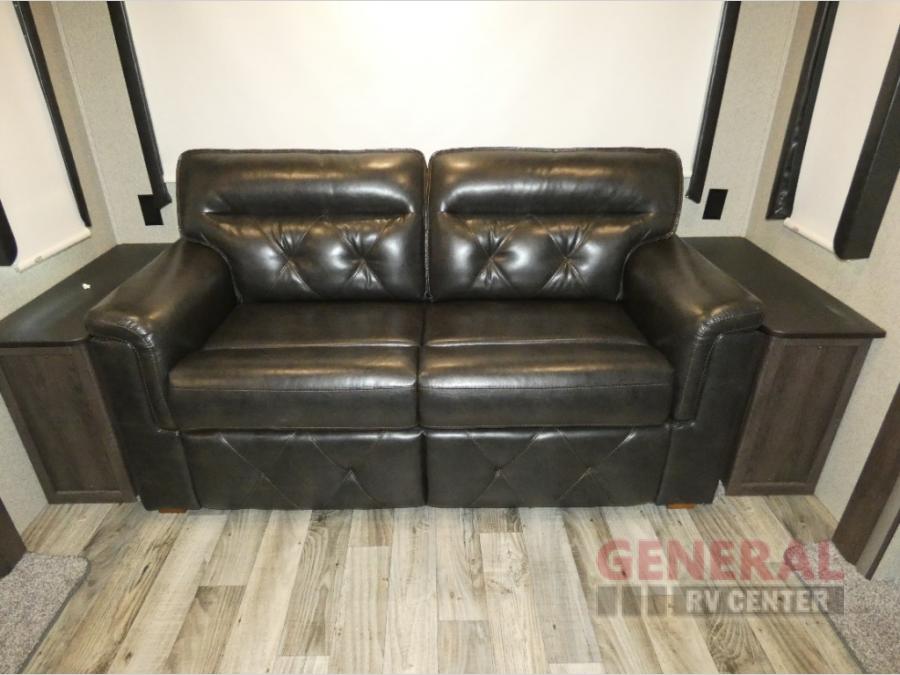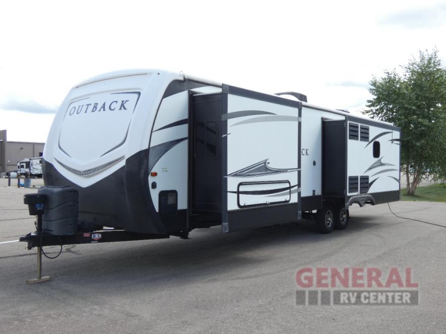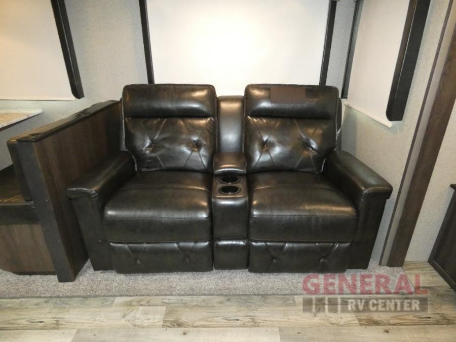 As you enter this Outback Super Lite travel trailer 328RL you will find dual opposing slides in the main living area which help to open up the floor space. The slide to the left has a dinette where you can enjoy your meals during the day and at night the dinette converts into a bed. There are also two theater seats with cupholders and an overhead cabinet.
