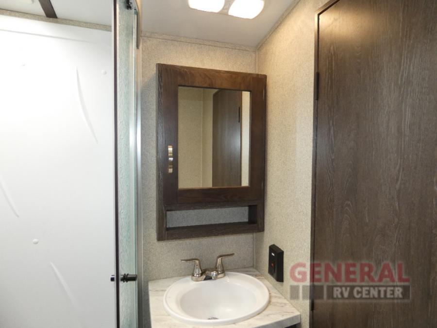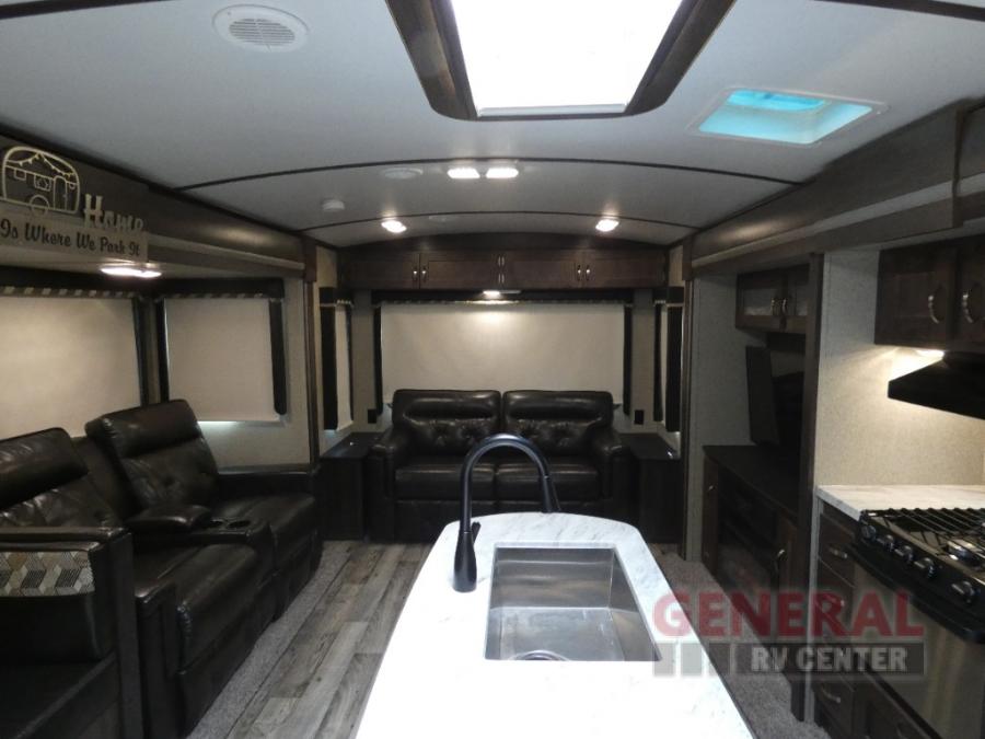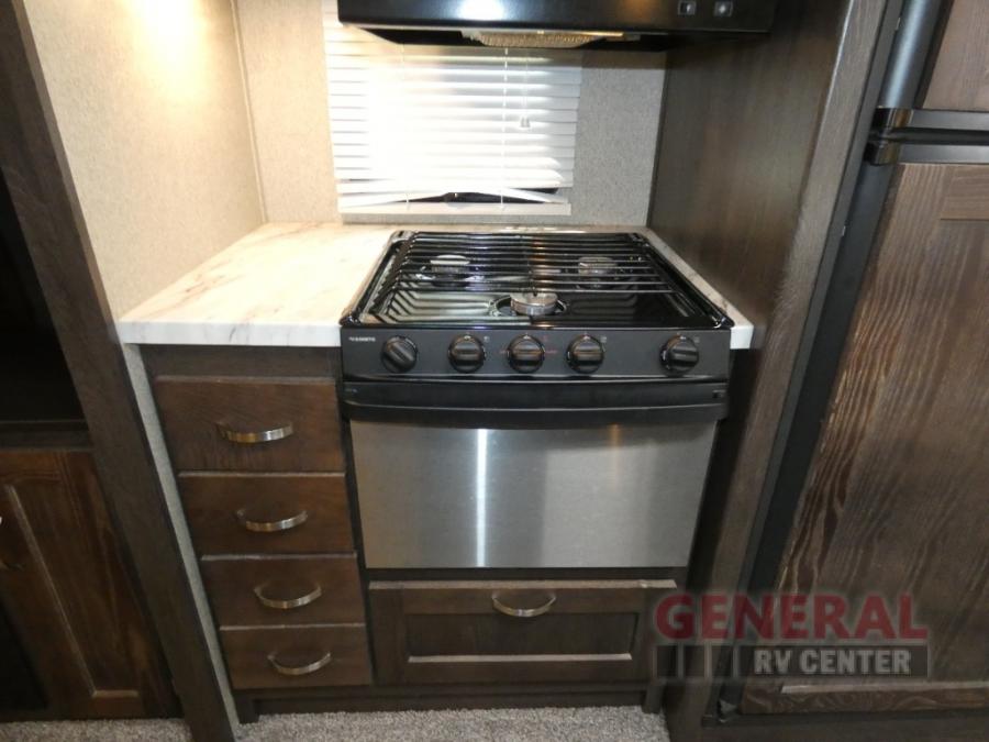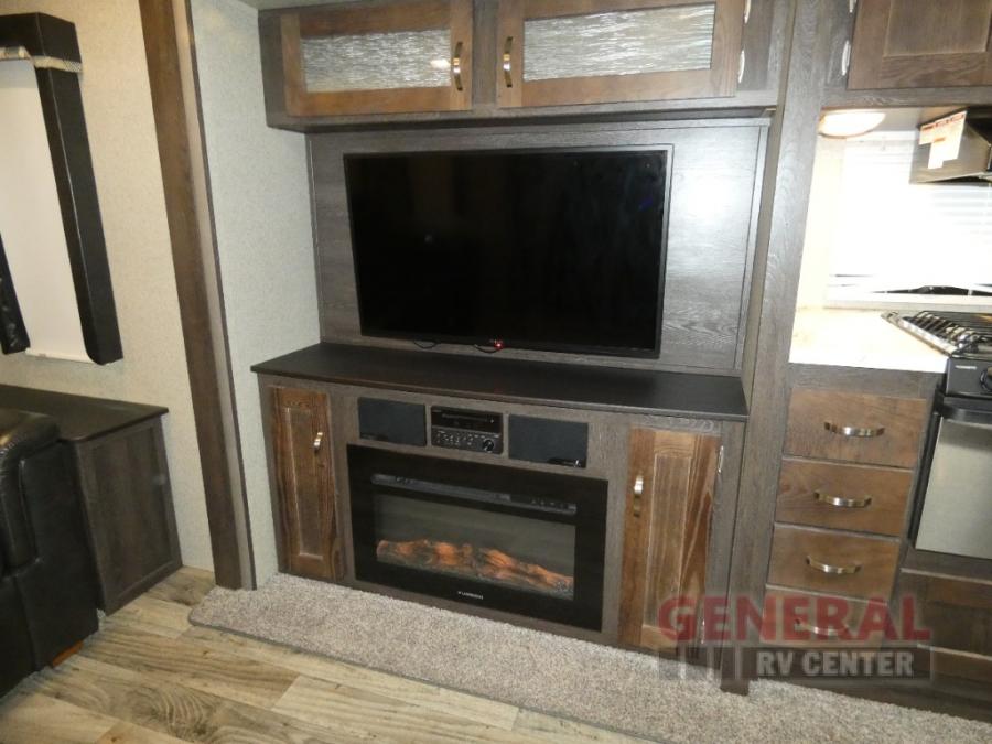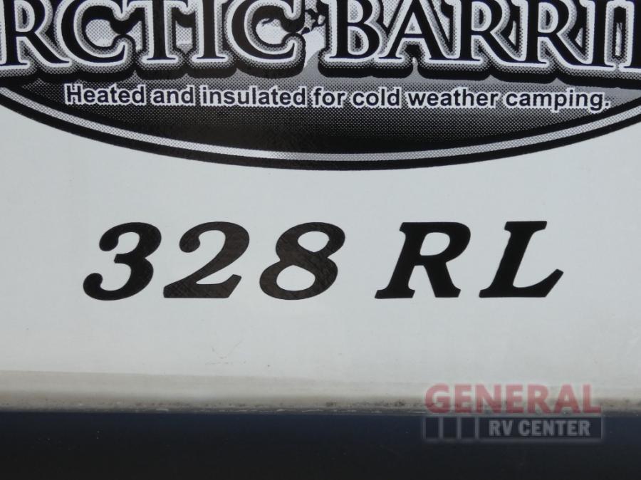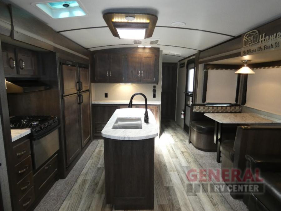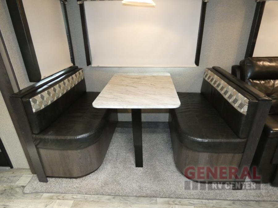 As you enter this Outback Super Lite travel trailer 328RL you will find dual opposing slides in the main living area which help to open up the floor space. The slide to the left has a dinette where you can enjoy your meals during the day and at night the dinette converts into a bed. There are also two theater seats with cupholders and an overhead cabinet.