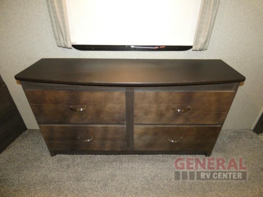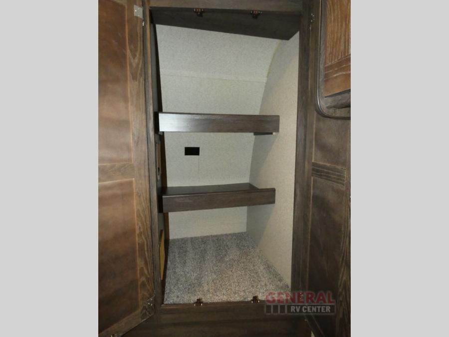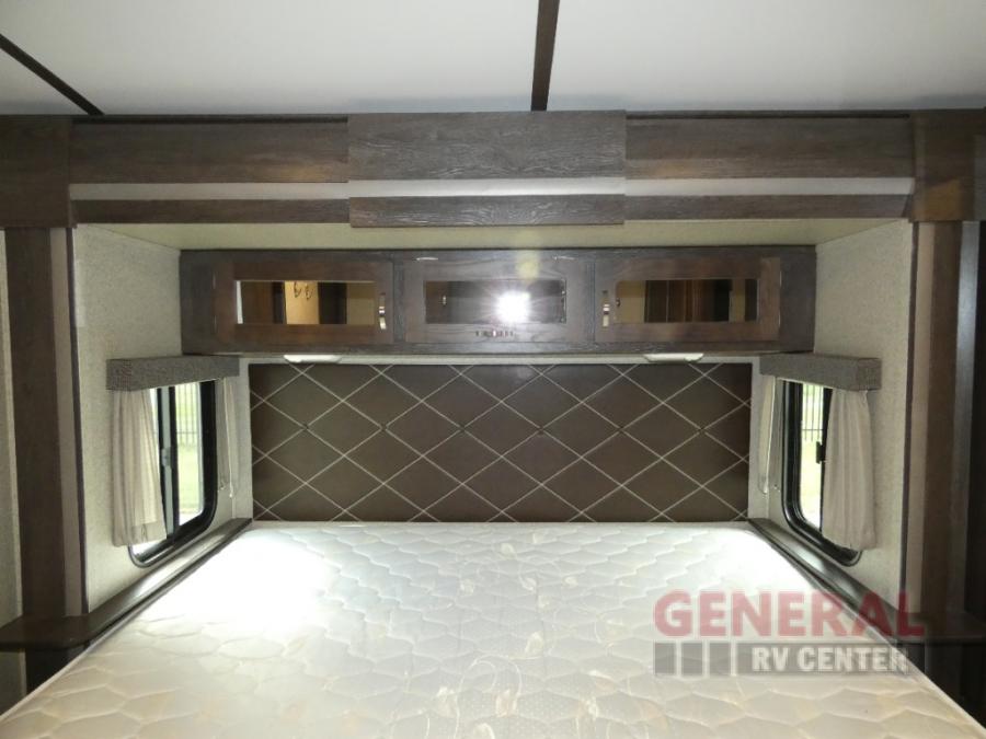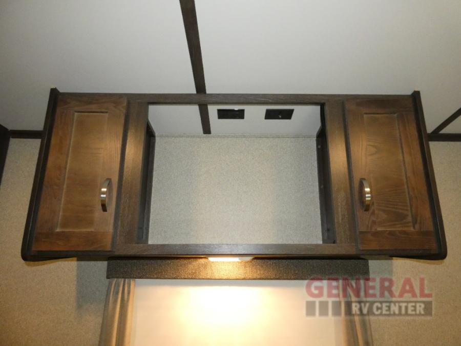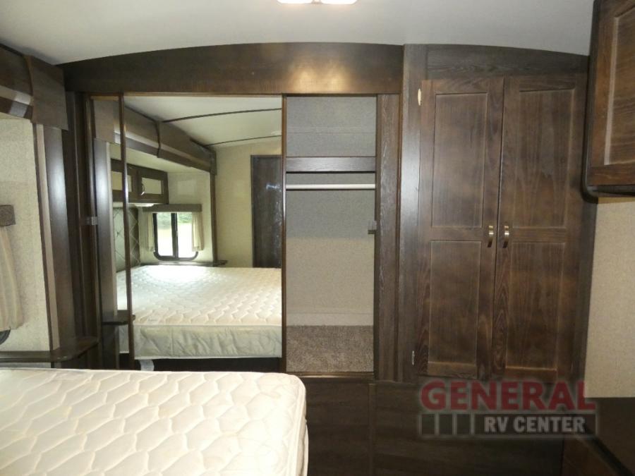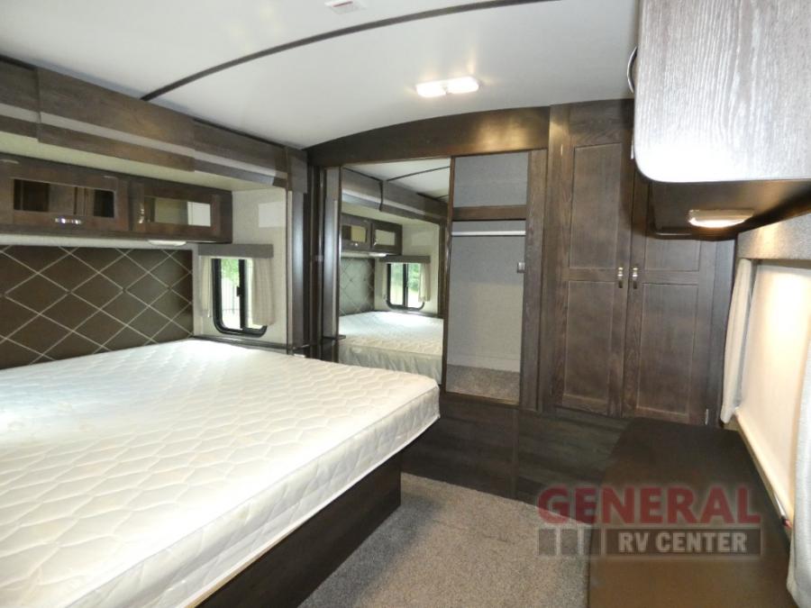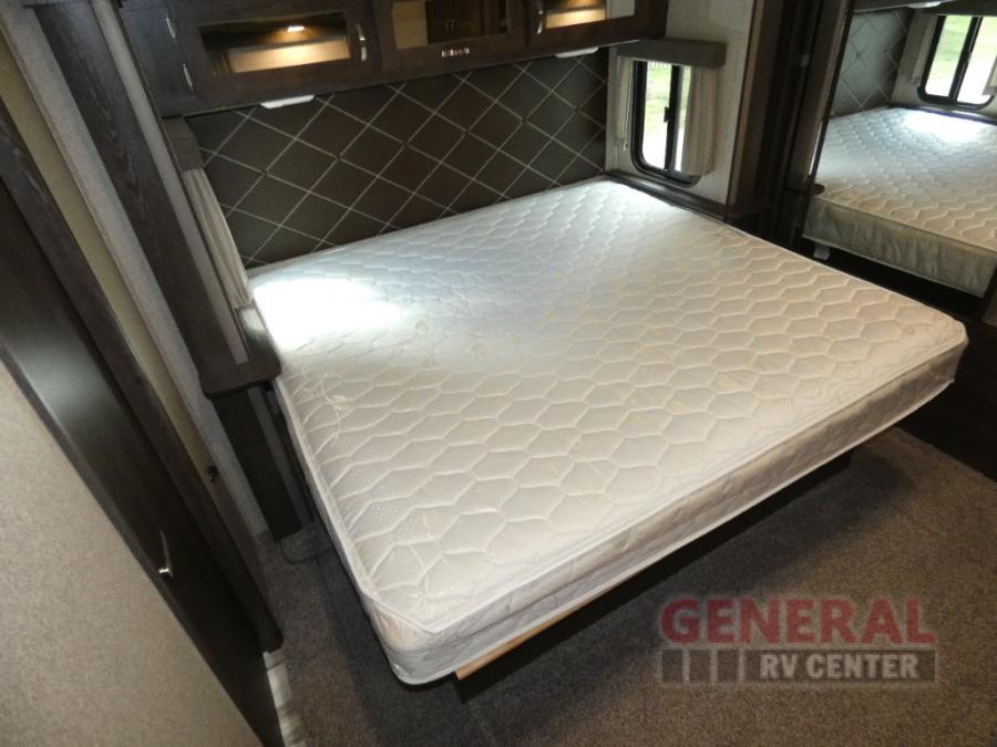 From the bathroom there is a sliding door which leads into the bedroom, or you can enter into the bedroom from the hallway. You will find a king bed slide out with overhead cabinets, storage, and a full width wardrobe.