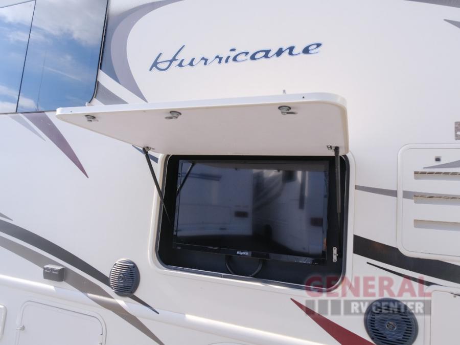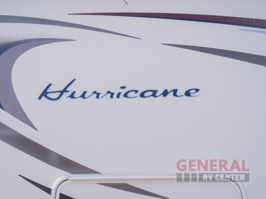 You will find so much to love about the Hurricane models whether you are out for a long road trip across the country or a weekend tailgating party close to home. All Hurricane models feature soft furnishing, solid surface countertops, and new glass inserts in the upper kitchen cabinets. Hand-crafted Maple or Cherry cabinets compliment each of the decor choices offered. No matter which model you select, each features a dinette that seats four comfortably and also converts to a bed for two. You will also find added sleeping in the drop-down cabover bunk that the kids are sure to love. With the front captain's chairs on swivels, you can easily bring them into a conversation area in the living space once parked, and there is a computer workstation at the passenger side front seat for those who need to do a bit of work while you travel, or just enjoy surfing the internet. Each Hurricane model also features a pantry and spice rack, plus a beautiful glass tile backsplash. On the outside, enjoy plenty of storage for all of your extra camping gear and an outdoor shower, plus a 32" LED TV and lighted awning to light up the night for entertainment as well as daytime cover from the sun. Make a Hurricane model your new home-away-from-home today!