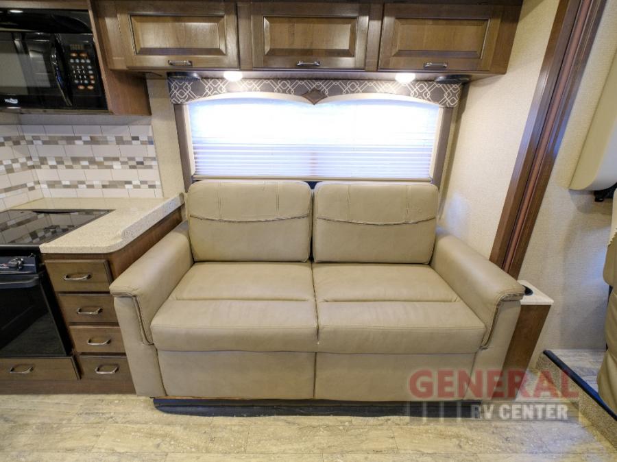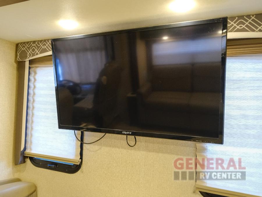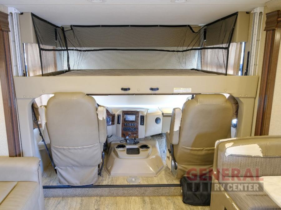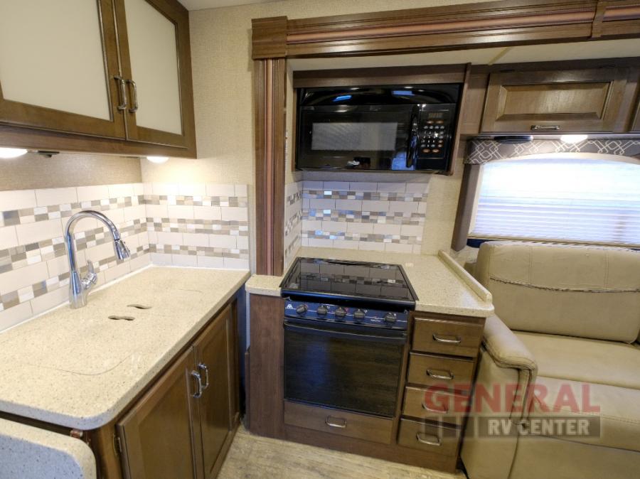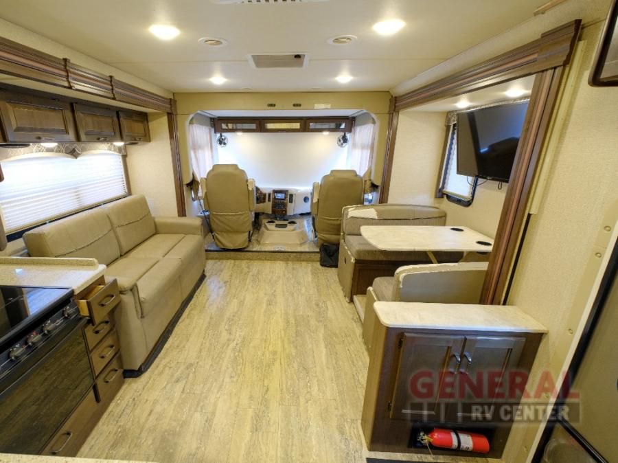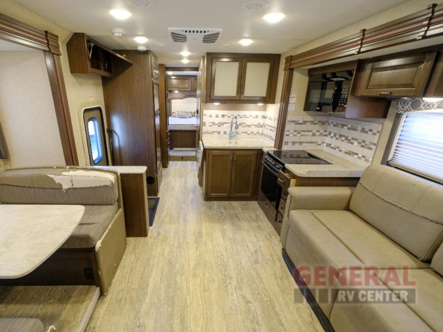 When you are ready for your next trip across the country, choose to do so in style and comfort with this 31Z Hurricane Class A gas motor home by Thor Motor Coach. This model features dual opposing slide outs in the combined kitchen and living area gives you plenty of room for walking around the unit. There are seatbelts for the kids and extra guests while you are on the road. Step up into the rear bedroom, and you will find a queen bed, two wardrobes for your things, and a 32" LED TV for enjoying a movie before bed. Enjoy your next movie night outdoors thanks to the exterior 32" LED TV, just grab the popcorn!