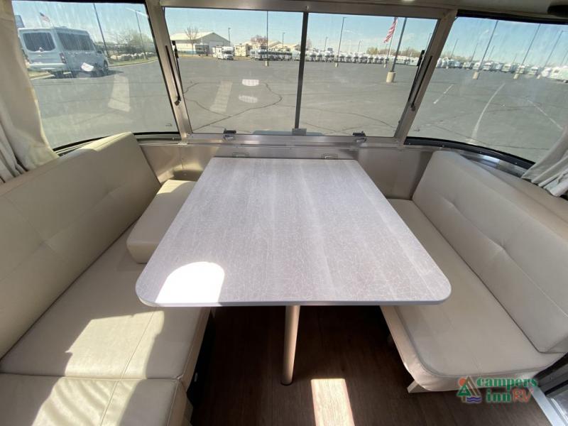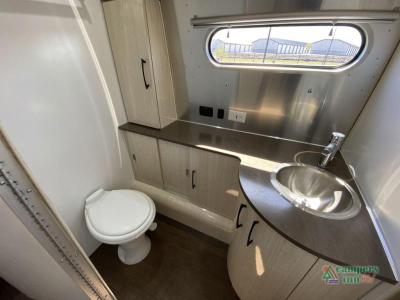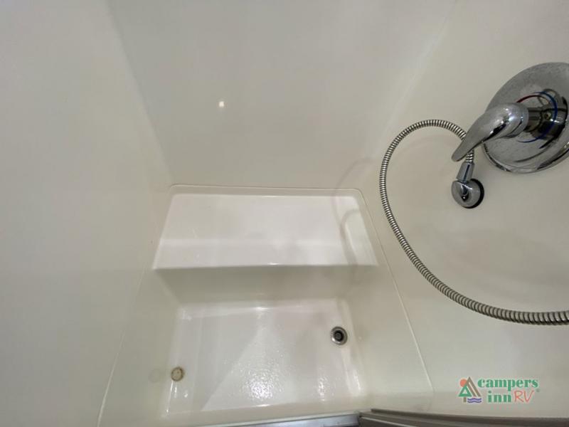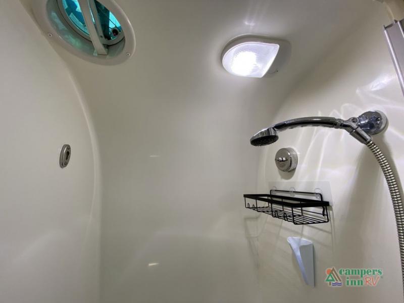 Take a trip in this International Serenity travel trailer and you will never want to vacation in anything else ever again. The entire unit is kept stylish and sleek with seamless vinyl flooring, decorative throw pillows, LED dimmable lighting, and Corian countertops, and the full bathroom with its porcelain toilet and hand-held shower head will enhance the soothing atmosphere that this trailer delivers.