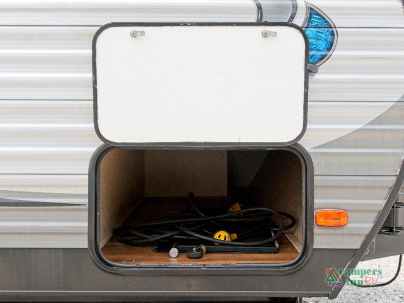 Outside, the 15' power awning with LED lighting creates a shaded, weather-protected space, and the exterior storage keeps your gear organized and accessible.