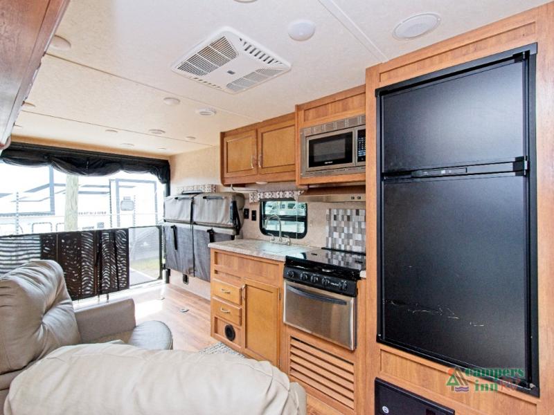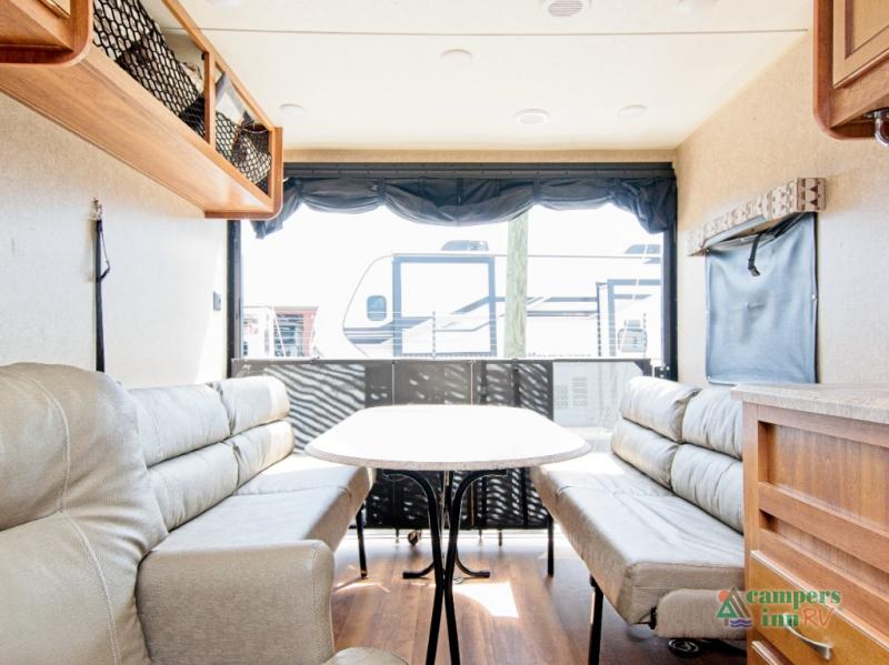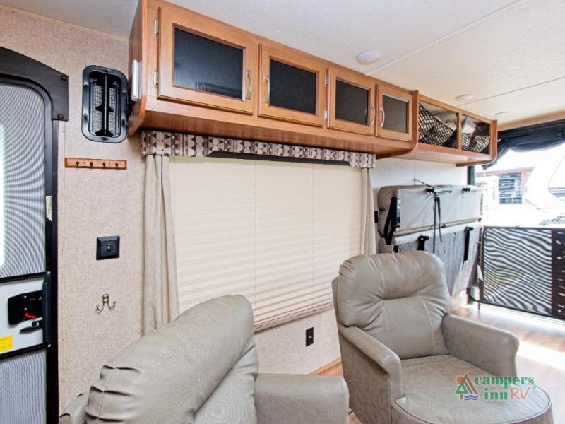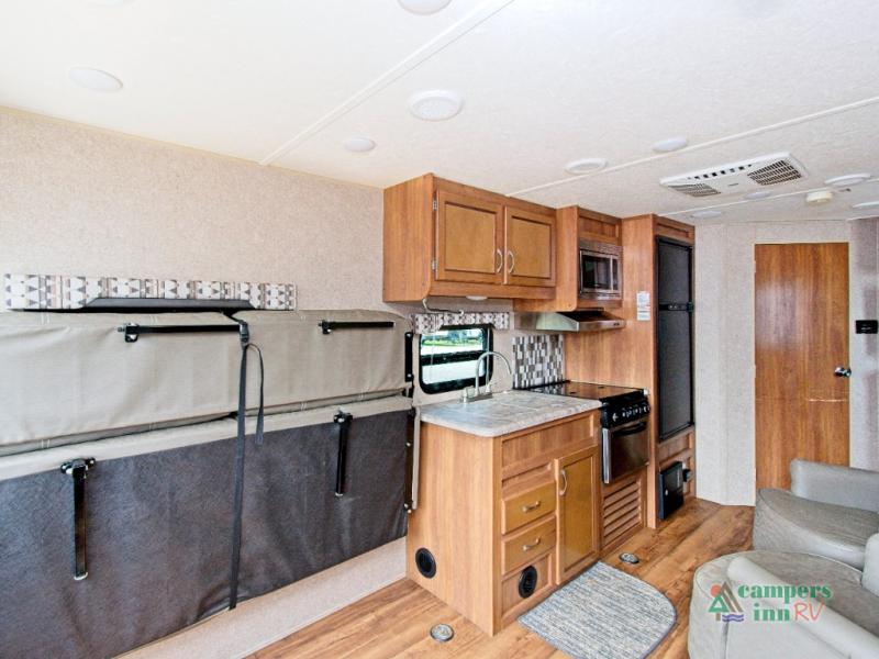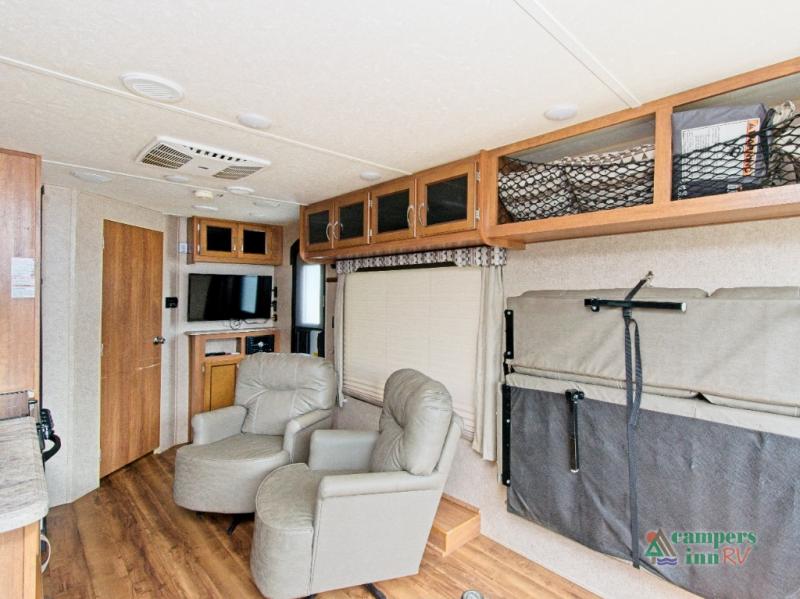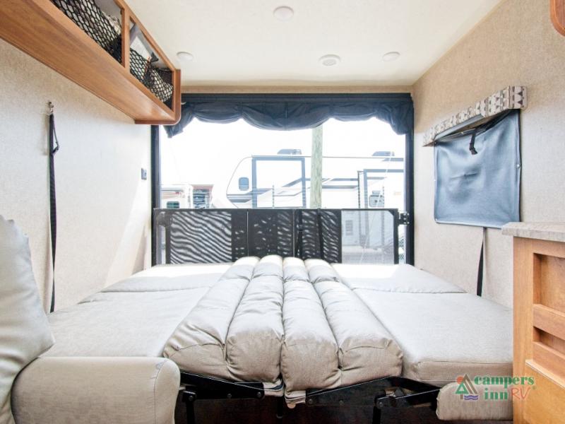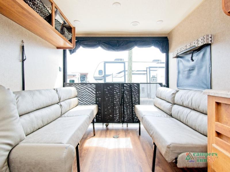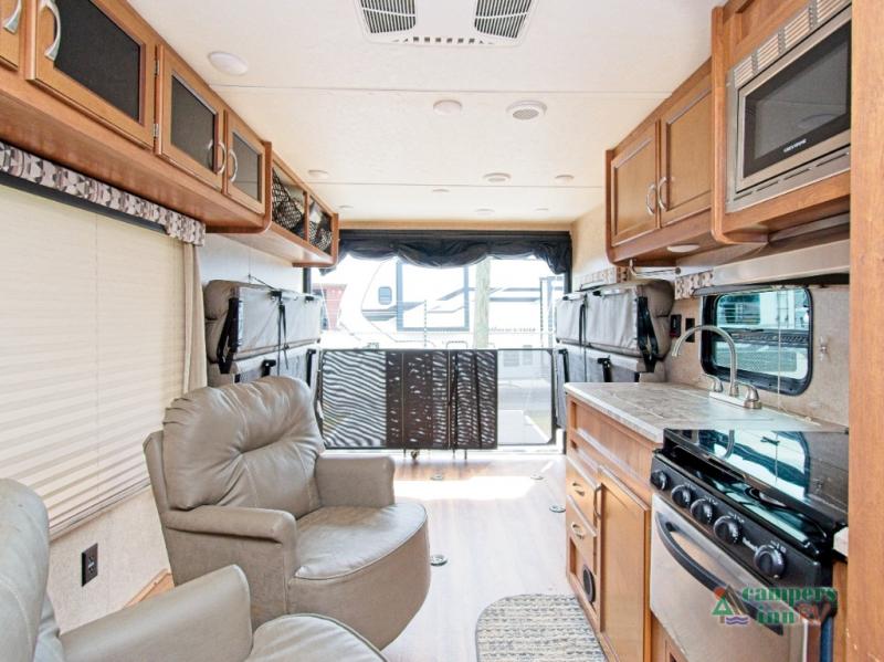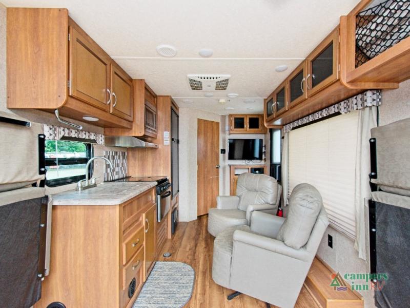 Inside, the dual fold-down sofas offer flexible seating and sleeping arrangements, while the private front bedroom ensures a restful retreat. The fully equipped kitchen includes a microwave oven, two-burner cooktop, and overhead cabinetry for all your essentials. After a day of riding, unwind in one of the two recliners or enjoy a movie night with the available TV mount.