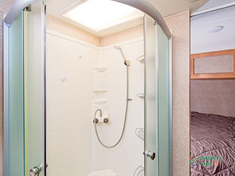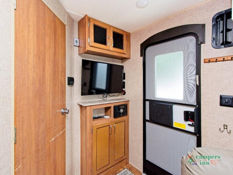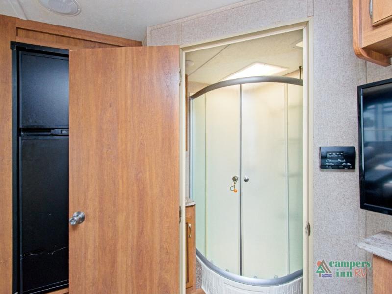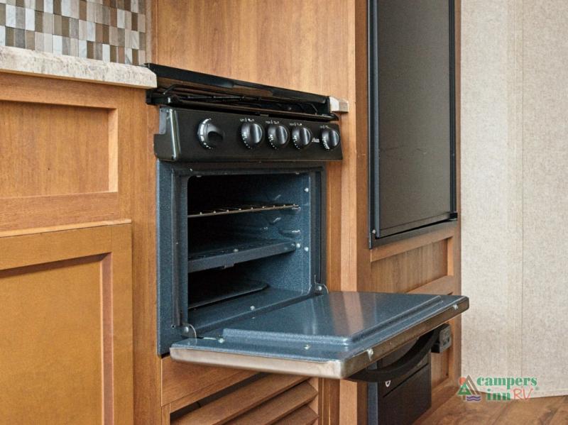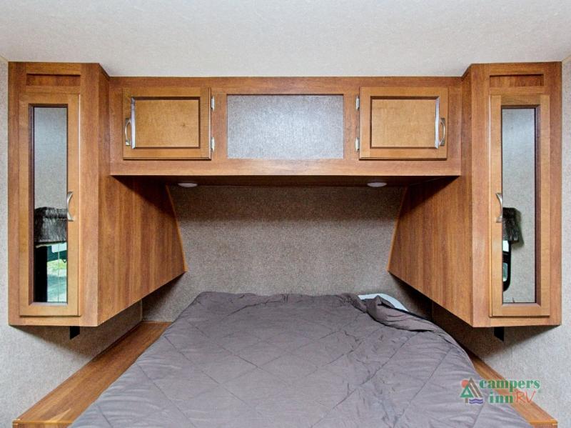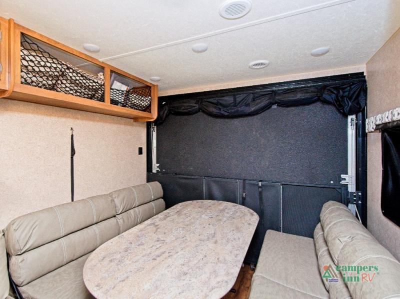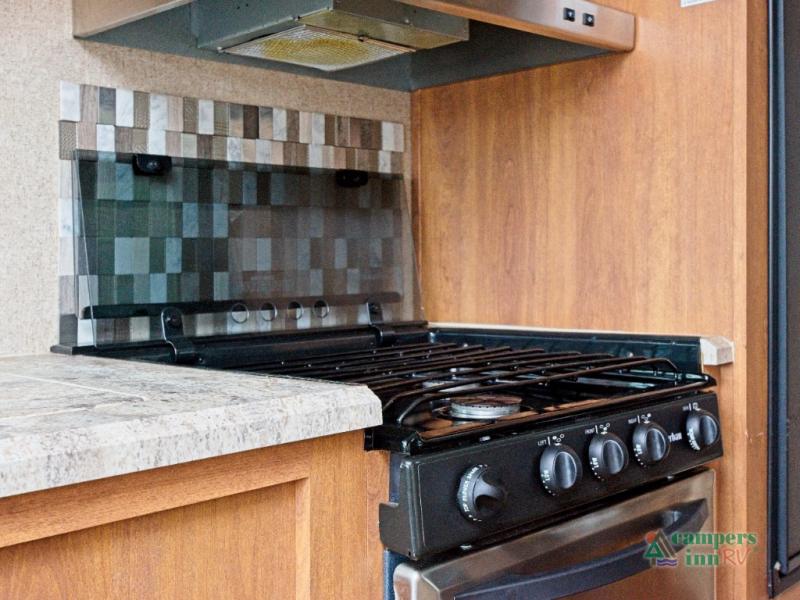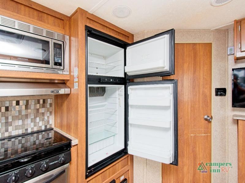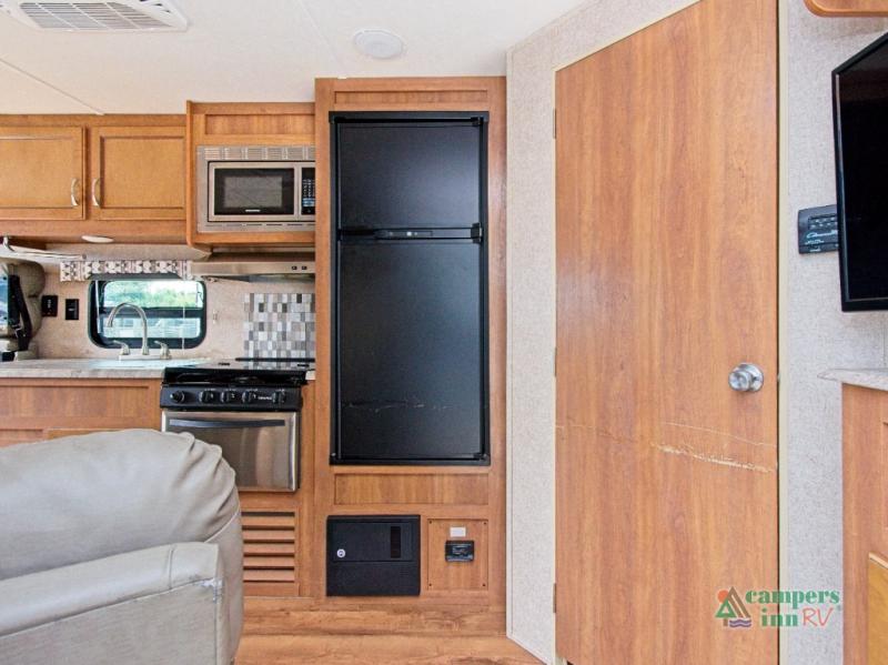 Inside, the dual fold-down sofas offer flexible seating and sleeping arrangements, while the private front bedroom ensures a restful retreat. The fully equipped kitchen includes a microwave oven, two-burner cooktop, and overhead cabinetry for all your essentials. After a day of riding, unwind in one of the two recliners or enjoy a movie night with the available TV mount.