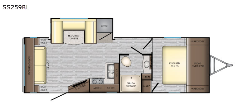 Don't let this awesome Sunset Trail Super Lite travel trailer pass you by! With its king-size bed and large wardrobes in the front private bedroom, you have a secluded and comfortable place to retreat to each evening, and the addition of the U-shaped dinette and 64" sofa in the main living area are what allow this trailer to sleep six people while you travel.