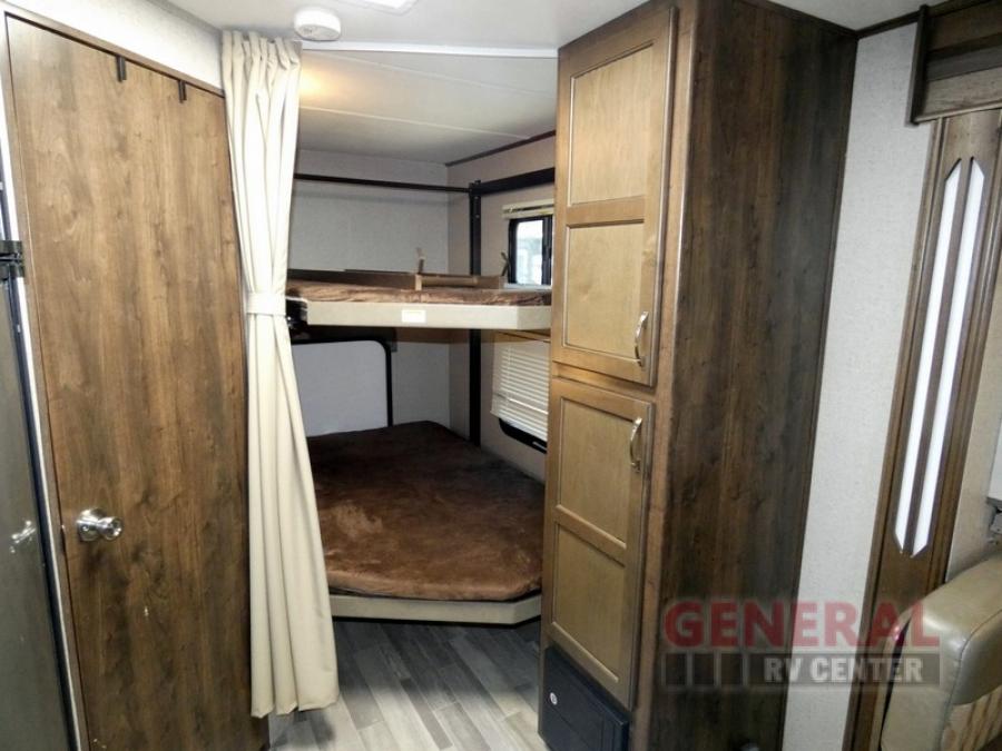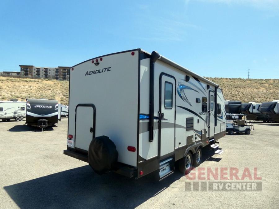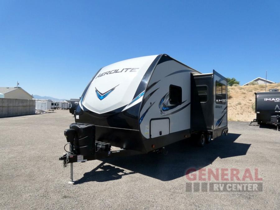 This dual-entry Dutchmen Aerolite travel trailer will provide sleeping space for seven with the rear Happi Jac power bunks, the front queen-size bed, and the booth dinette that sits inside of the single slide. You can rinse off after a muddy outdoor trek with the outside shower before coming inside to completely clean up in the full bathroom, and because the bathroom contains one of the two entry doors, you will have quick access in and out. The kitchen provides all the appliances needed to make plenty of scrumptious meals throughout your trips with its glass top three-burner range and 21" oven. You are sure to appreciate the exterior Pac-N-Play door that allows you to store items under the bunks, and the pass-through storage compartment up front will let you bring along large camping equipment.