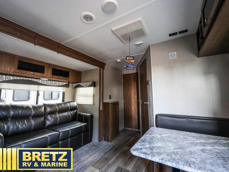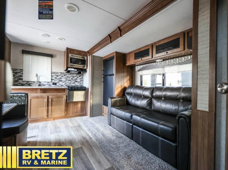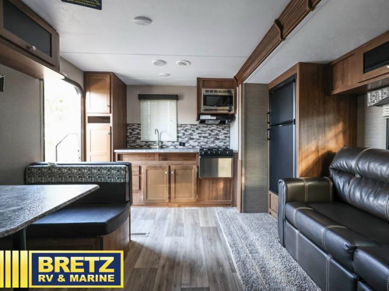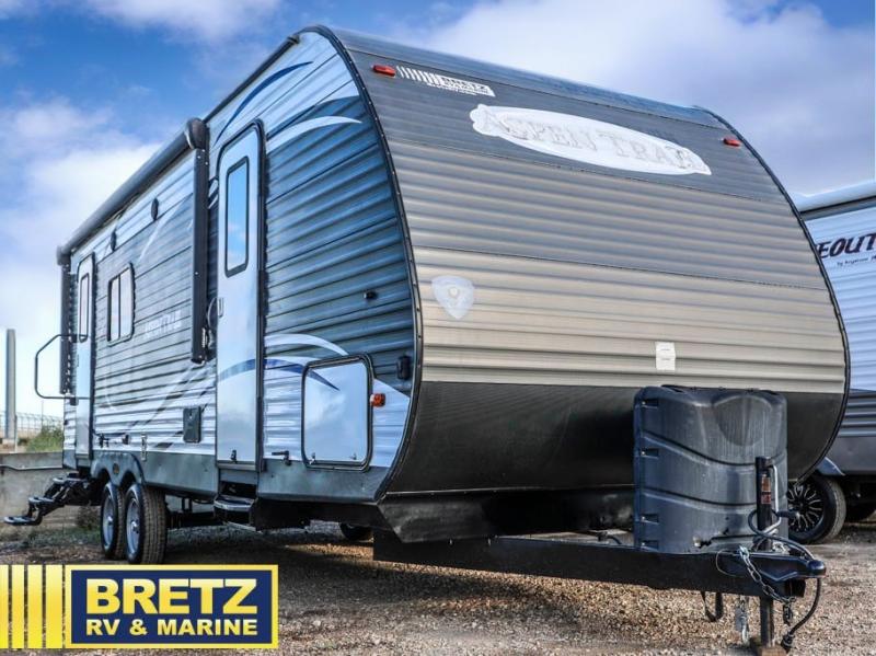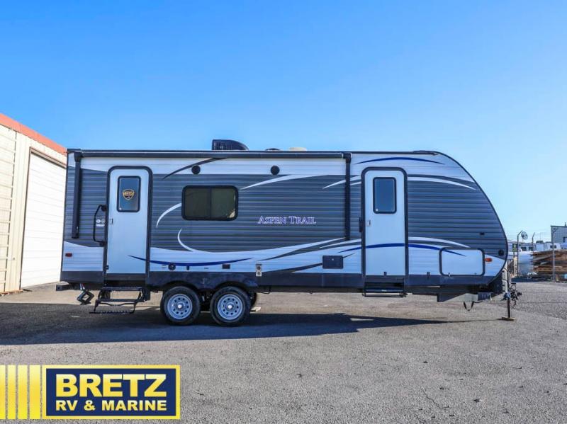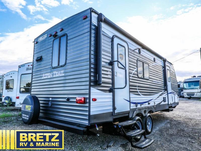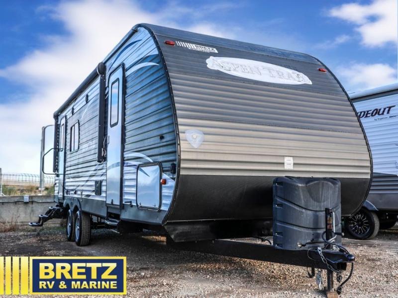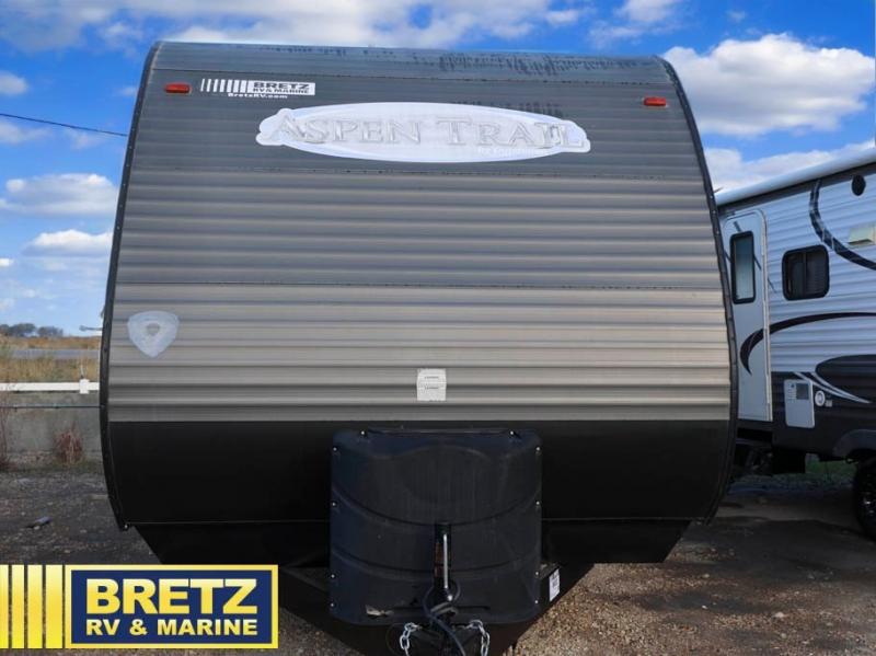 Do you prefer eating meals at a dinette, sofa, or outdoors? This Aspen Trail travel trailer allows you to make meals with the appliances along the rear wall, grab a snack before heading outside the main entry, and relax on the sofa or booth dinette when not eating outside. There are two entry doors into the full bathroom so that the master suite can have its very own access door. The comfortable queen-size bed, extra sleeping space on the living room furniture, and plenty of storage allows you to pack all your things for any kind of traveling.