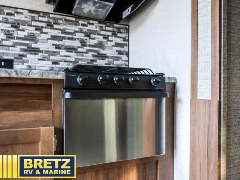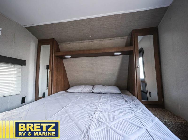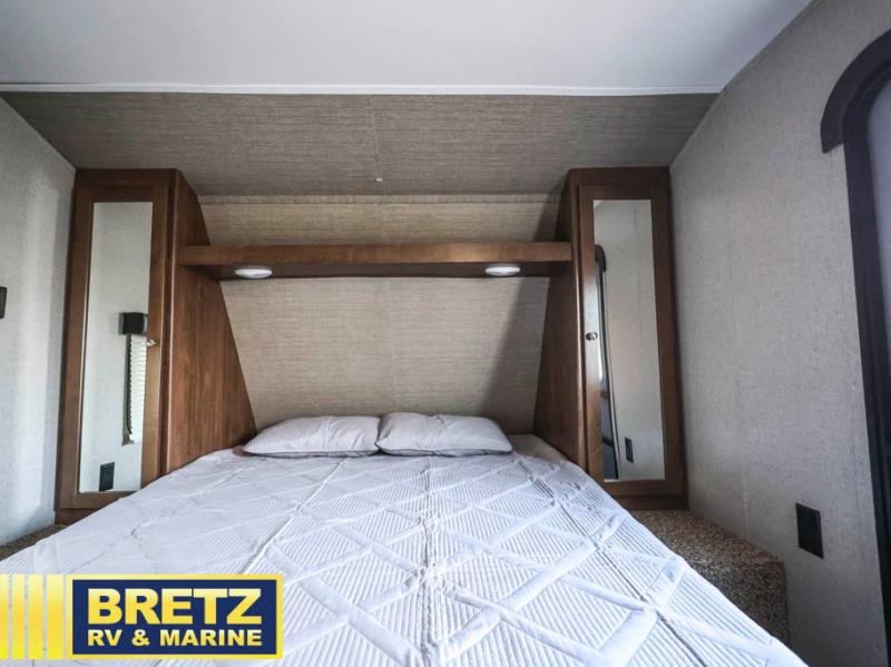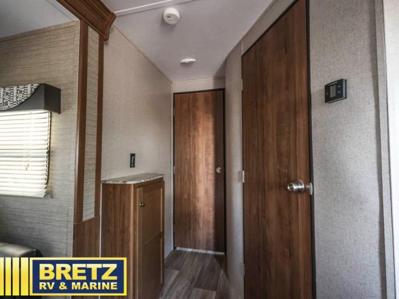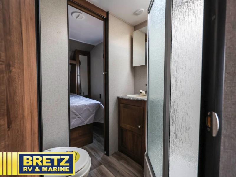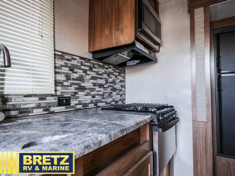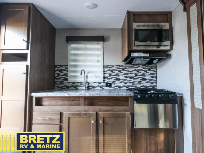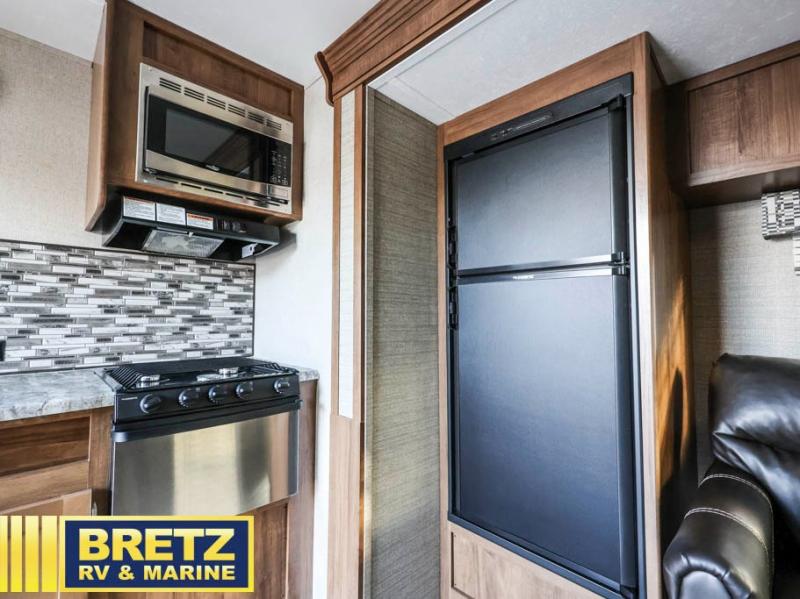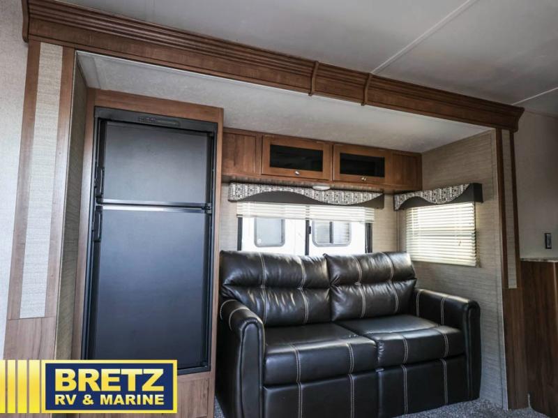 Do you prefer eating meals at a dinette, sofa, or outdoors? This Aspen Trail travel trailer allows you to make meals with the appliances along the rear wall, grab a snack before heading outside the main entry, and relax on the sofa or booth dinette when not eating outside. There are two entry doors into the full bathroom so that the master suite can have its very own access door. The comfortable queen-size bed, extra sleeping space on the living room furniture, and plenty of storage allows you to pack all your things for any kind of traveling.