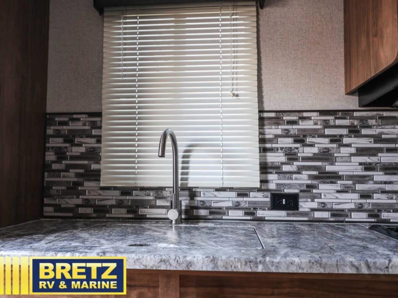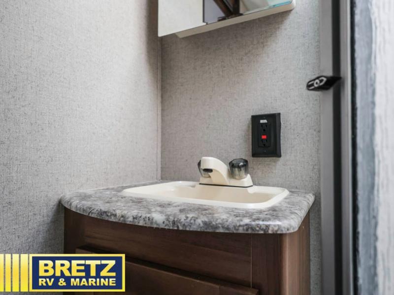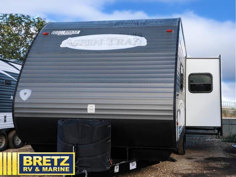 With each Aspen Trail travel trailer by Dutchmen RV, you can travel during any season thanks to the heated and enclosed underbelly, and you will find the mega exterior pass-through storage quite handy for your larger items, such as lawn chairs, a hammock, and campfire grilling utensils. The interior luxuries, such as the Everdream mattress, high-output furnace, and 82" ceiling height, are sure to impress, and the two exterior speakers give you the perfect reason to gather outside underneath the awning with friends.