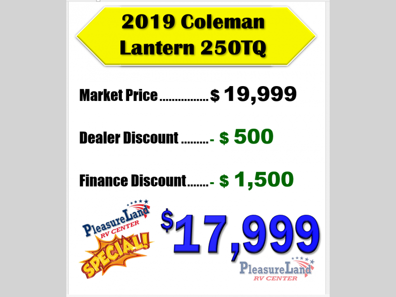 When your off-road toys are calling your name, hitch up this Coleman Lantern Series toy hauler travel trailer to your tow vehicle and hit the road for fun and adventure. You can start thinking about all the places you will ride your toys after a good night's rest in your private master suite with USB outlets. The kids or your buddies can sleep on the dual opposing sofas in the cargo area, and everyone can visit together underneath the 16' electric awning with LED lights outside or relax inside on the two lounge chairs. The dual-entry bath is available when you are ready to get cleaned up. It's time to load up the toys and forget your worries!