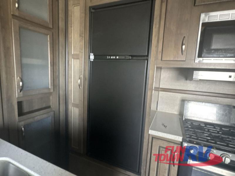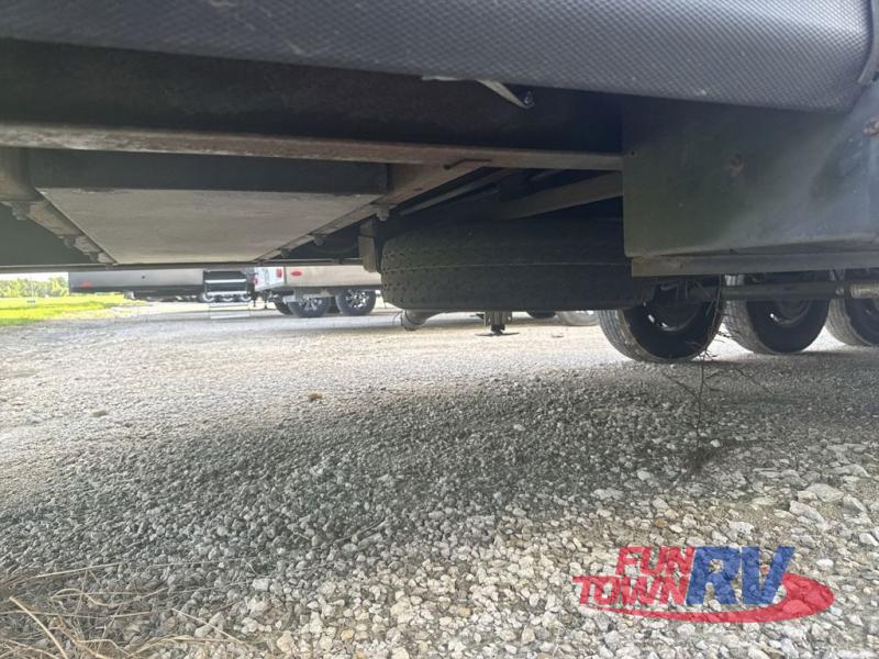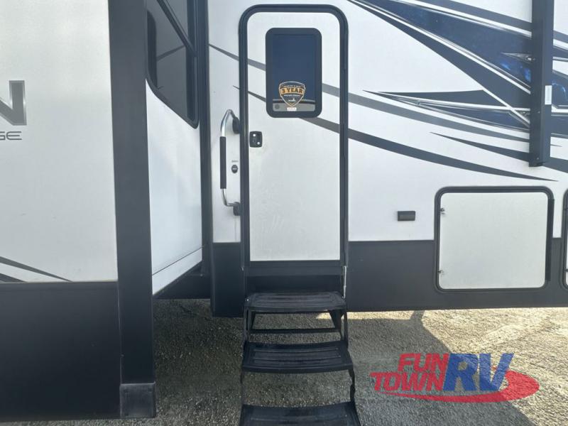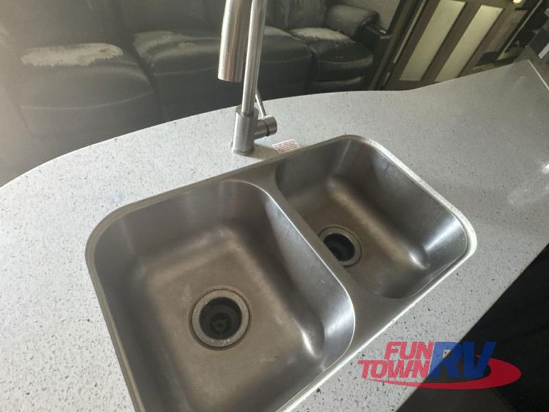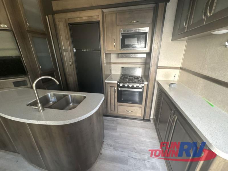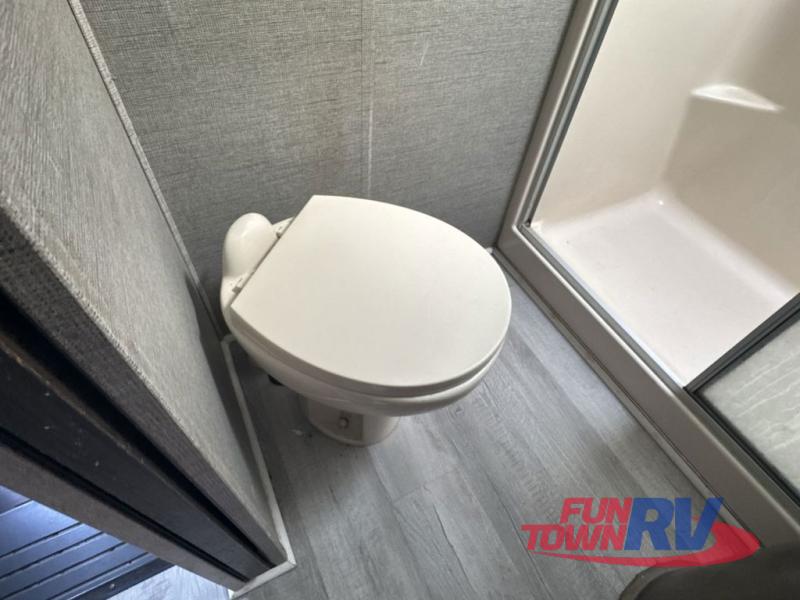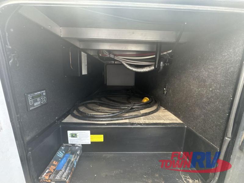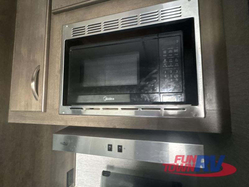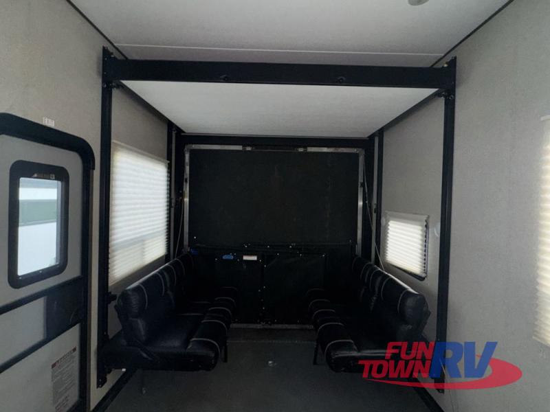If you are looking for an exceptional unit that will make every getaway enjoyable, look no further than this Voltage Triton toy hauler! The three slides are what make this unit spacious and accommodating enough to fit a full and half bathroom inside so that no one will have to wait all morning to use the restroom, and because this unit can sleep nine people, it is a huge asset for those who travel with large groups. The 15' separate garage area is not only perfect for storing your favorite toys while you travel, but it is also the perfect lounging and sleeping area once you've set up camp because of its twin-size loft, electric bunk, and convertible sofas.