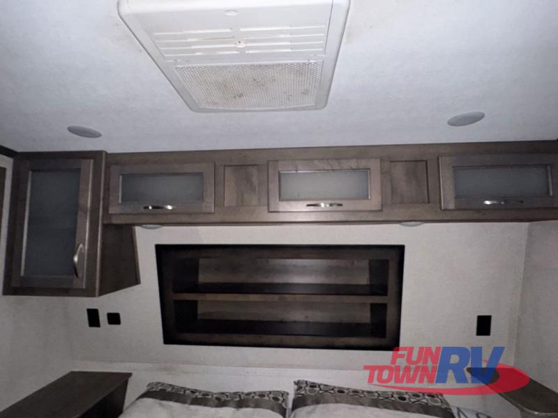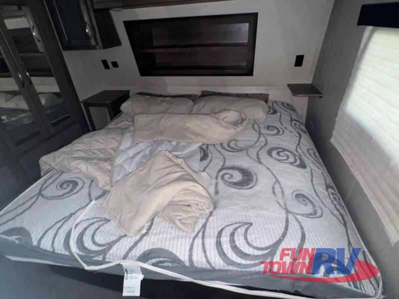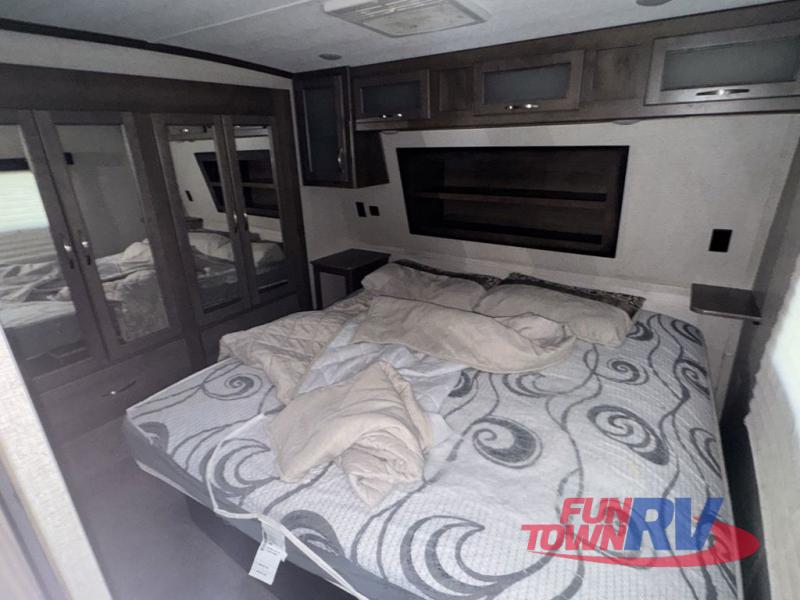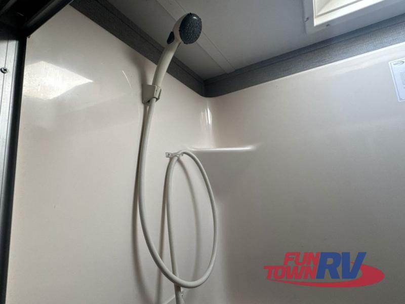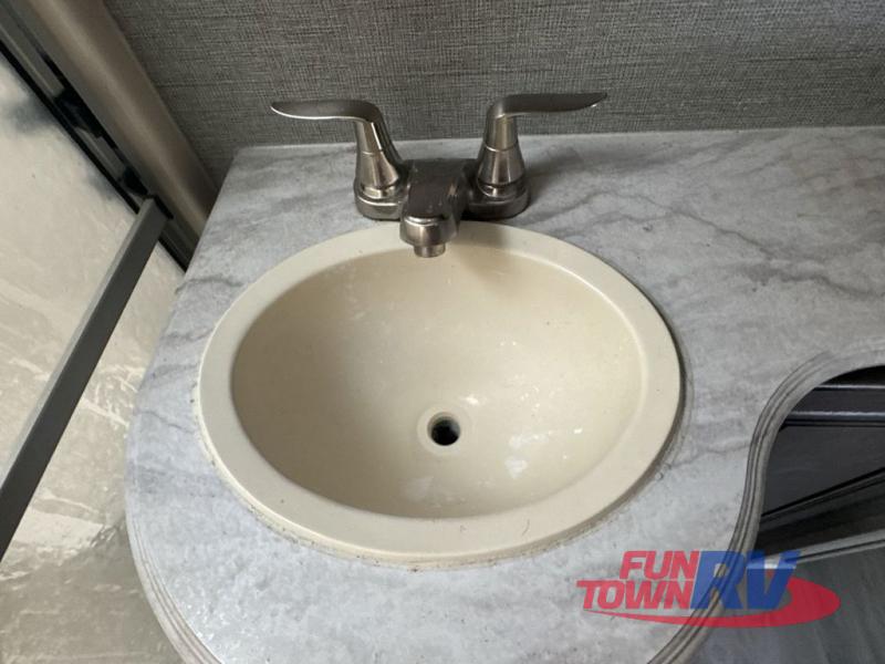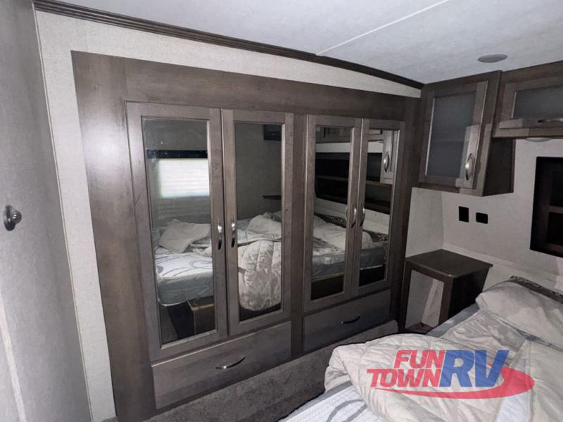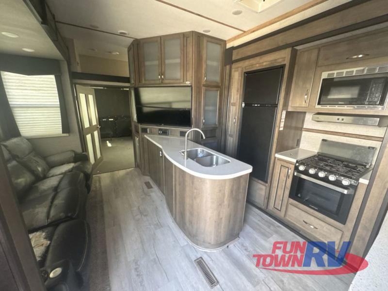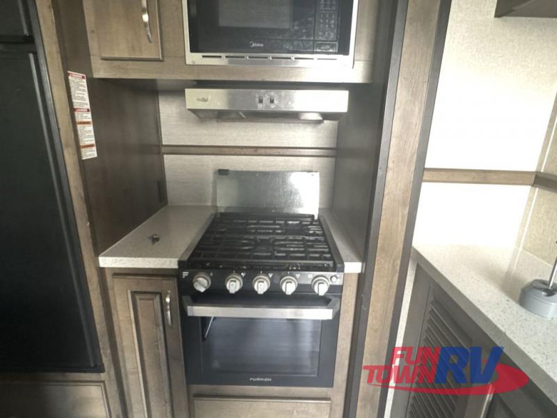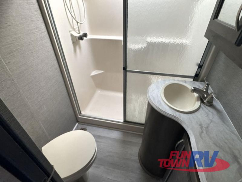 If you are looking for an exceptional unit that will make every getaway enjoyable, look no further than this Voltage Triton toy hauler! The three slides are what make this unit spacious and accommodating enough to fit a full and half bathroom inside so that no one will have to wait all morning to use the restroom, and because this unit can sleep nine people, it is a huge asset for those who travel with large groups. The 15' separate garage area is not only perfect for storing your favorite toys while you travel, but it is also the perfect lounging and sleeping area once you've set up camp because of its twin-size loft, electric bunk, and convertible sofas.