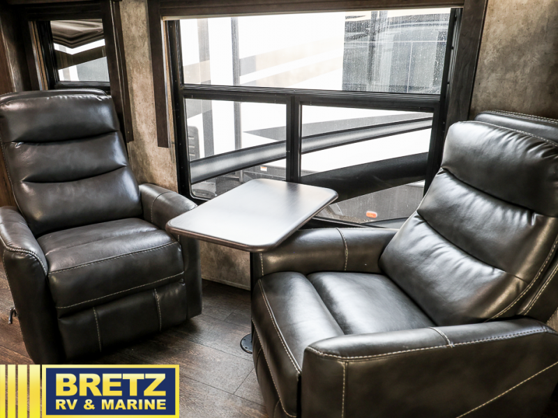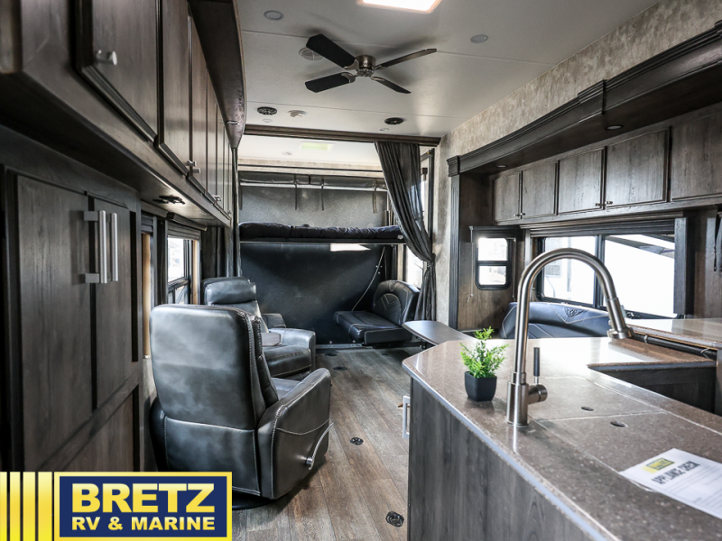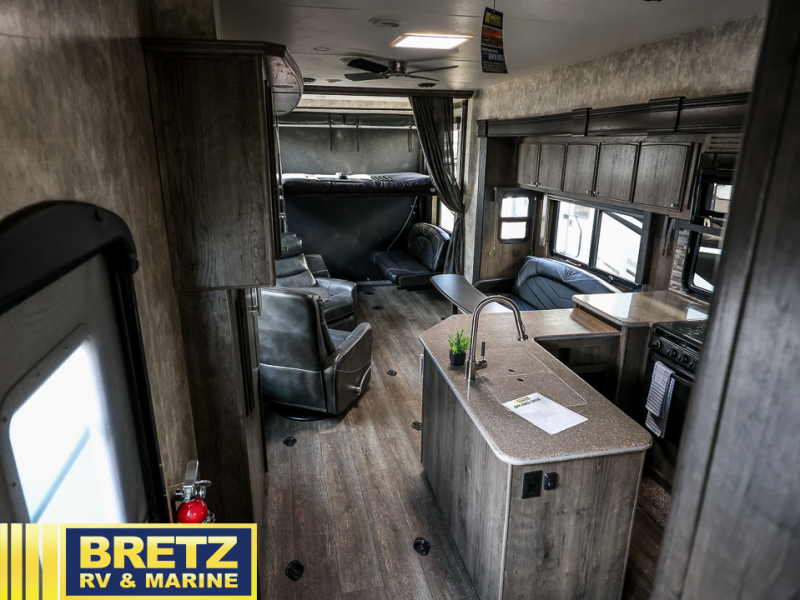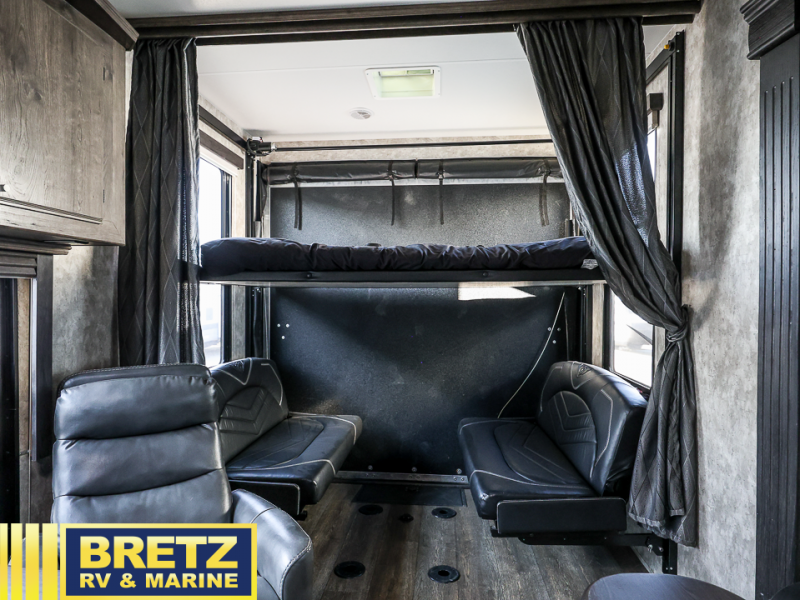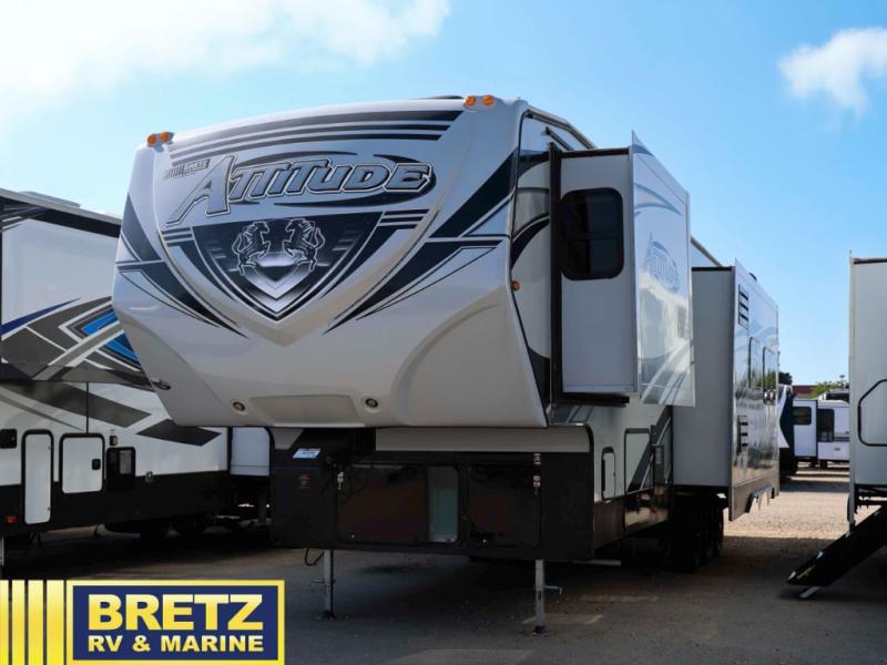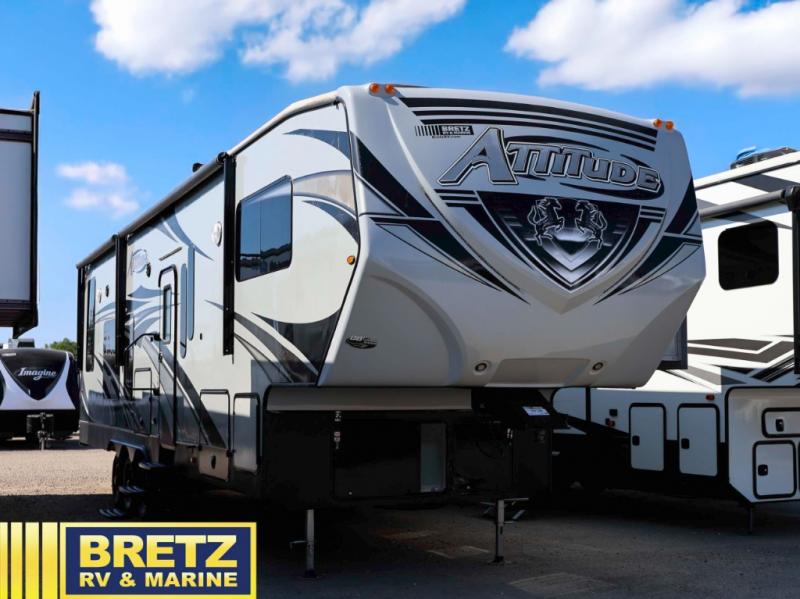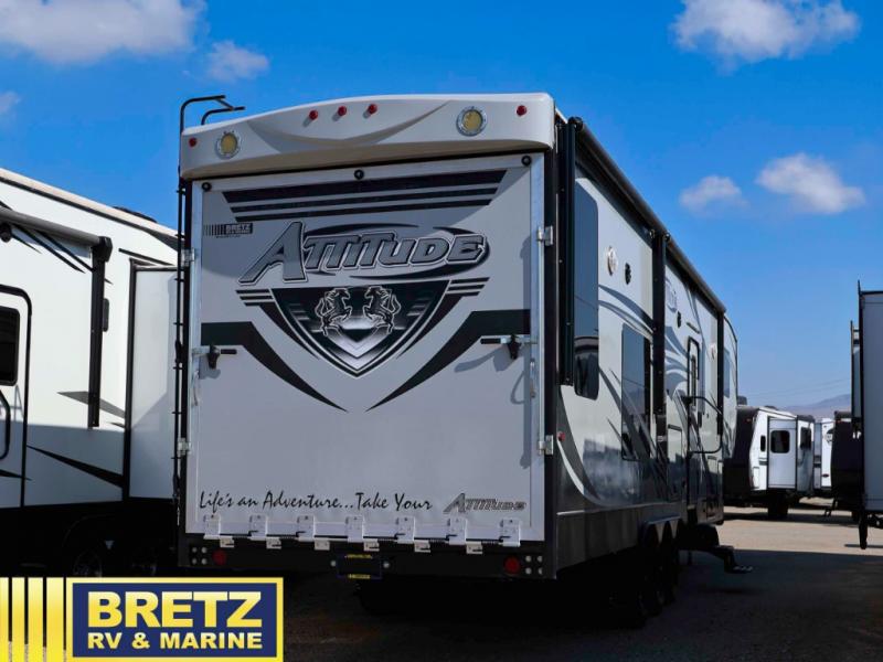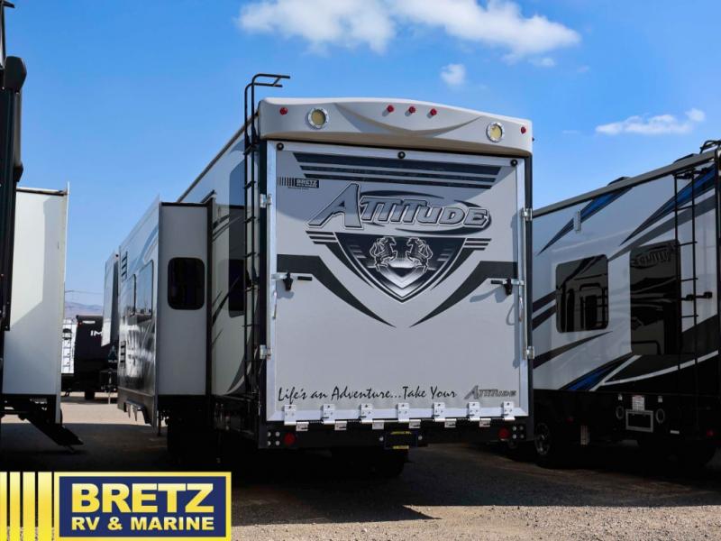 Step inside this Attitude Widebody 35GSG toy hauler and see just how much fun you will have on your next getaway! It features a front private bedroom with a pillowtop king mattress, a wardrobe and a dresser to keep your clothes neat and tidy, as well as an entrance into the dual entry bath which will come in very handy at night. You will find entertainment inside and outside with the 50" TV in the living room and the exterior 40" TV, plus there is an electric awning with LED lights. After you have whipped up your best meal in the complete kitchen, you can enjoy it at either the dinette below the electric bed or one of the two chairs with a table in between, and if you dare to be brave you can even eat on the sofa!