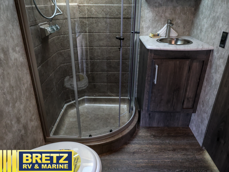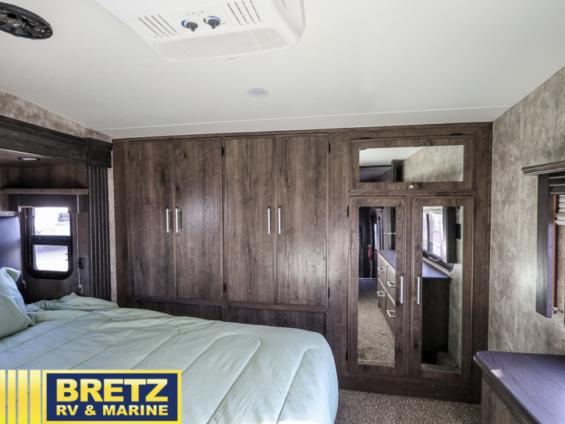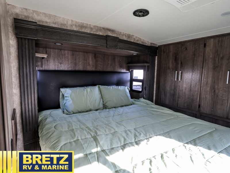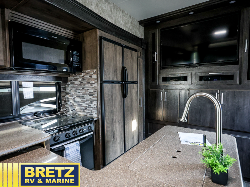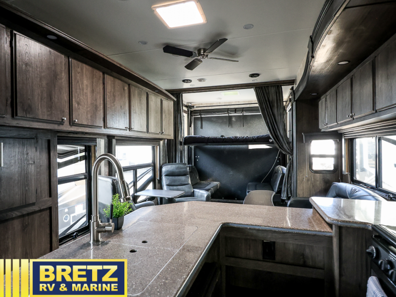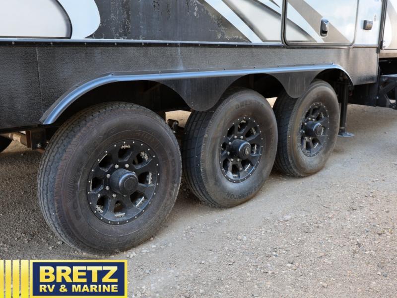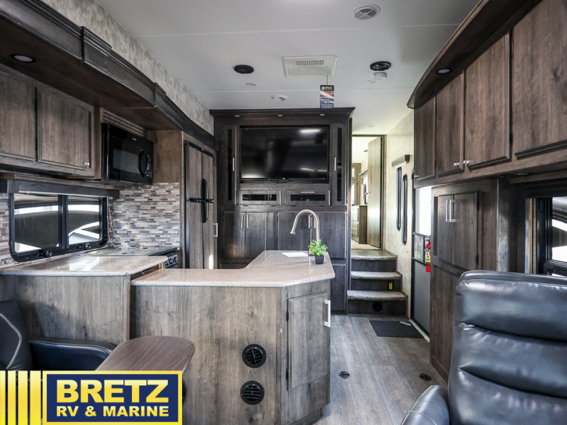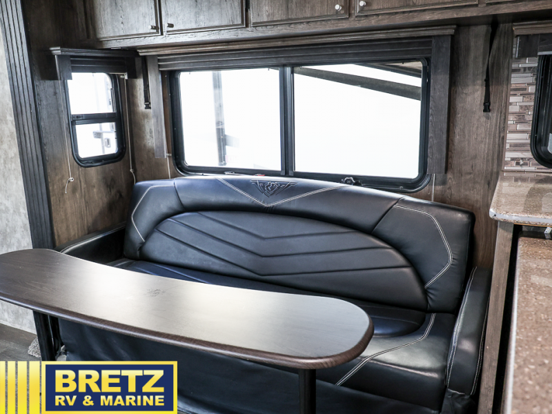 Step inside this Attitude Widebody 35GSG toy hauler and see just how much fun you will have on your next getaway! It features a front private bedroom with a pillowtop king mattress, a wardrobe and a dresser to keep your clothes neat and tidy, as well as an entrance into the dual entry bath which will come in very handy at night. You will find entertainment inside and outside with the 50" TV in the living room and the exterior 40" TV, plus there is an electric awning with LED lights. After you have whipped up your best meal in the complete kitchen, you can enjoy it at either the dinette below the electric bed or one of the two chairs with a table in between, and if you dare to be brave you can even eat on the sofa!
