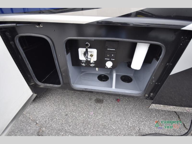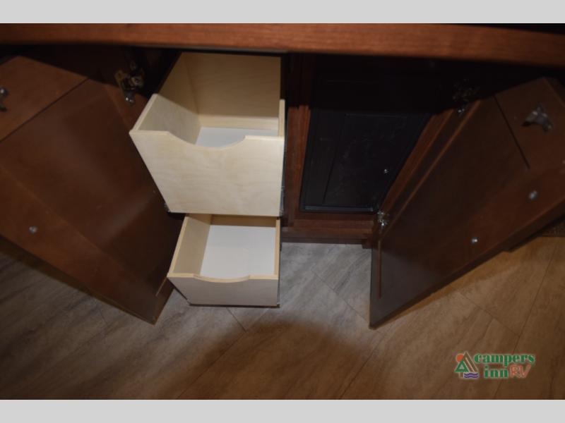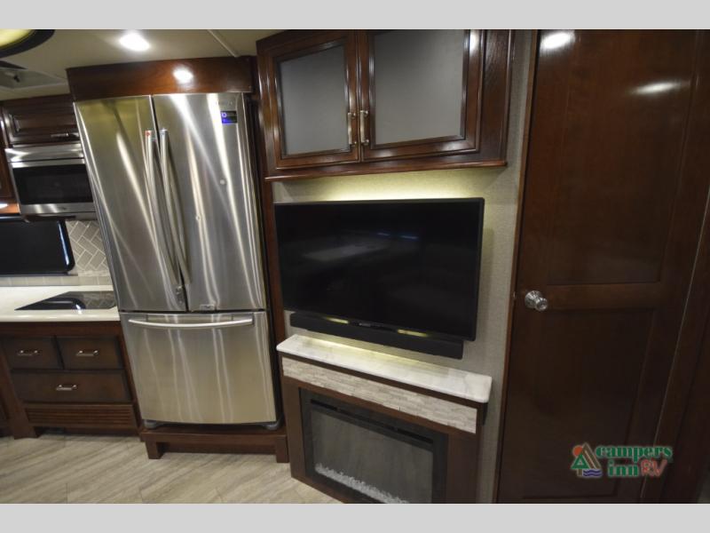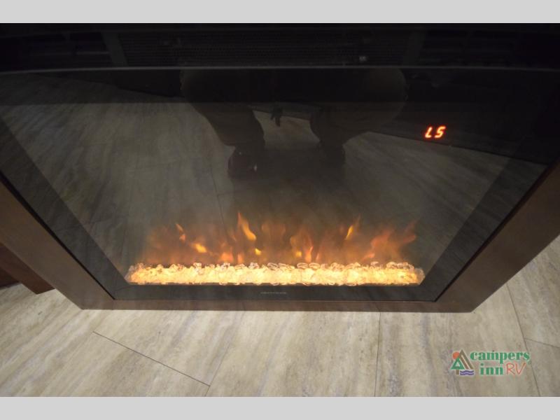 Cook up campsite feasts in a fully equipped kitchen featuring a residential refrigerator, pantry storage, and adjustable shelving that adapts to your needs. After dinner, cozy up by the electric fireplace or take the fun outdoors with the built-in 40" exterior TV — perfect for movie nights under the stars or catching the game at the campground.