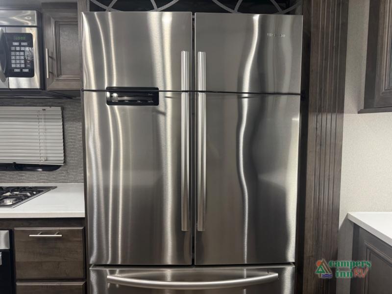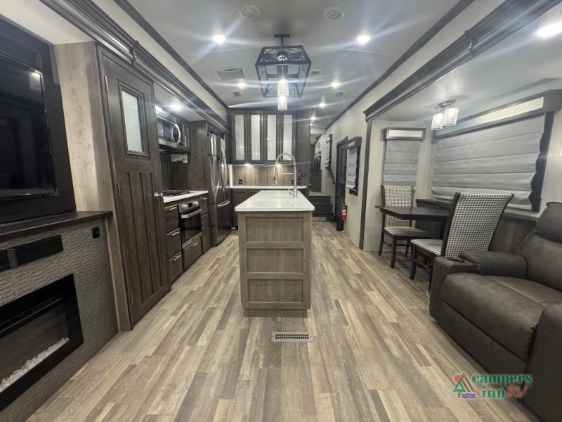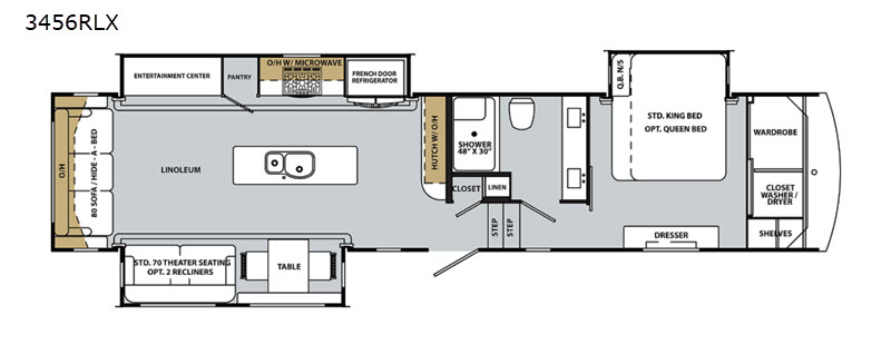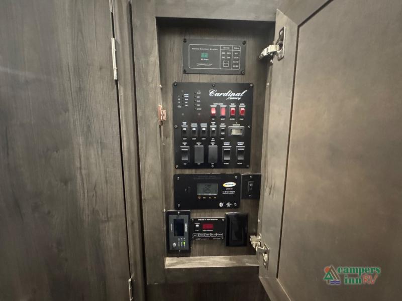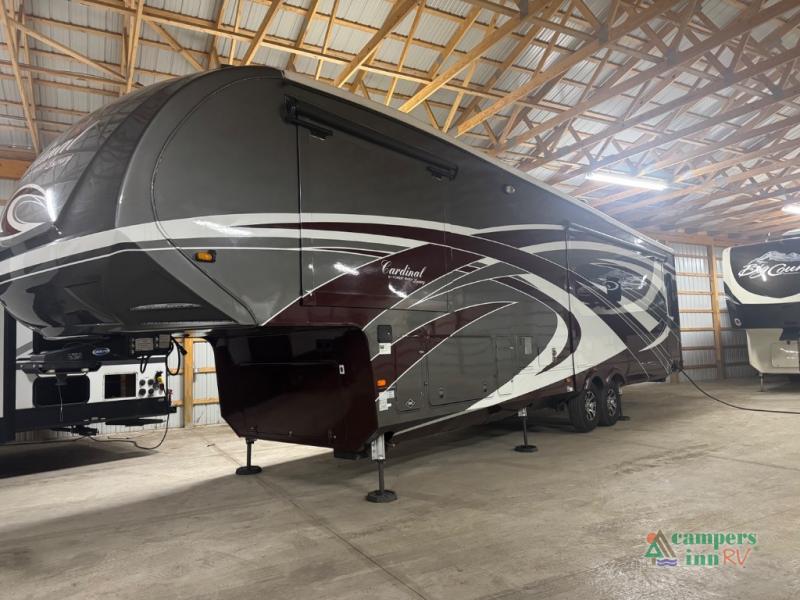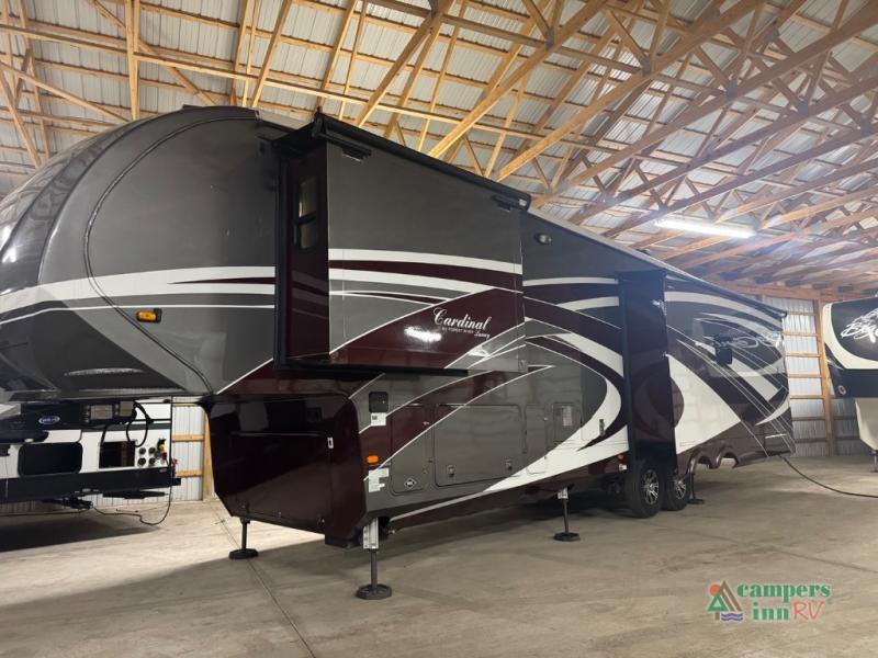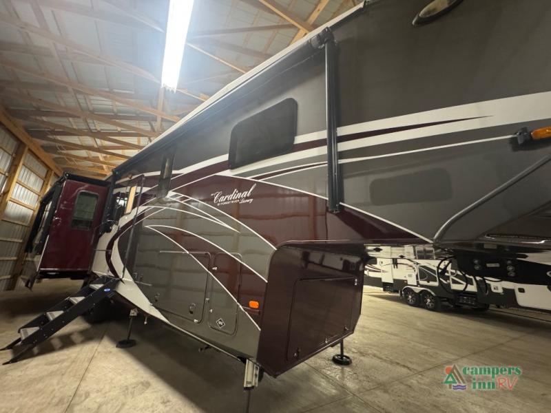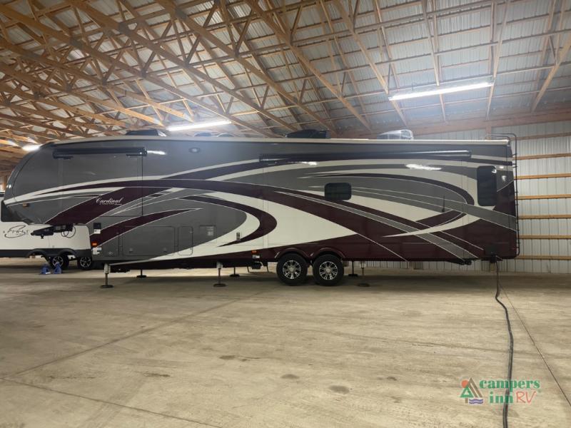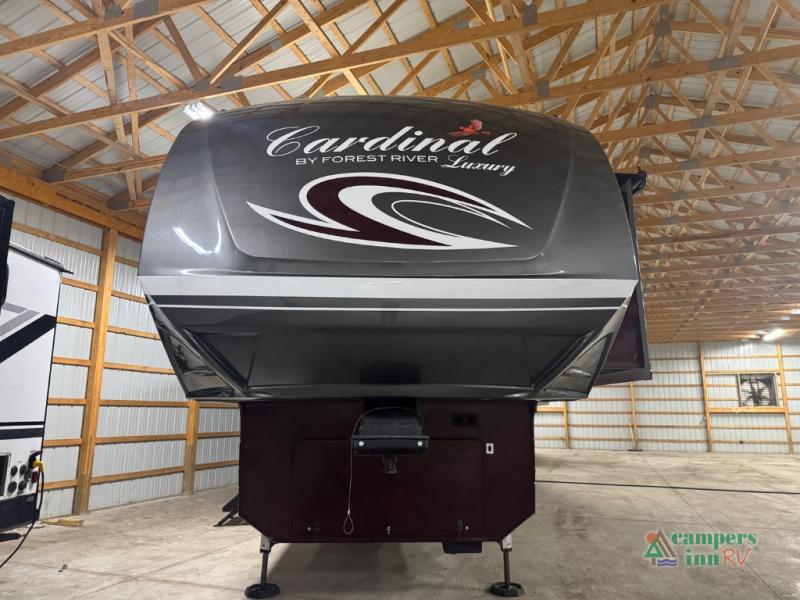 Forest River Cardinal Luxury 3456RLX fifth wheel highlights: Kitchen Island Double Vanity Sink Hide-A-Bed Sofa King Bed Hutch If you want a home away from home, then choose this Cardinal Luxury 3456RLX fifth wheel by Forest River! You will find true comforts throughout from the triple slide outs and the electric fireplace, to the 80" hide-a-bed sofa and the stainless steel residential refrigerator. Grab a drink and snack from the pantry and enjoy watching your favorite movie on the 50" LED TV at the entertainment center while relaxing on the cozy theater seating. Throughout this unit there is plenty of storage options between the hutch in the kitchen, a closet in the hallway, the linen closet in the bathroom, and the wardrobe, dresser, and closet in the front private bedroom, plus there are lots of overhead cabinets too. With the double vanity sinks, it is easier than ever to get ready for the day in the bathroom. At night, you can dive into the king-size Denver mattress and enjoy a great night's rest! In any Cardinal Luxury fifth wheel you will find comfort and conveniences both inside and out as these units were built with your enjoyment in mind. Each unit features an all welded aluminum super structure frame and includes an Alpha Super Flex II TPO roof. Each Cardinal Luxury model also has a wide body construction along with three to five slides to provide you with maximum space inside for 100% enjoyment with your family and friends. You will love the cathedral ceilings for added interior height, plenty of closets to keep all of your clothing, and beautiful Shaw lino throughout. You will also appreciate the at-home touches inside that give each unit a luxurious feel like the crown molding ceiling and cabinet trim, an electric fireplace, and pendant lighting in the kitchen area. The outside of each coach also has a high end look with its premium high-gloss gel coat fiberglass that you have the option of choosing in one of four full body paint color schemes!