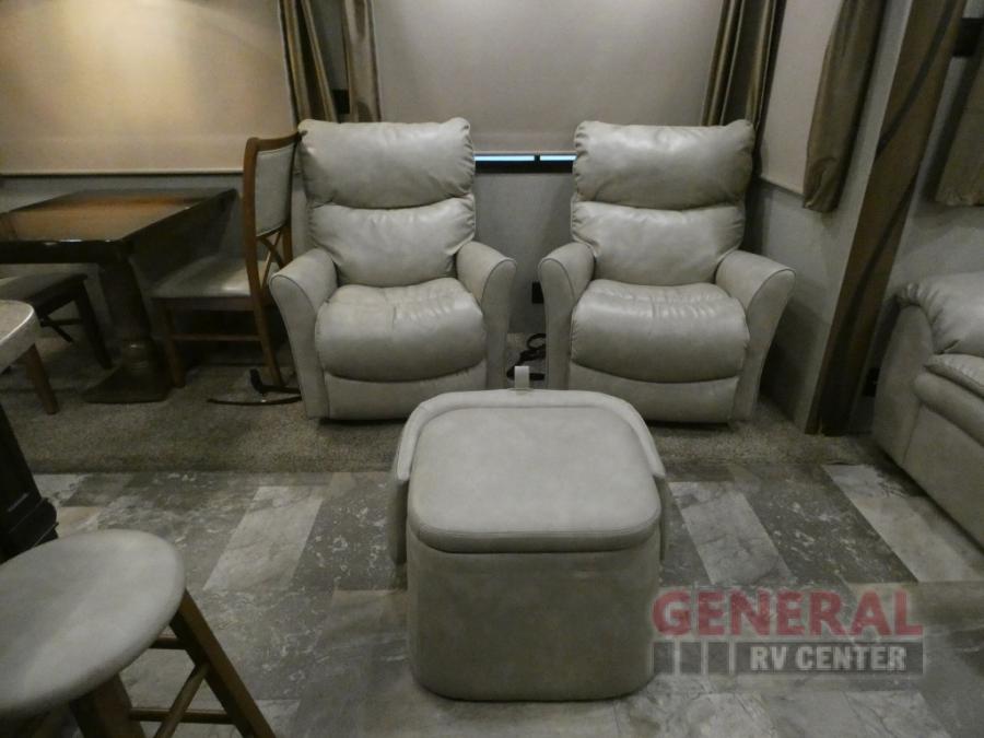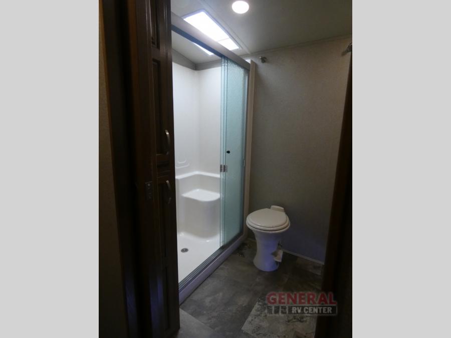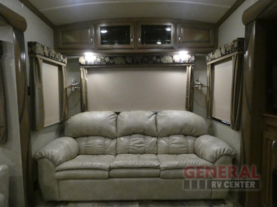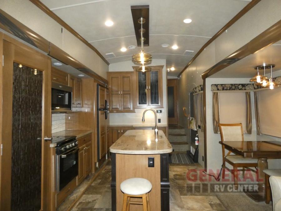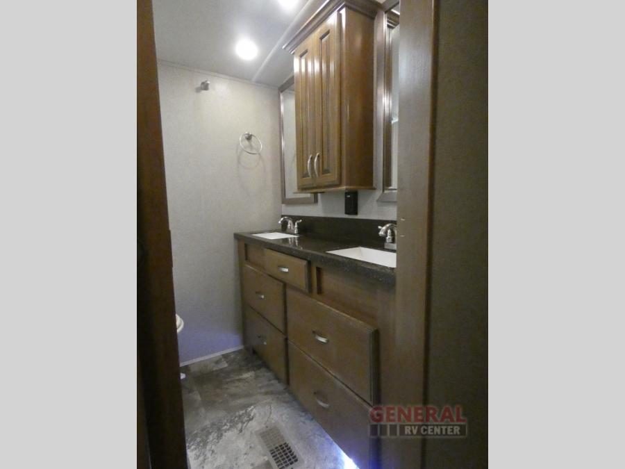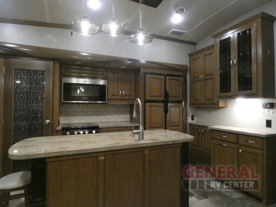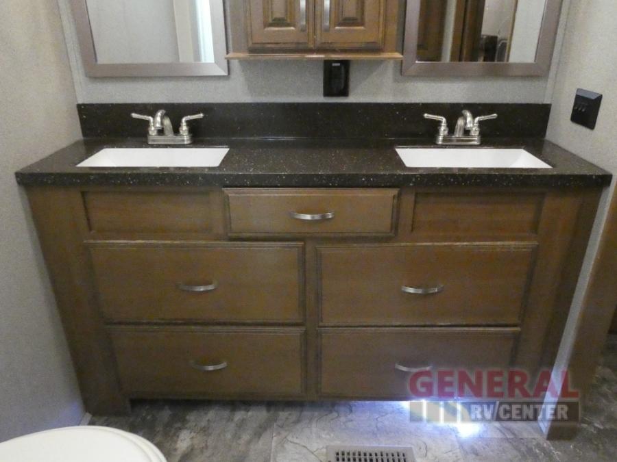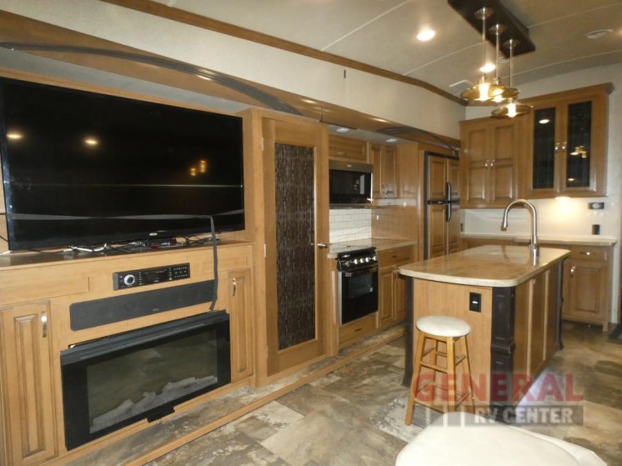 Imagine camping in your own fifth wheel at your favorite campground once a month or traveling to see new places. You don't have to leave any amenities behind when you have this model with you. In the kitchen there is plenty of work space to prepare meals when you aren't cooking over the campfire. Clean up is a breeze at the center island with the double sink. You will love the views out the panoramic window and while looking at the fireplace underneath the 50" LED TV. When you are ready to call it a day, then head up the steps to the full bathroom with Jack and Jill sinks including a full wall, back-lit mirror to the private front bedroom. The Denver king bed, and storage in the large wardrobe and a dresser should accommodate all your needs.
