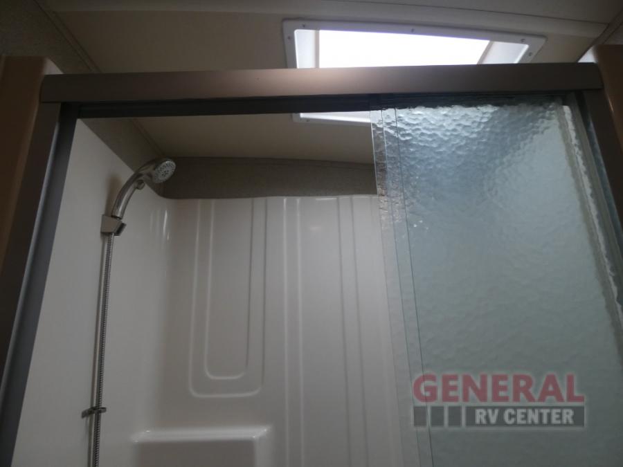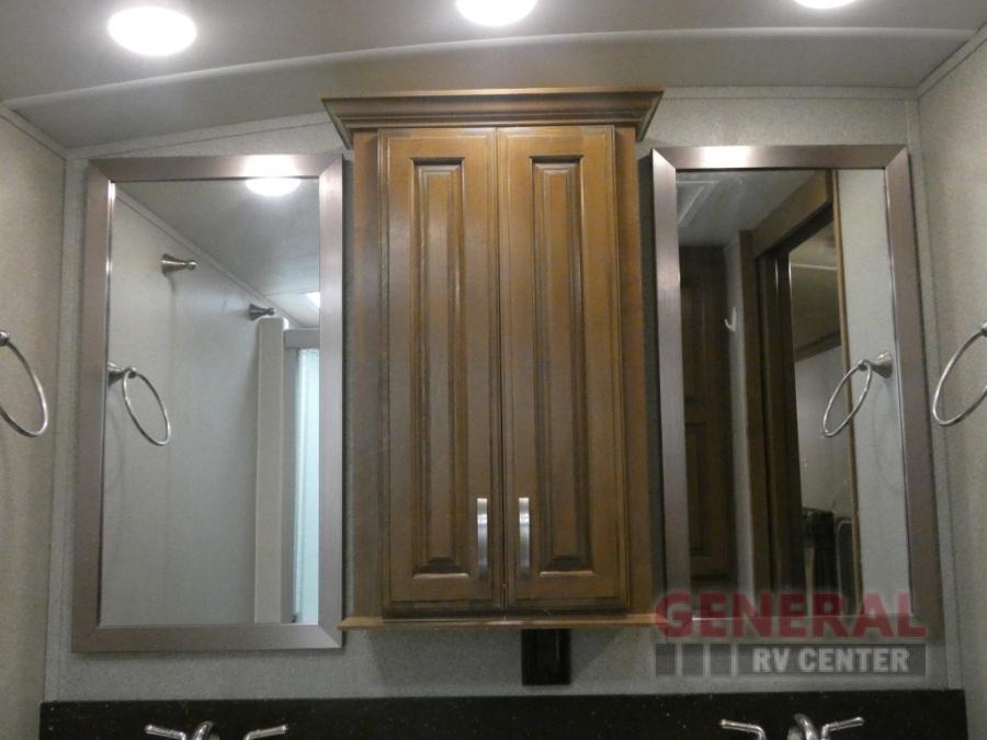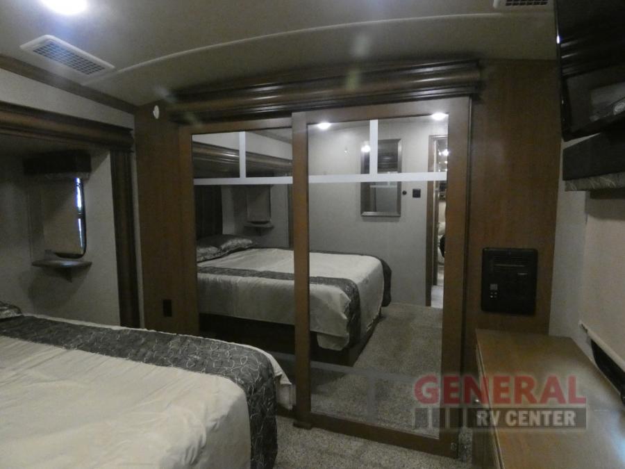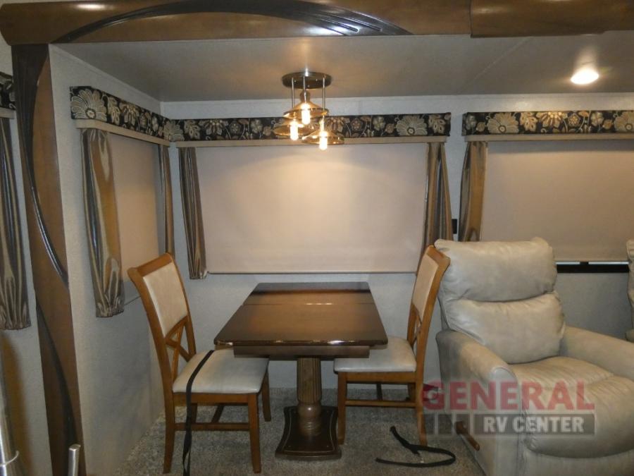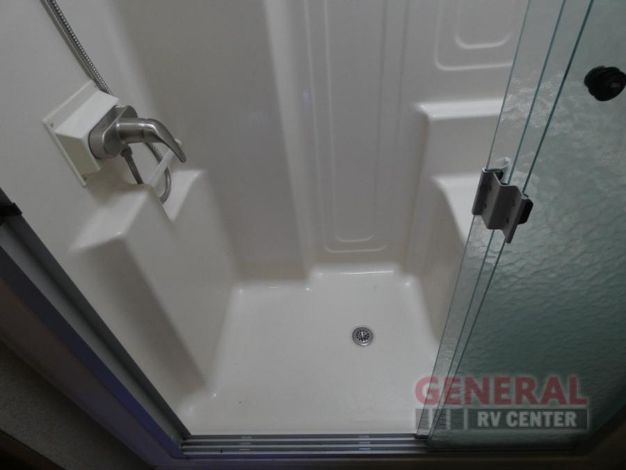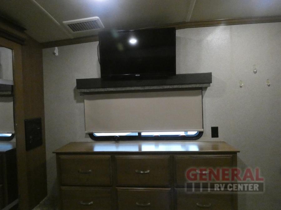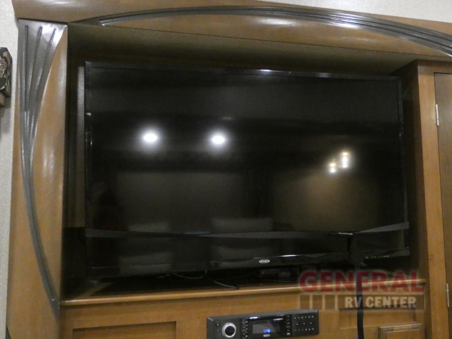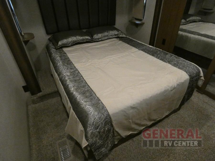 Imagine camping in your own fifth wheel at your favorite campground once a month or traveling to see new places. You don't have to leave any amenities behind when you have this model with you. In the kitchen there is plenty of work space to prepare meals when you aren't cooking over the campfire. Clean up is a breeze at the center island with the double sink. You will love the views out the panoramic window and while looking at the fireplace underneath the 50" LED TV. When you are ready to call it a day, then head up the steps to the full bathroom with Jack and Jill sinks including a full wall, back-lit mirror to the private front bedroom. The Denver king bed, and storage in the large wardrobe and a dresser should accommodate all your needs.