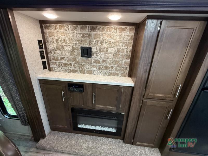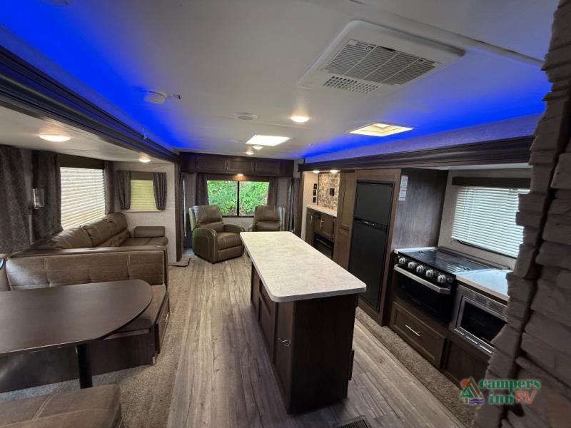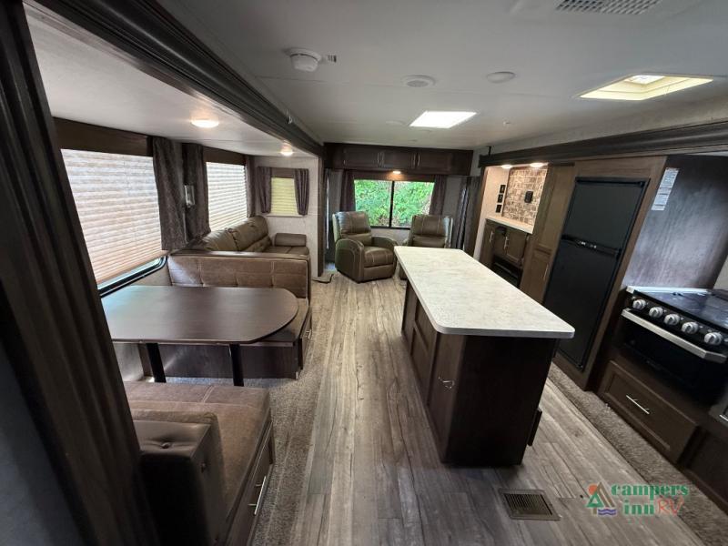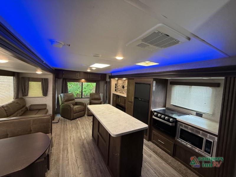 Spacious Living Area: The Cherokee 304R is designed with family-friendly layouts, offering a large living area with a comfortable sofa and an entertainment center with a flat-screen TV and sound system. The slide-out design increases the interior space, making it feel even more open.