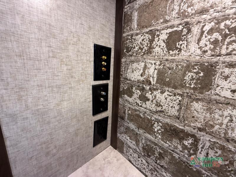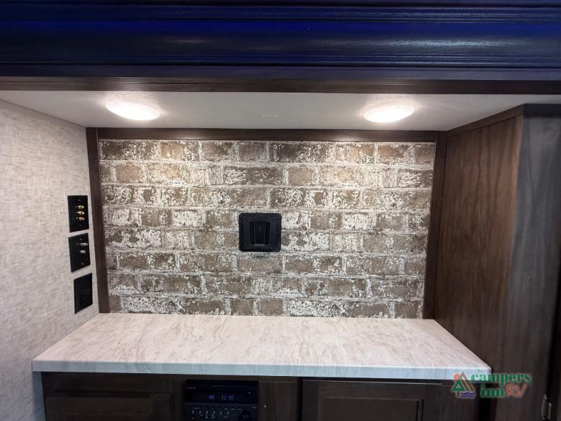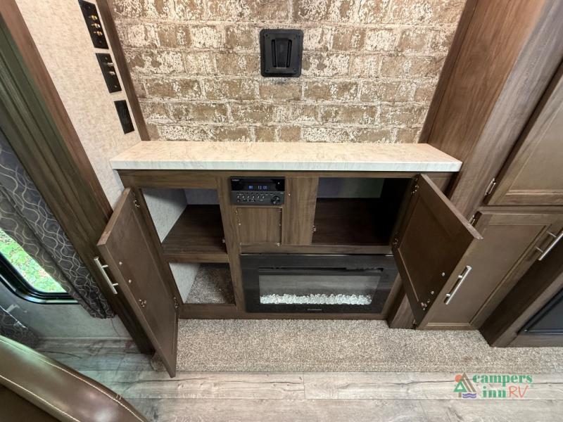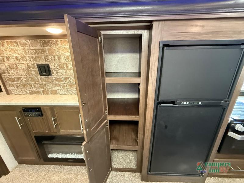Outdoor Kitchen and Entertainment: The Cherokee 304R includes an outdoor kitchen with a grill and refrigerator, perfect for cooking meals outdoors. Additionally, the trailer is equipped with an exterior entertainment setup, ideal for relaxing under the stars.