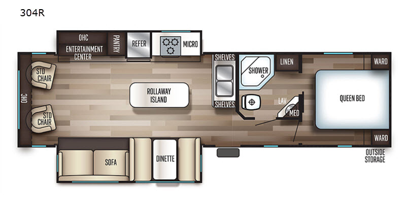 Ample Storage: With numerous cabinets, drawers, and exterior compartments, the Cherokee 304BR offers abundant storage space for all your gear, clothes, and other travel necessities.