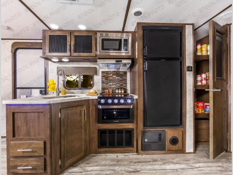 Enjoy the freedom of home-cooked meals on the road. The fully equipped indoor kitchen features a three-burner cooktop, oven, microwave, double-door refrigerator, and large pantry for all your essentials. Need to take dinner outside? Fire up the outdoor kitchen and cook under the stars—perfect for summer evenings and tailgating fun.