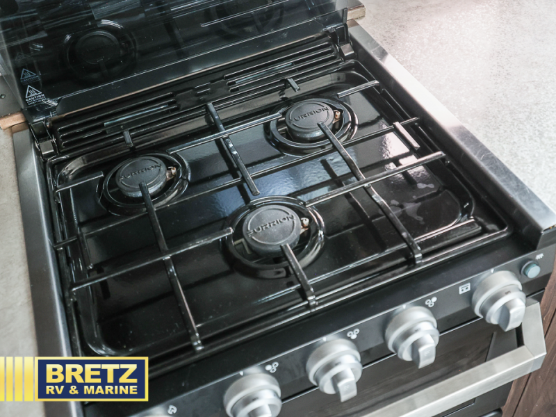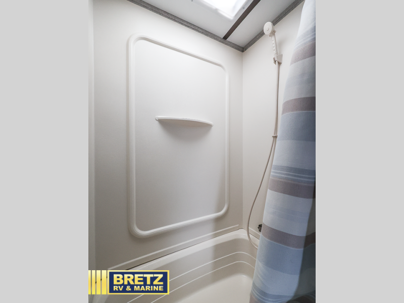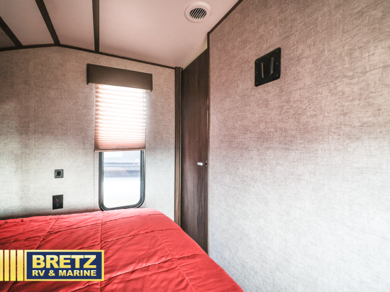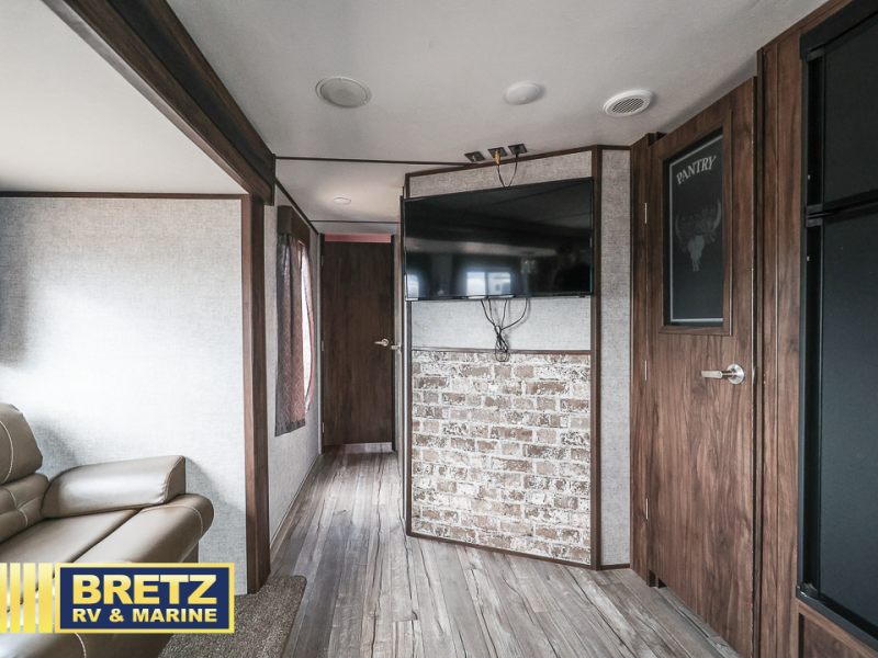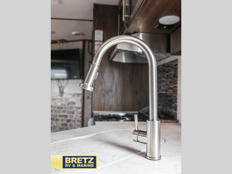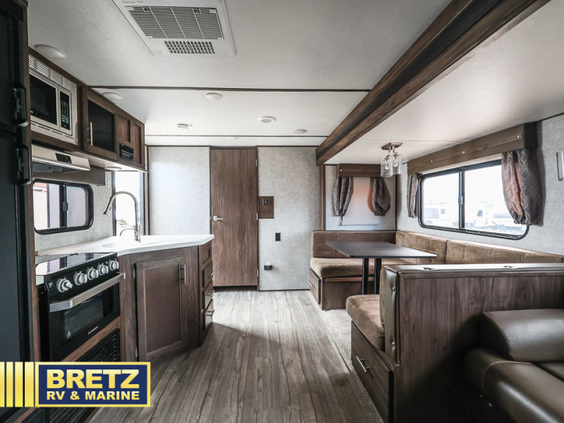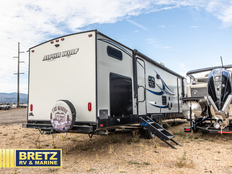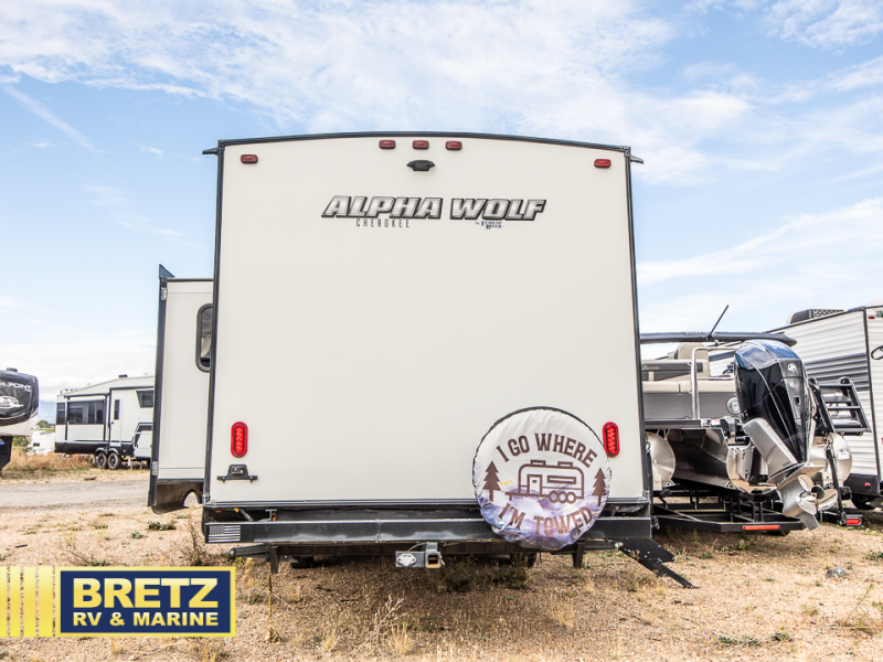 The Cherokee Alpha Wolf travel trailer is the first of Cherokee's line up to be fully laminated, which makes them lightweight, well insulated, and able to provide a sleek and modern exterior. The tire pressure monitoring system and exterior shower with hot and cold water add to the usefulness and value of the Alpha Wolf, and the LED lighting on both the exterior and interior delivers a bright and cheerful atmosphere no matter what time of day it is. Inside of the Alpha Wolf you will find stainless steel appliances in the kitchen and plenty of storage for your pots and pans underneath the sink.