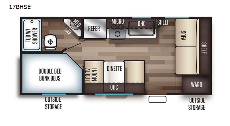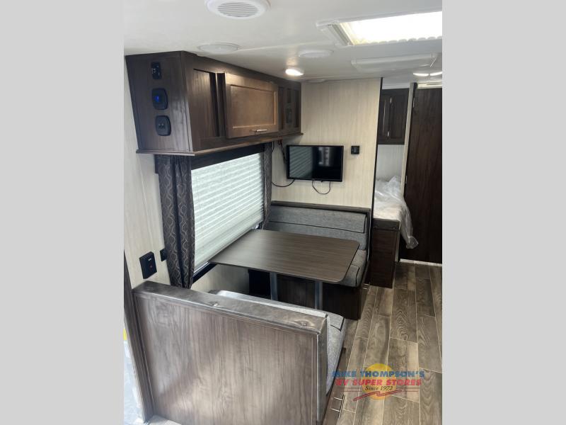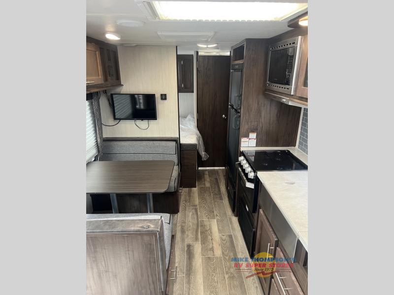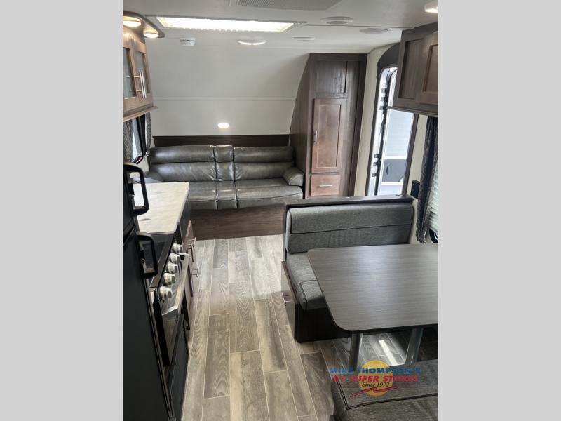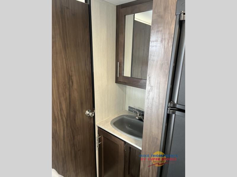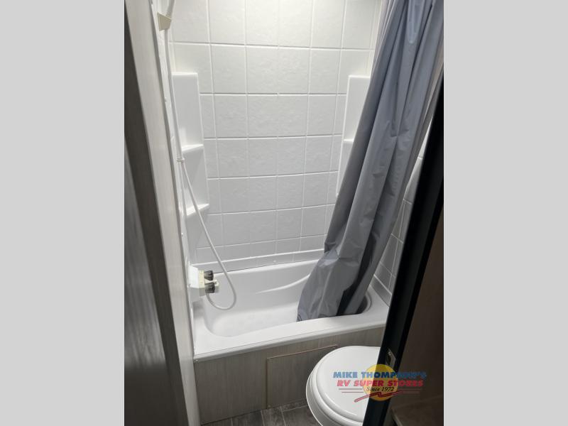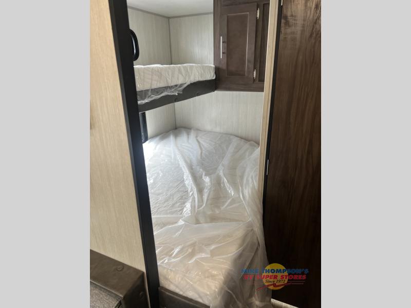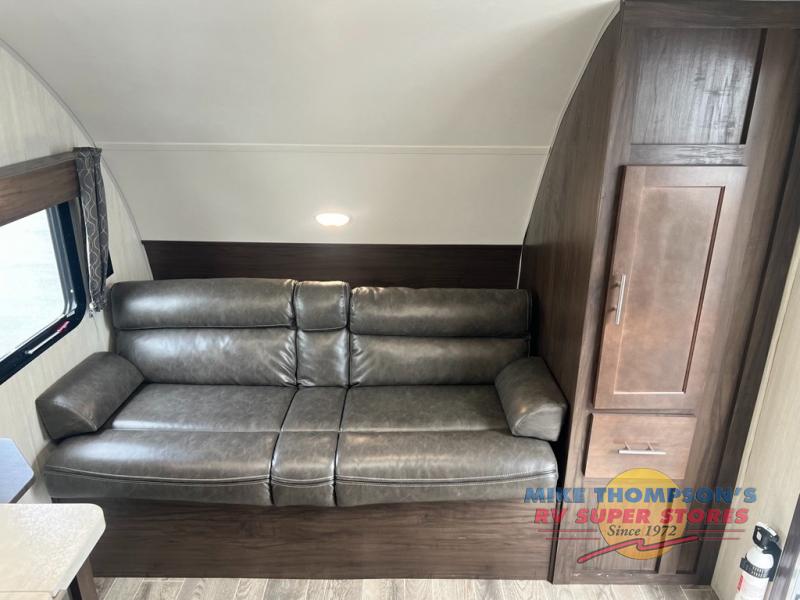 This Cherokee Grey Wolf travel trailer allows your small family to easily camp and enjoy the outdoors. At night the double-size bunks will be a welcome space for up to four tired campers. The booth dinette and the sofa can also be used as sleeping space for added family or friends when needed. You will appreciate the rear corner bath which features a tub/shower, a toilet, a sink, and a medicine cabinet to keep your toiletries organized and handy. Overhead cabinets throughout provide plenty of storage, plus there are both front and rear outdoor storage compartments!