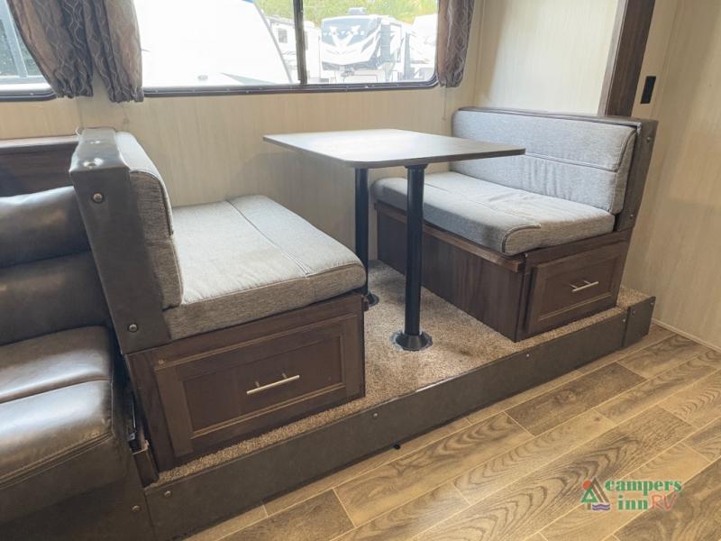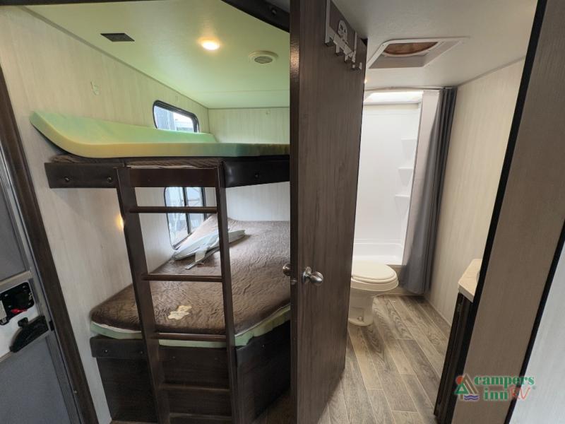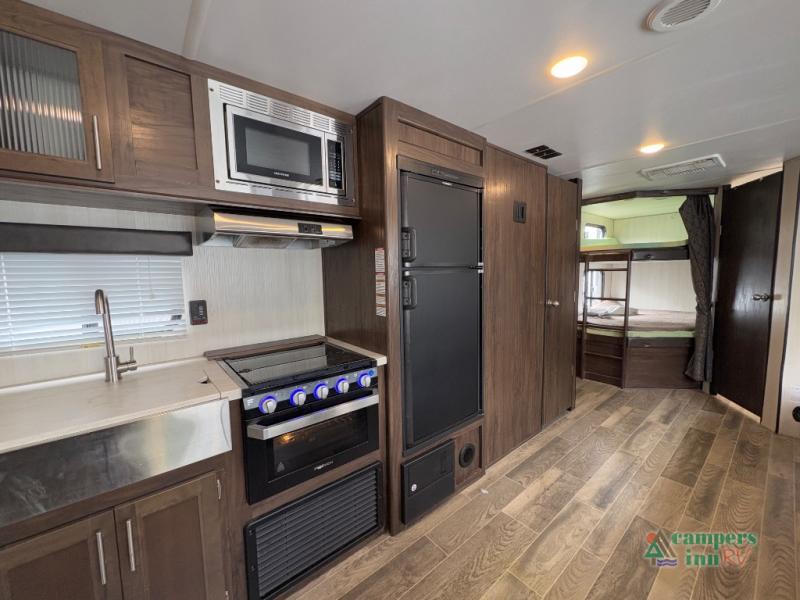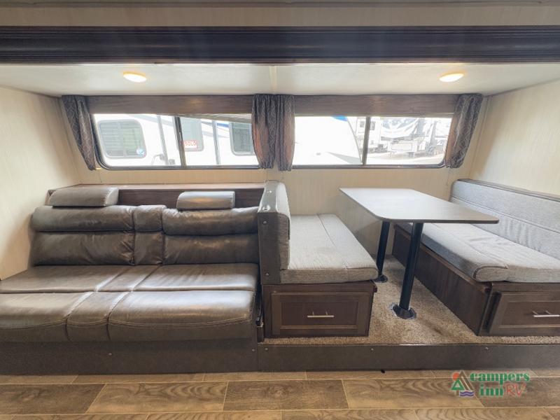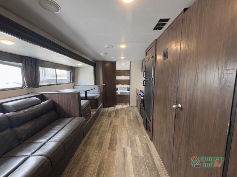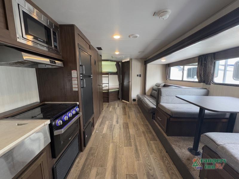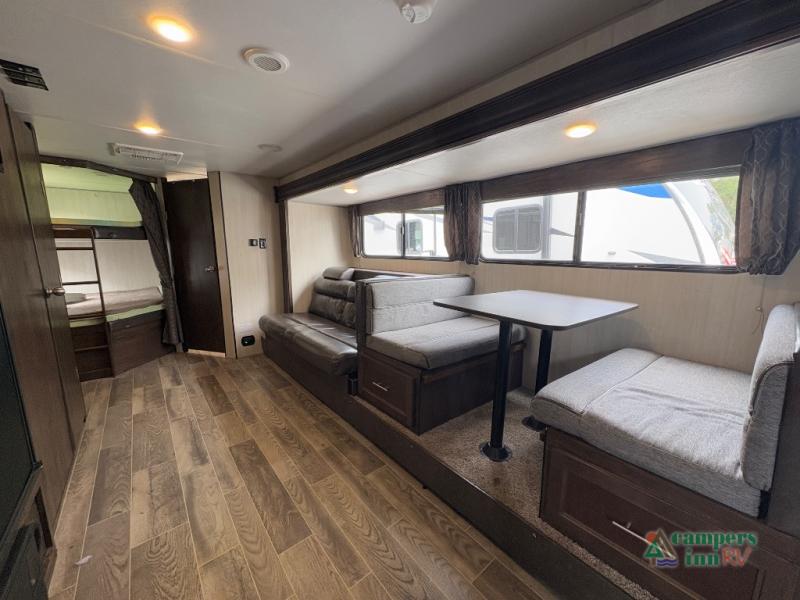 This Cherokee Grey Wolf travel trailer is bright and cheery and ready to party! You can enjoy your view while seated at the booth dinette or the sofa with a hidden bunk above it in the living area. A walk-in pantry is located just inside the entry door so that you can easily stock up on your favorite snacks and dry goods for your adventure. At night, you will find sleeping spaces for ten when you use the sofa, booth dinette, double-size bunks, and front queen bed. Add some privacy in the bunk area, as well as up front, by closing the curtains around you. This will easily section off the front bed area for sleeping and create a private dressing area too.