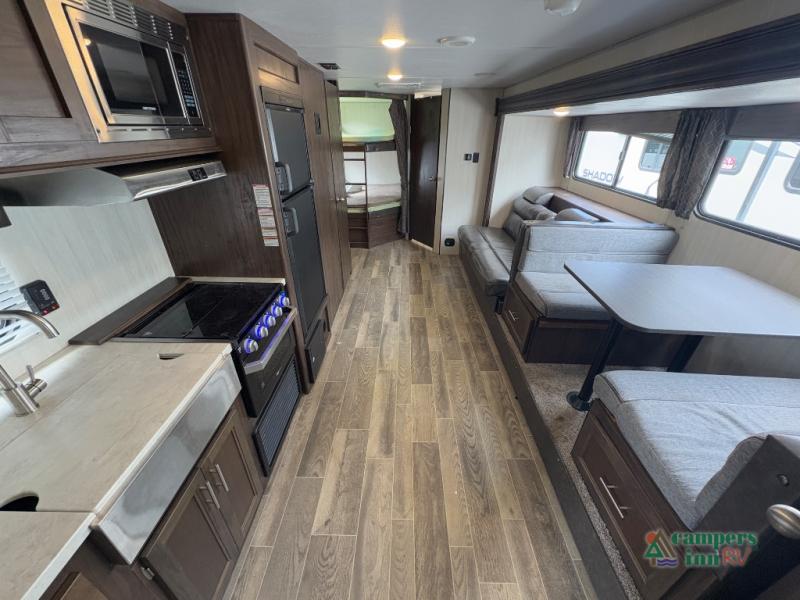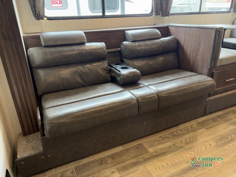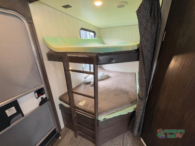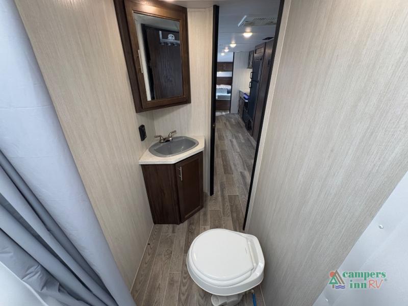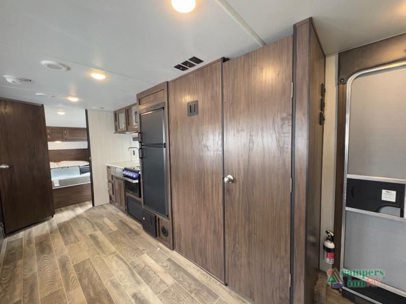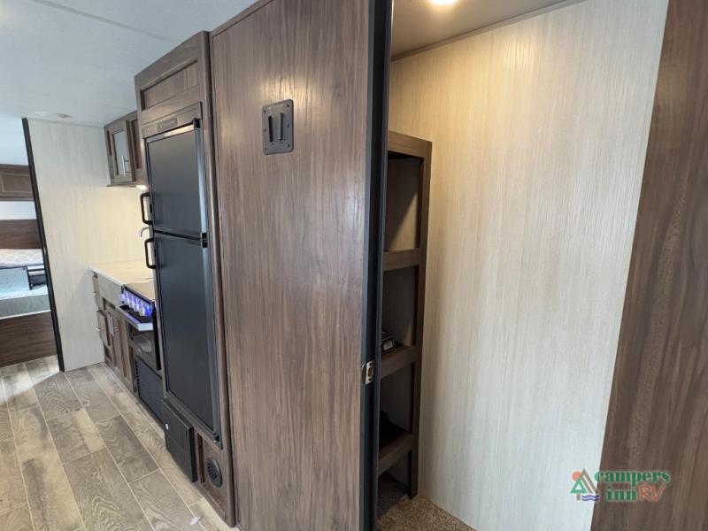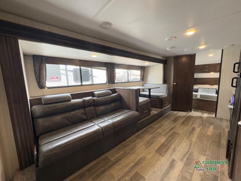 This Cherokee Grey Wolf travel trailer is bright and cheery and ready to party! You can enjoy your view while seated at the booth dinette or the sofa with a hidden bunk above it in the living area. A walk-in pantry is located just inside the entry door so that you can easily stock up on your favorite snacks and dry goods for your adventure. At night, you will find sleeping spaces for ten when you use the sofa, booth dinette, double-size bunks, and front queen bed. Add some privacy in the bunk area, as well as up front, by closing the curtains around you. This will easily section off the front bed area for sleeping and create a private dressing area too.