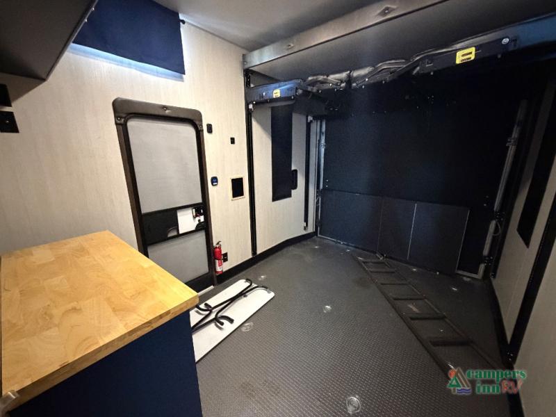 Load up your family, your gear, and your off-road toys in this versatile 12' separate garage and head out for a weekend packed with fun. The garage features a Happijac power bunk, dual sofa beds, and a convenient second entry door. A patio door separates the garage from the main living area, helping keep noise and dirt where they belong.