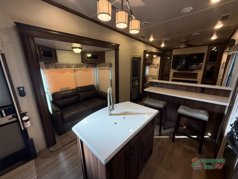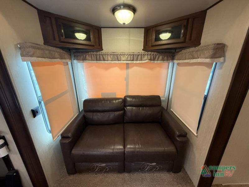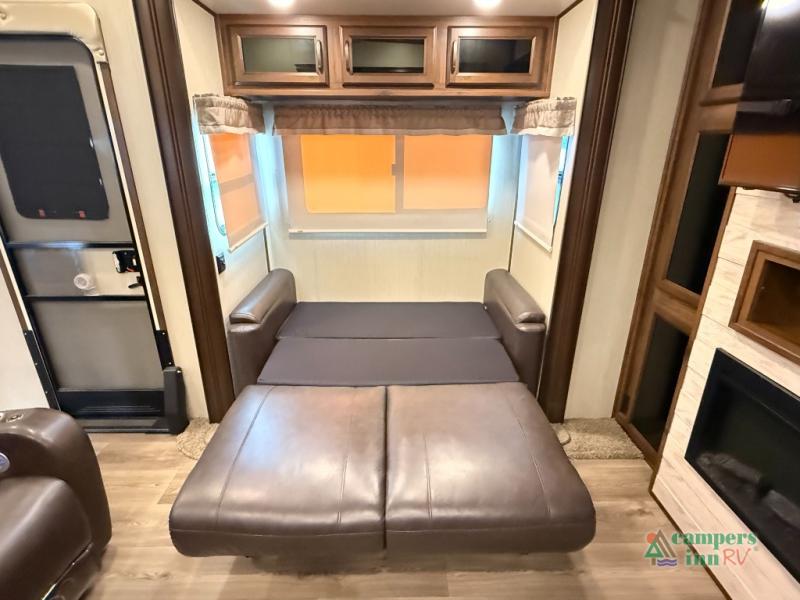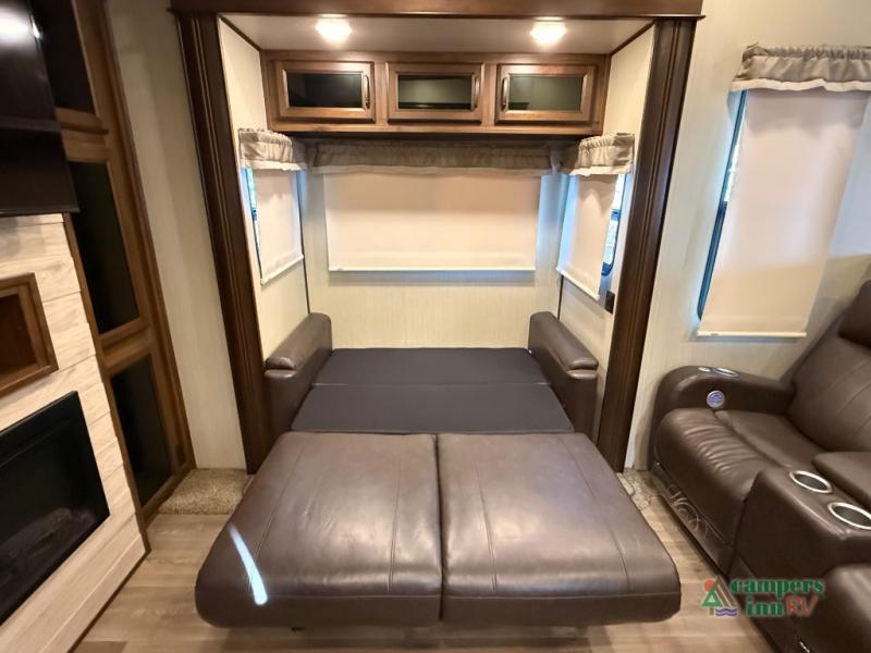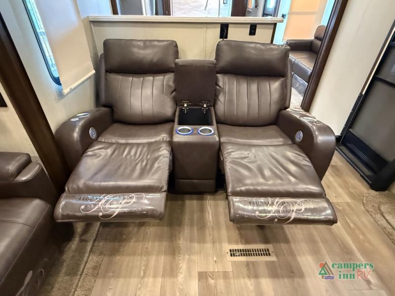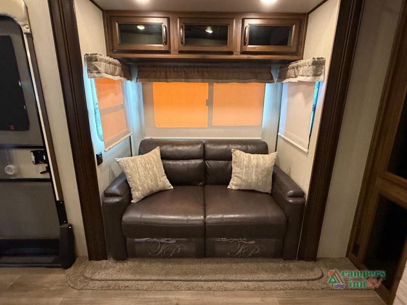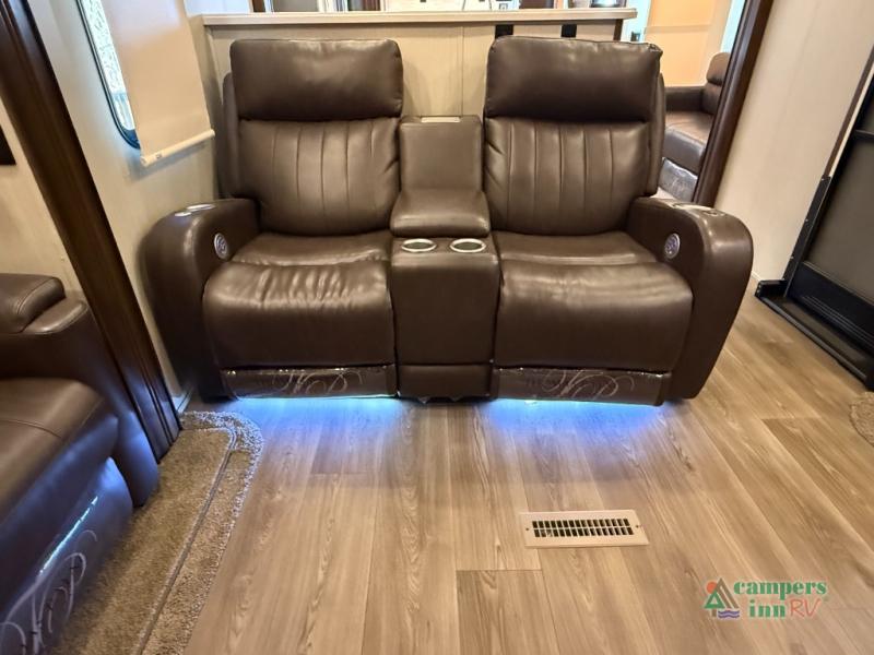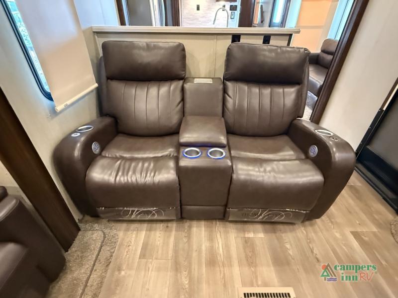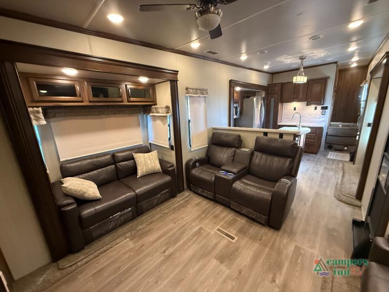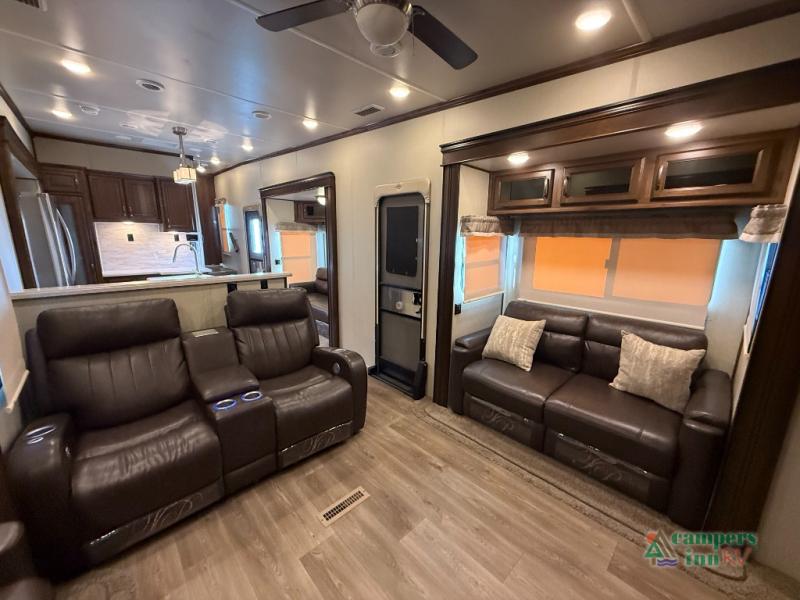 Multiple seating options: theater seating, sofas, bar tops with stools.