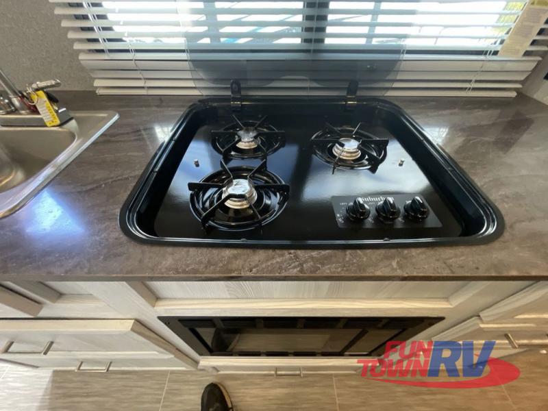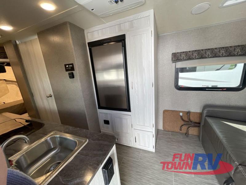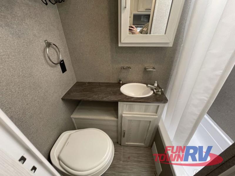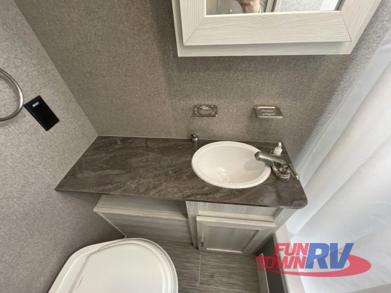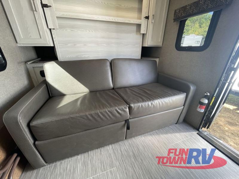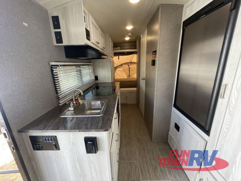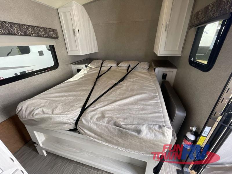 Ready, set, camp! For the camping enthusiast this Flagstaff E-Pro travel trailer is ideal for you and your family! You get to choose if you want to sit on the sofa or sleep on the Murphy bed whenever you like. You also have a queen bed in the rear for the kids or extra guests. The rear full bath allows you to wash up after a fun day outdoors without having to use the campsite facilities. You can cook inside on the recessed cooktop with flush-mount cover and in the microwave or outside on the gas grill. You also have plenty of storage options with the kitchen pantry, linen/wardrobe across from the bath, dual wardrobes in the front, and the exterior storage.