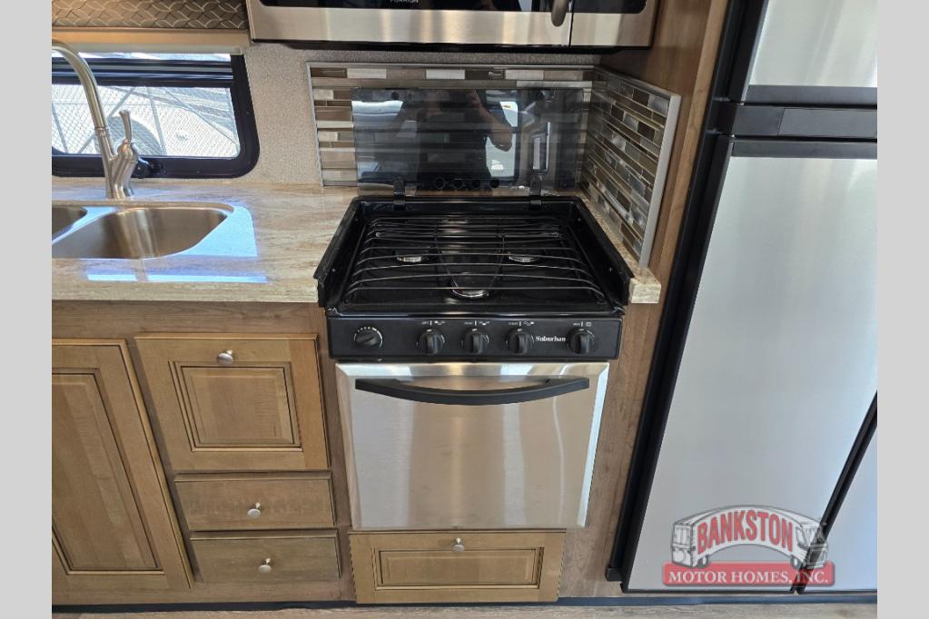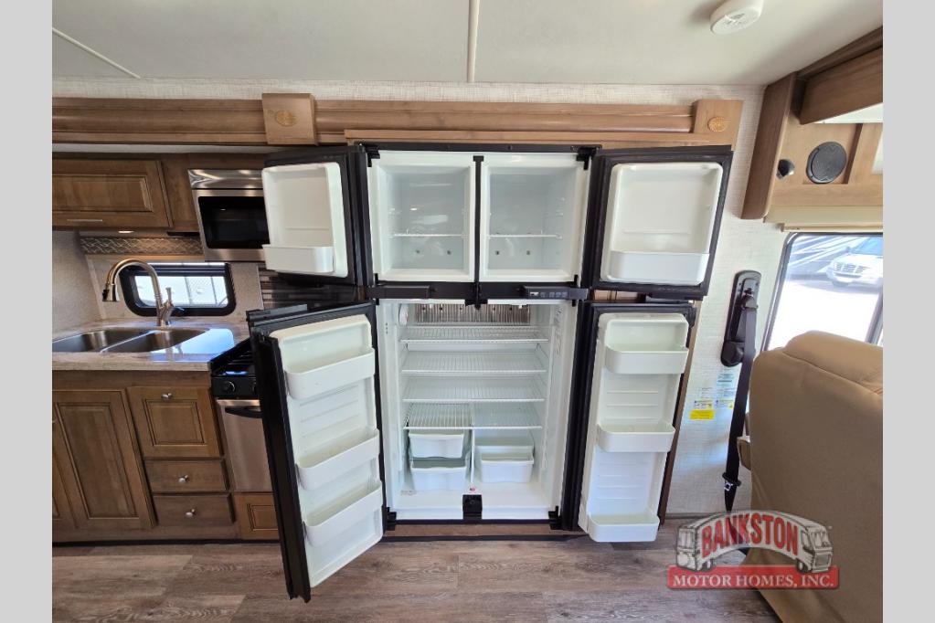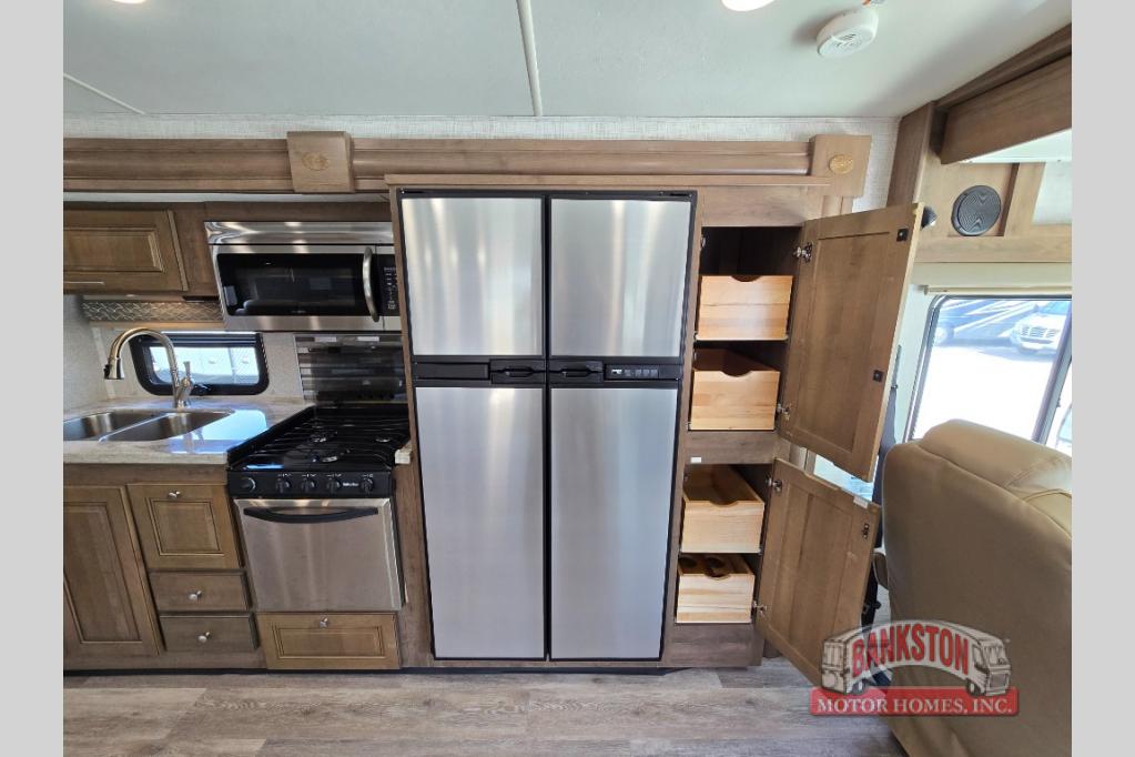 For comfort and style you will want a Forest River Georgetown 5 Series class A gas motorhome. Along the exterior there is a "Super Storage" rear cargo compartment, an outside shower, as well as a stylish fiberglass front cap with a lighted logo, LED accent lights, and an automotive bonded front windshield. As you step inside, be prepared to be wowed with all of the at-home convenient features such as the stainless steel three-burner cooktop with oven, the two LED TVs, and the King Jack™ digital TV antenna with a mount and built-in signal meter. In the cockpit there is a custom dash with ABS side consoles, drink holders, and a 110V outlet/USB. You will also enjoy the convenience of the MyRV touchscreen with wireless technology.