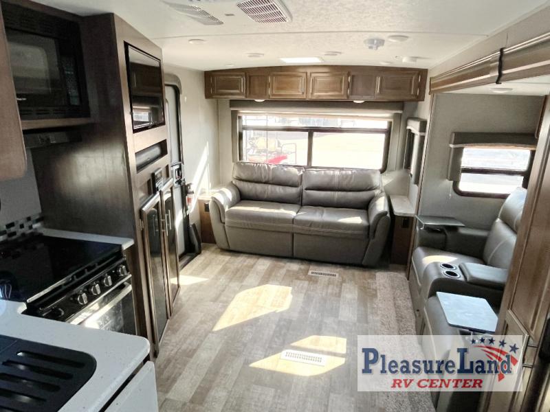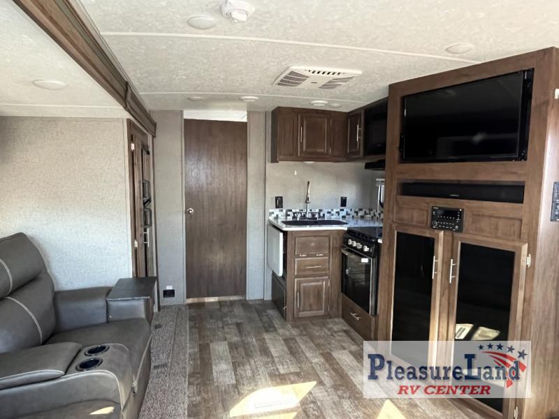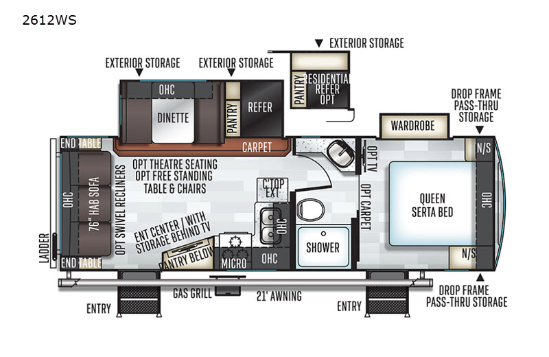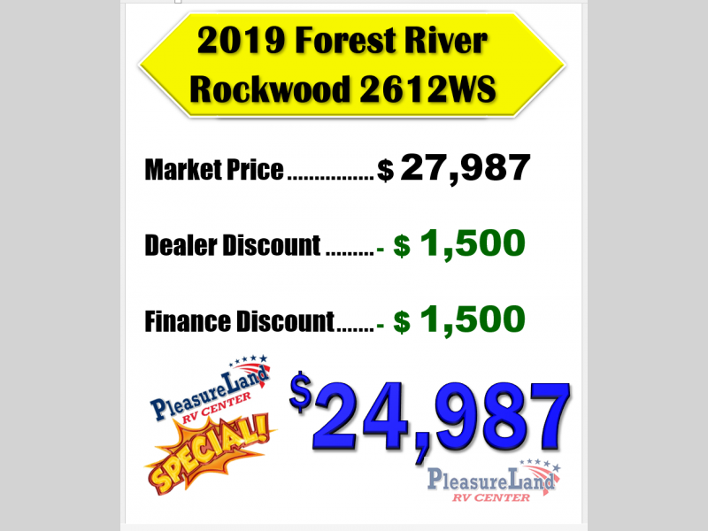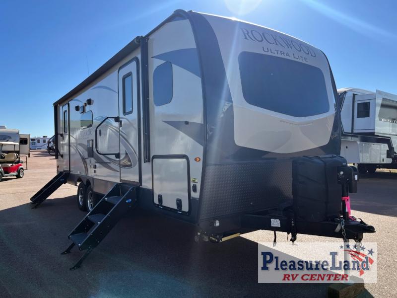 Enjoy being in the great outdoors with this Forest River Rockwood Ultra Lite travel trailer model 2612WS. Open up the 21' power awning with LED lights and stay out all day or night, and when it's raining you can still stay dry while you enjoying the cool rain with a hot cup of coffee. You will appreciate the secret storage behind the TV and the pantry below for storing your goodies, there is also a second pantry next to the gas/electric large refrigerator where you can keep your perishables nice and fresh. The double entry doors make for a smooth flow of traffic in and out of the unit, and one of the doors conveniently opens into the front private bedroom where you can enjoy a good night's rest on the queen Serta bed. You can also take a relaxing nap on the 76" hide-a-bed sofa, or eat a meal in the booth dinette, the choices are endless!